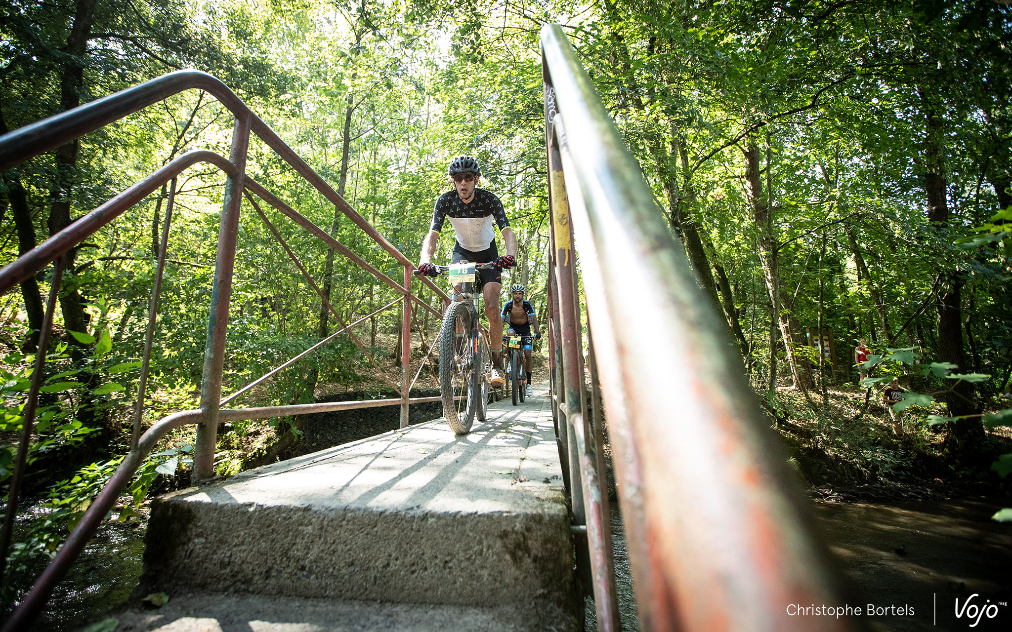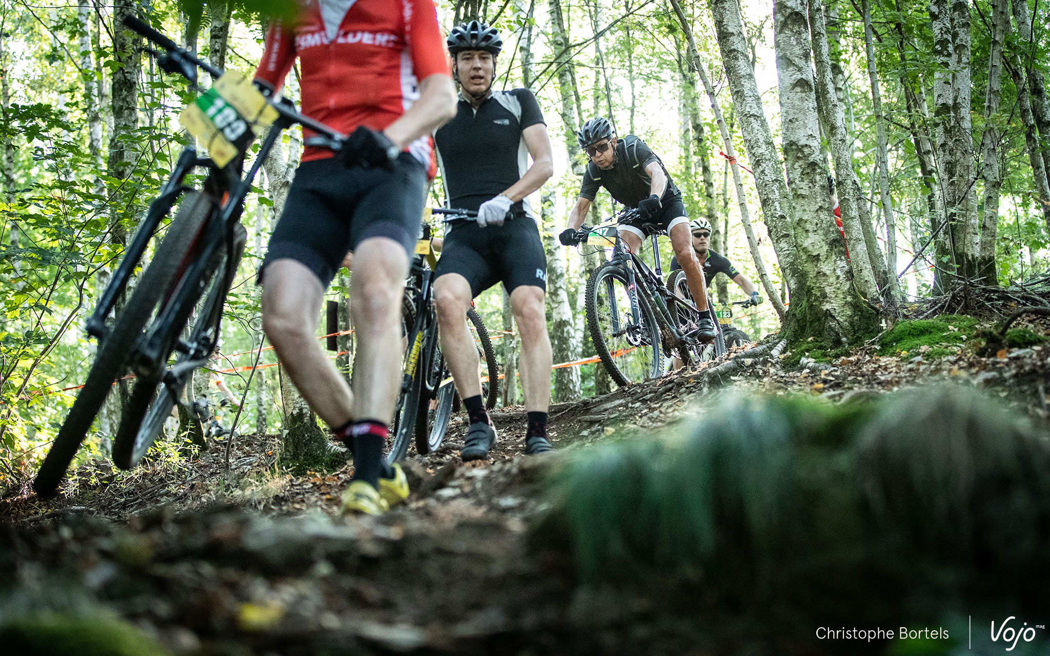 Après quelques kilomètres seulement, le parcours passe par les célèbres singletracks du parcours de coupe du monde d’Houffalize. Nous avons loupé les hommes de tête, passés depuis un moment déjà, mais c’est l’occasion de constater que, si certains se lancent sans trop de problèmes dans les portions techniques, d’autres préfèrent passer à pied.