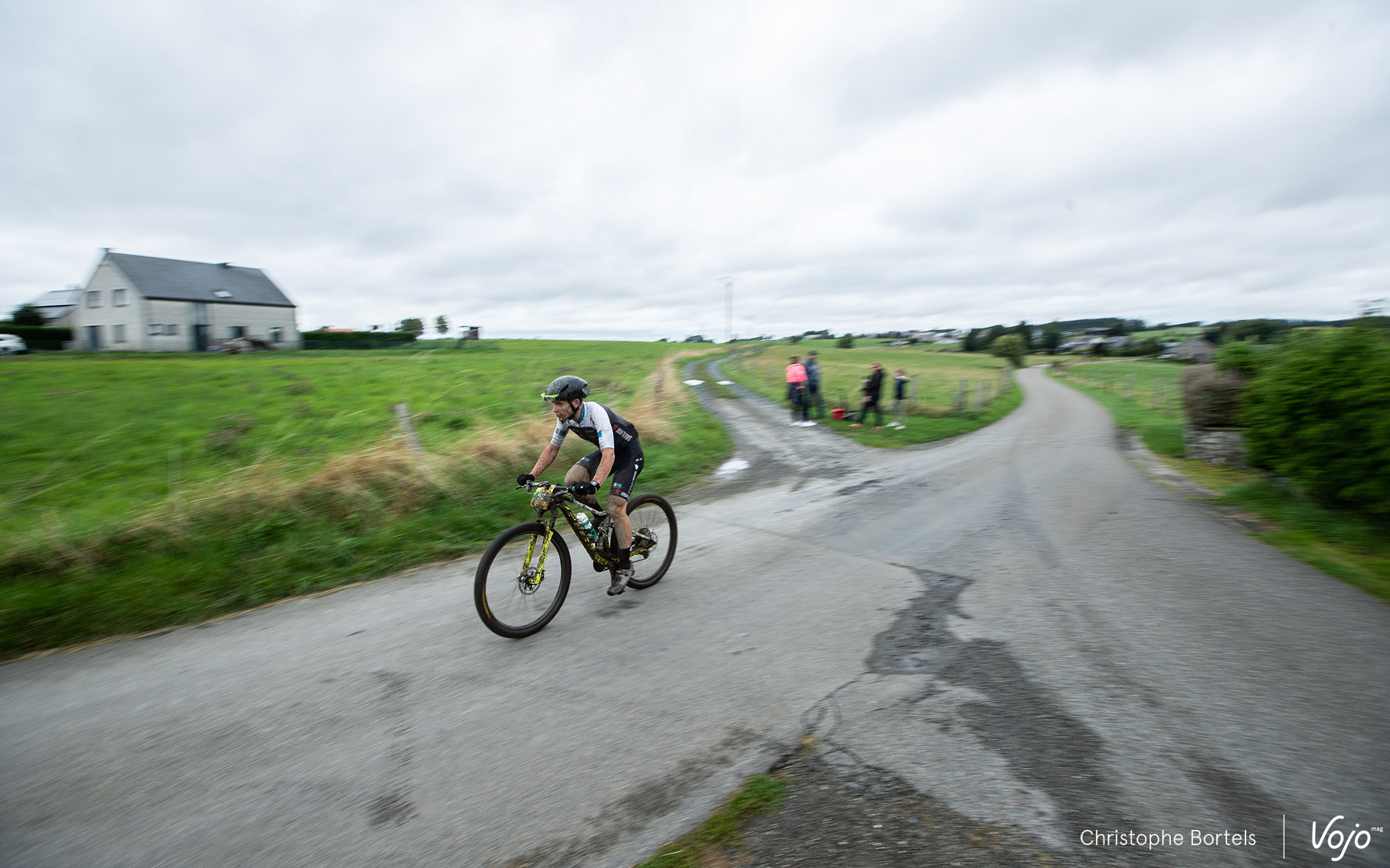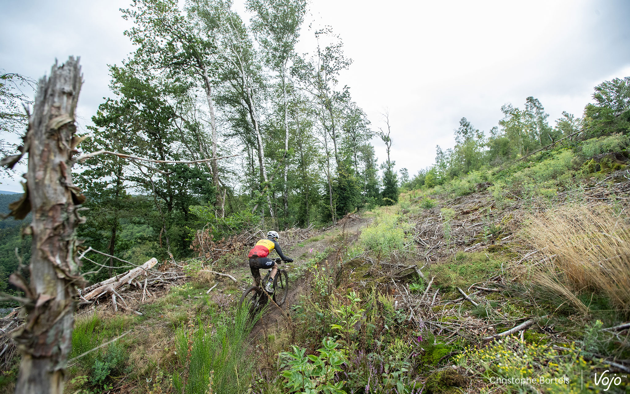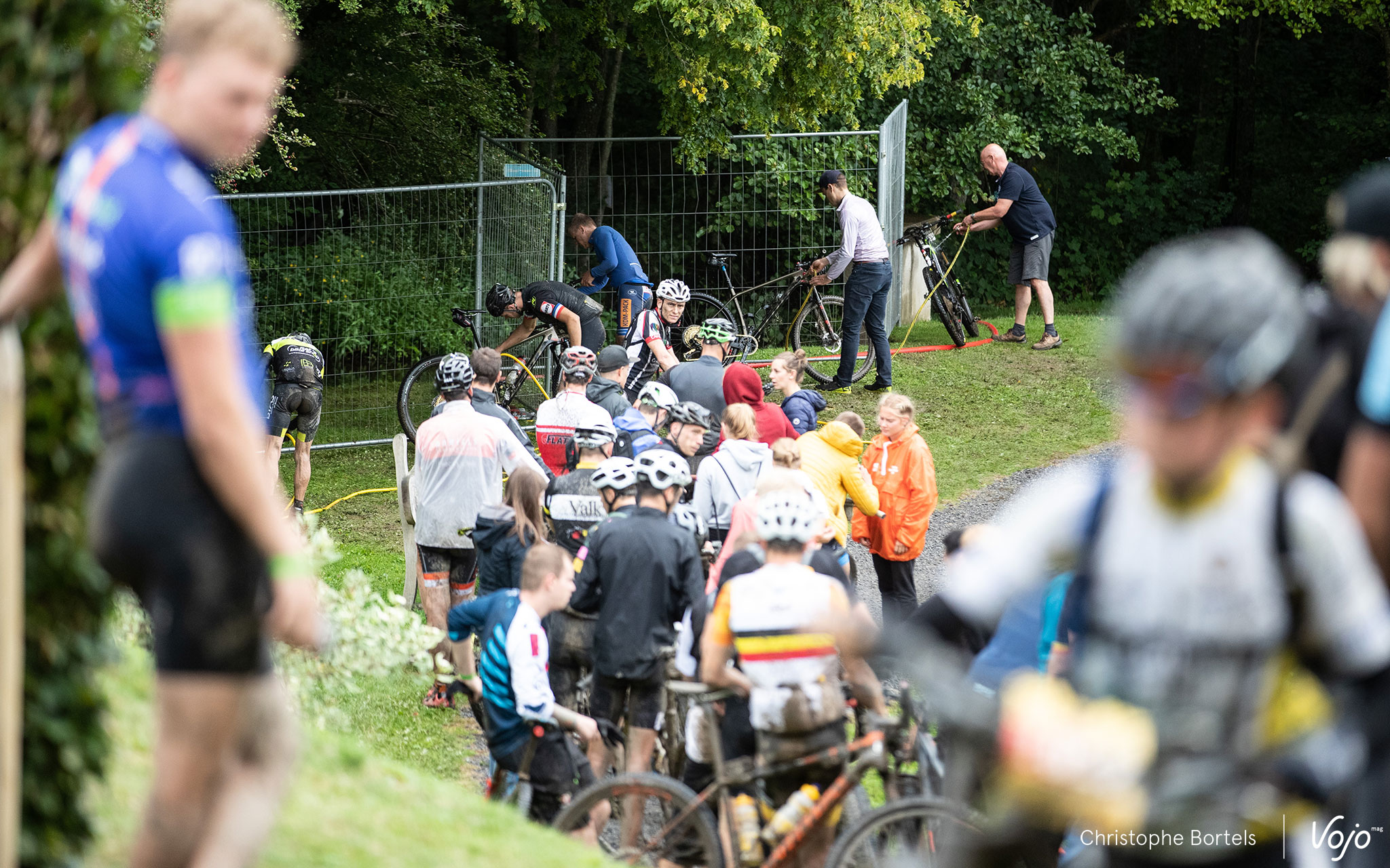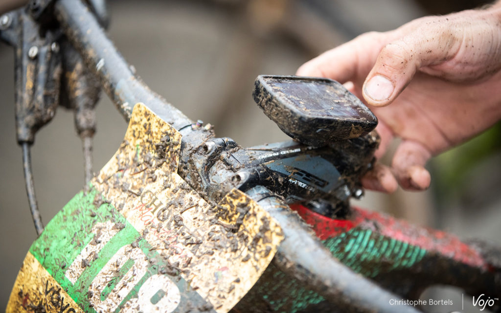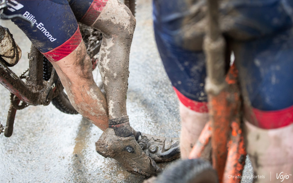 Comme souvent dans la première descente technique vers Houffalize, ça glisse, ça court, ça bouchonne, encore plus sur un terrain bien gras.