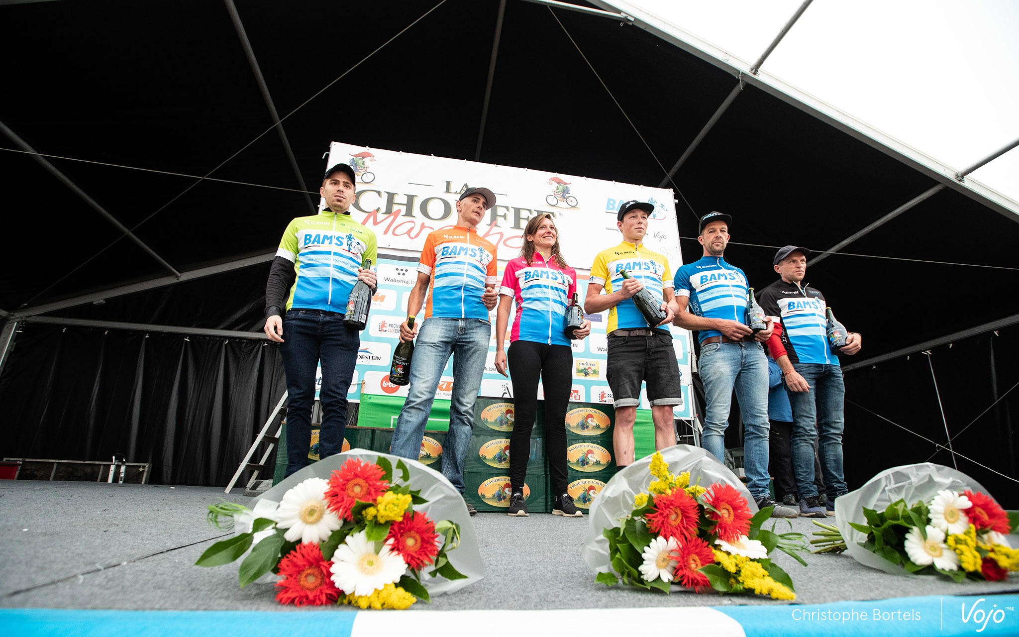 Les leaders du classement BAMS après cette 6e étape de la série : de gauche à droite, Maxime Harlez (Espoirs), qui s’est d’ailleurs imposé dans sa catégorie ce dimanche grâce à une 31e place au scratch, Joris Massaer (Master 1), Helena Plasschaert (Dames), Tijs Huygen (Elite), Michel Meysman (Master 2) et Bob Hannes (Master 3), lui aussi victorieux dans sa catégorie.