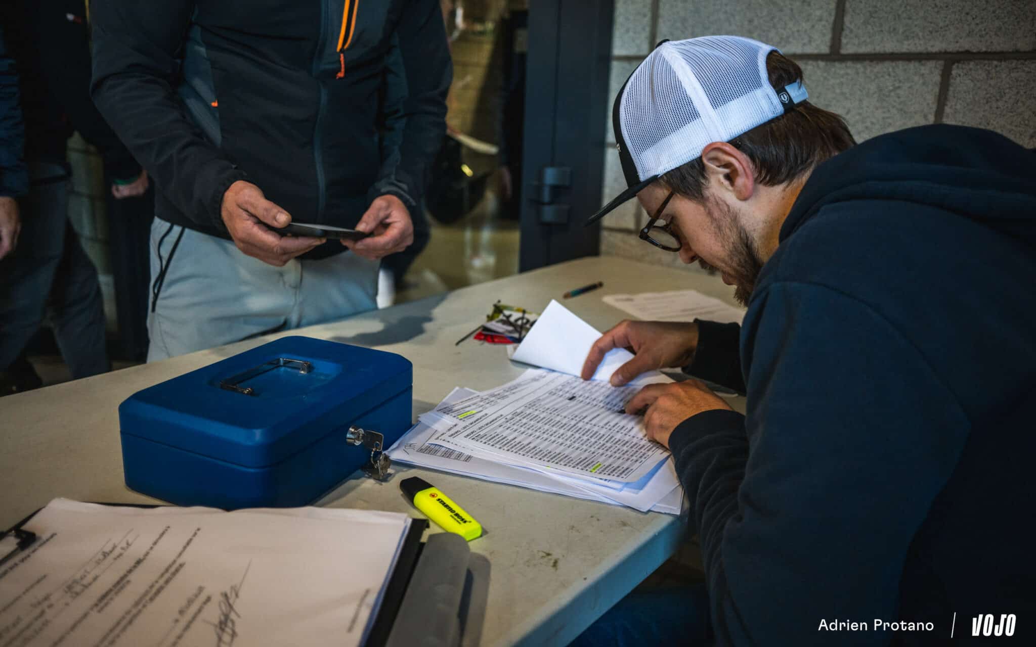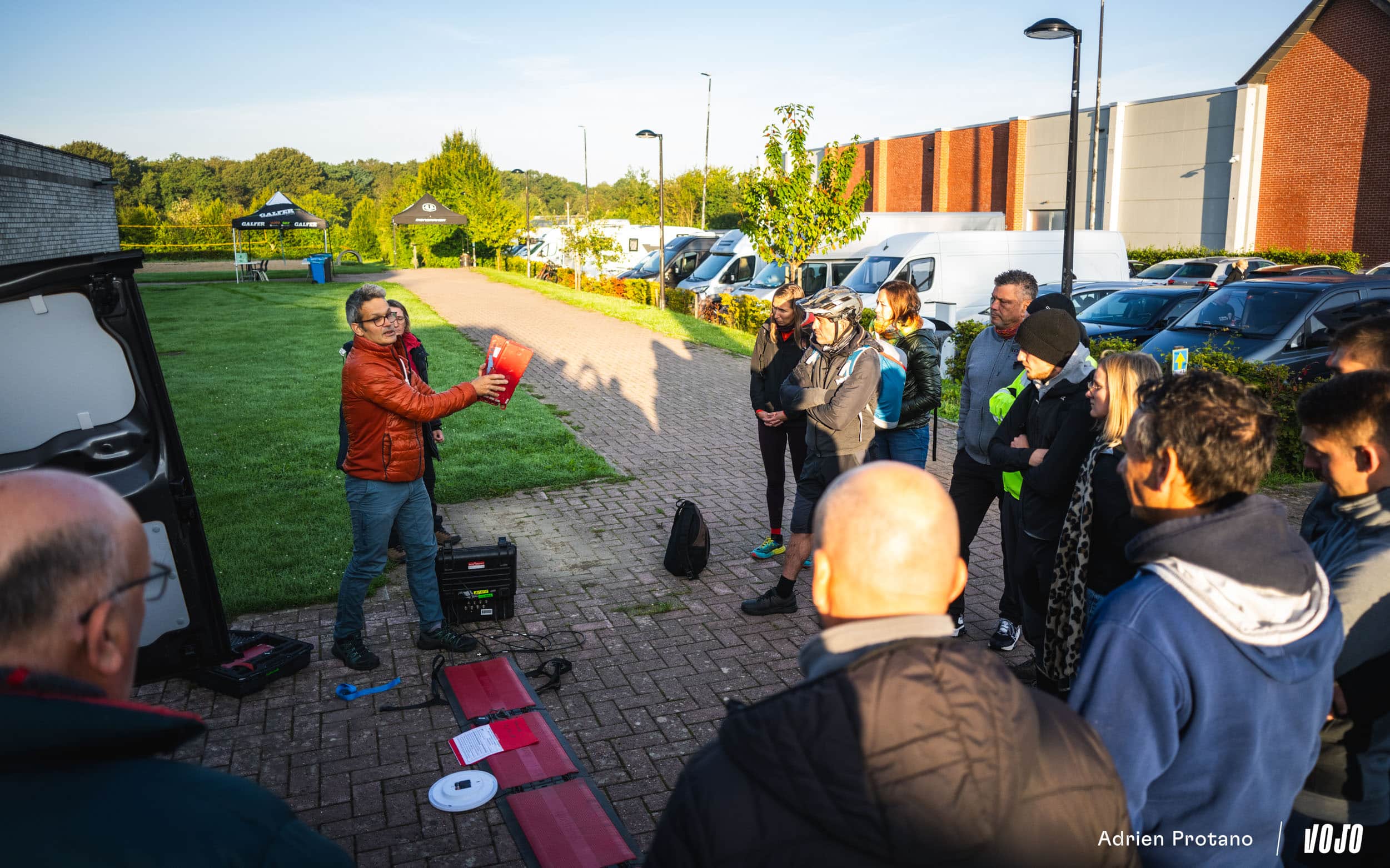 En sortant du hall sportif où se tenait la partie administrative des inscriptions, on tombe nez à nez avec Matthieu Schaffauser de chez M-Chrono, responsable du chronométrage de toutes les manches de la Belgian Enduro Cup, et en plein briefing des bénévoles qui seront postés aux départs et arrivées des spéciales du jour. Une épreuve enduro réussie, cela passe par un chronométrage fiable !