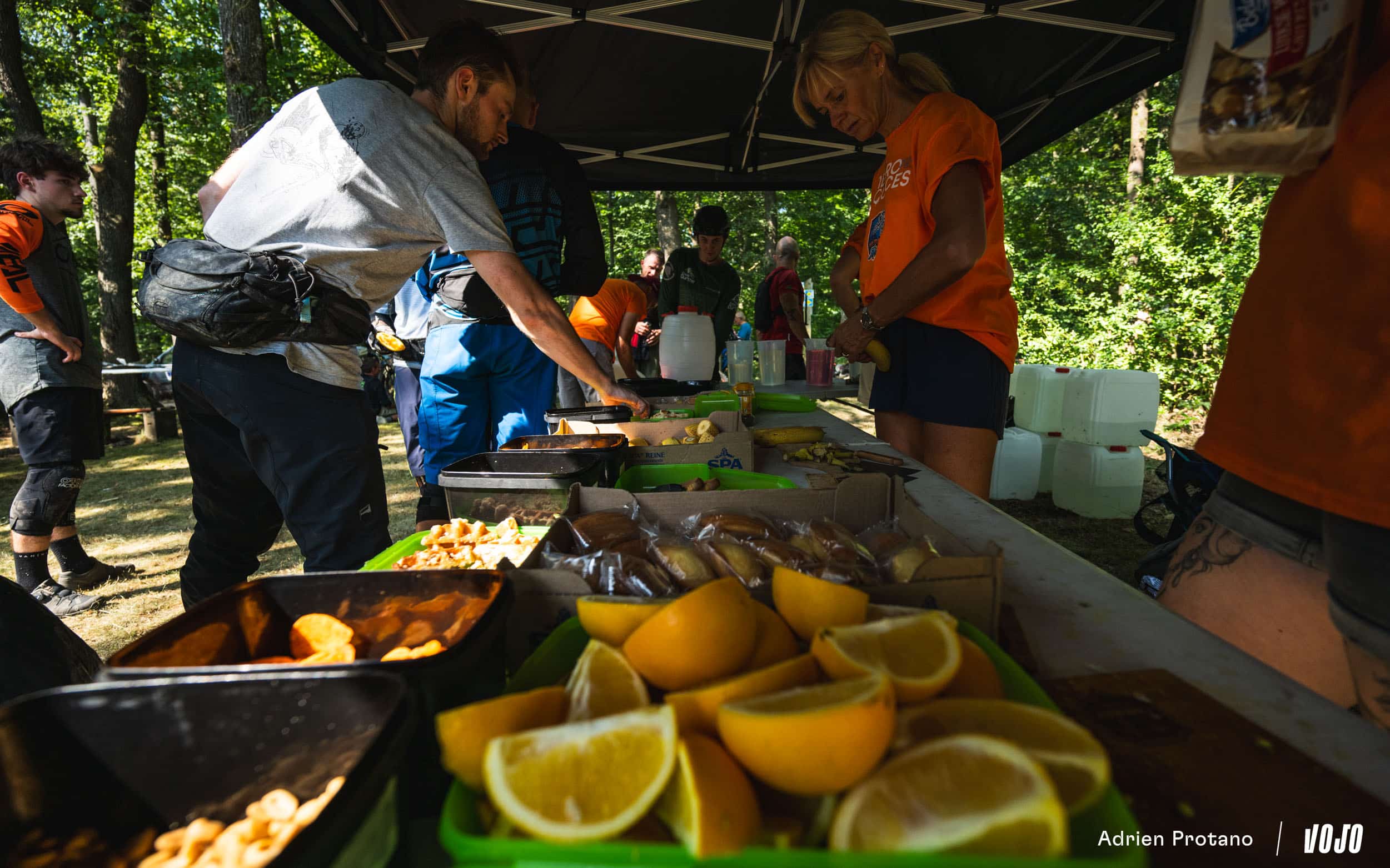 Dernier passage à la zone « ravito » située au sommet des spéciales avant de partir sur la dernière spéciale du jour, qui elle n’est pas située sur le trail center, et qui est annoncée comme physique avec une certaine dose de pédalage. On remercie une dernière fois les bénévoles qui ont assuré le service durant de longues heures pour permettre aux pilotes de s’hydrater et de manger un petit bout tout au long de cette journée (très) chaude, et en route !