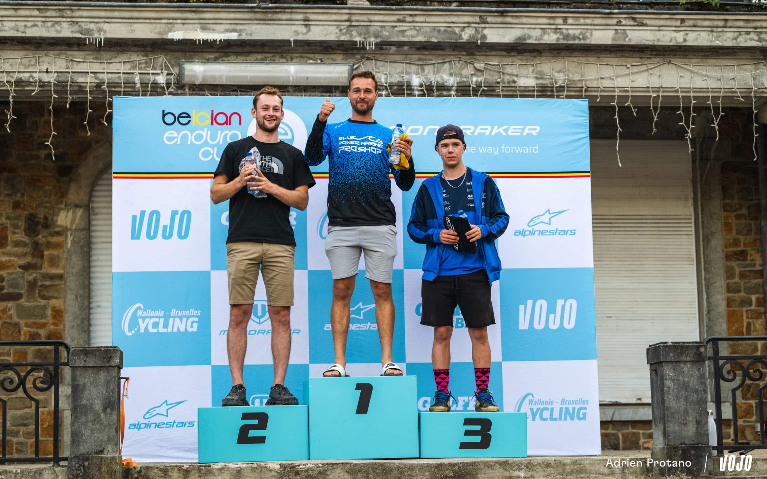 Chez les hommes, c’est Kevin Fors qui monte sur la plus haute marche du podium en Élites e-bike, devant Denis Pauwels et Sybe Van Hoeymissen.