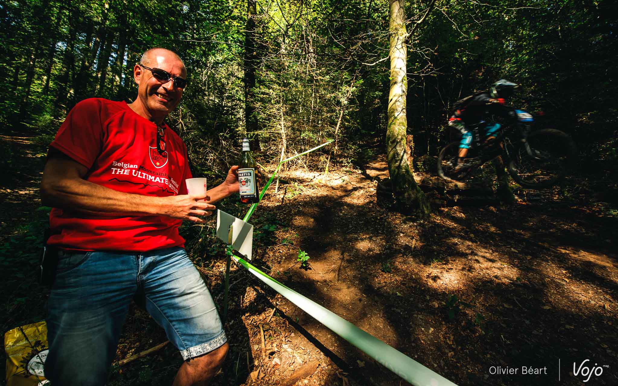 Ahah ! Voici le « coupable » ! Pris la main dans le sac, ce bénévole avoue sans mal s’être muni d’un compagnon liquide pour aider à passer le temps au bord des sentiers. « Je ne comprends pas, je veux bien partager avec les riders mais personne ne s’arrête. Pourtant j’ai des glaçons et il est bien frais ». Allez, santé !