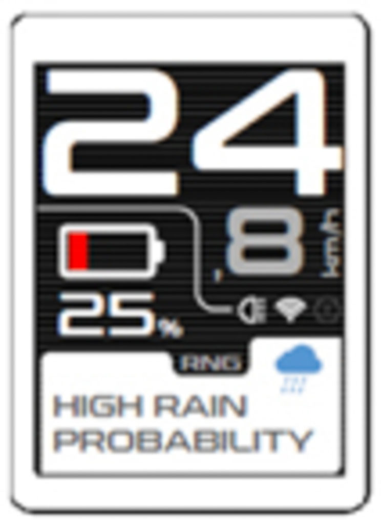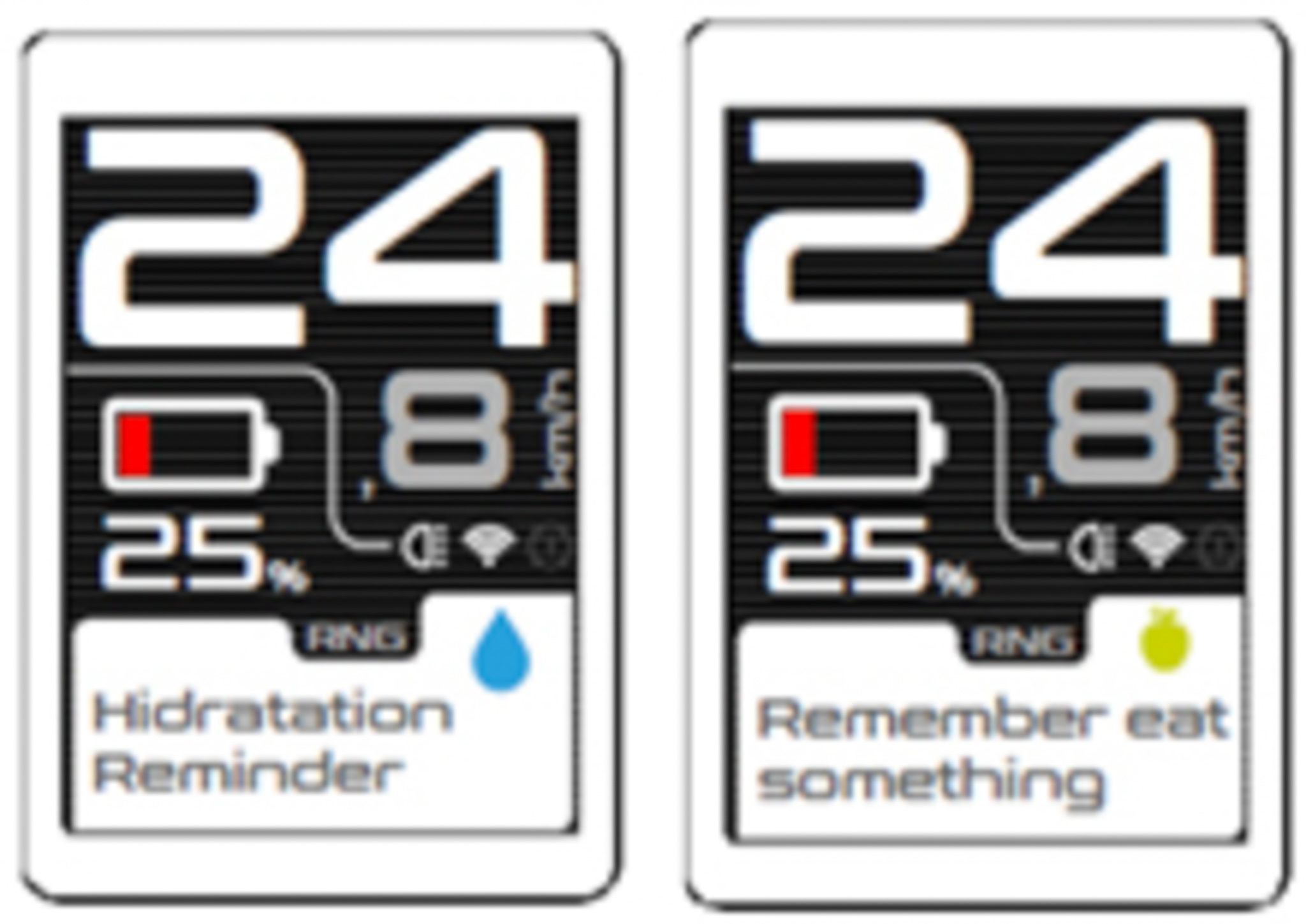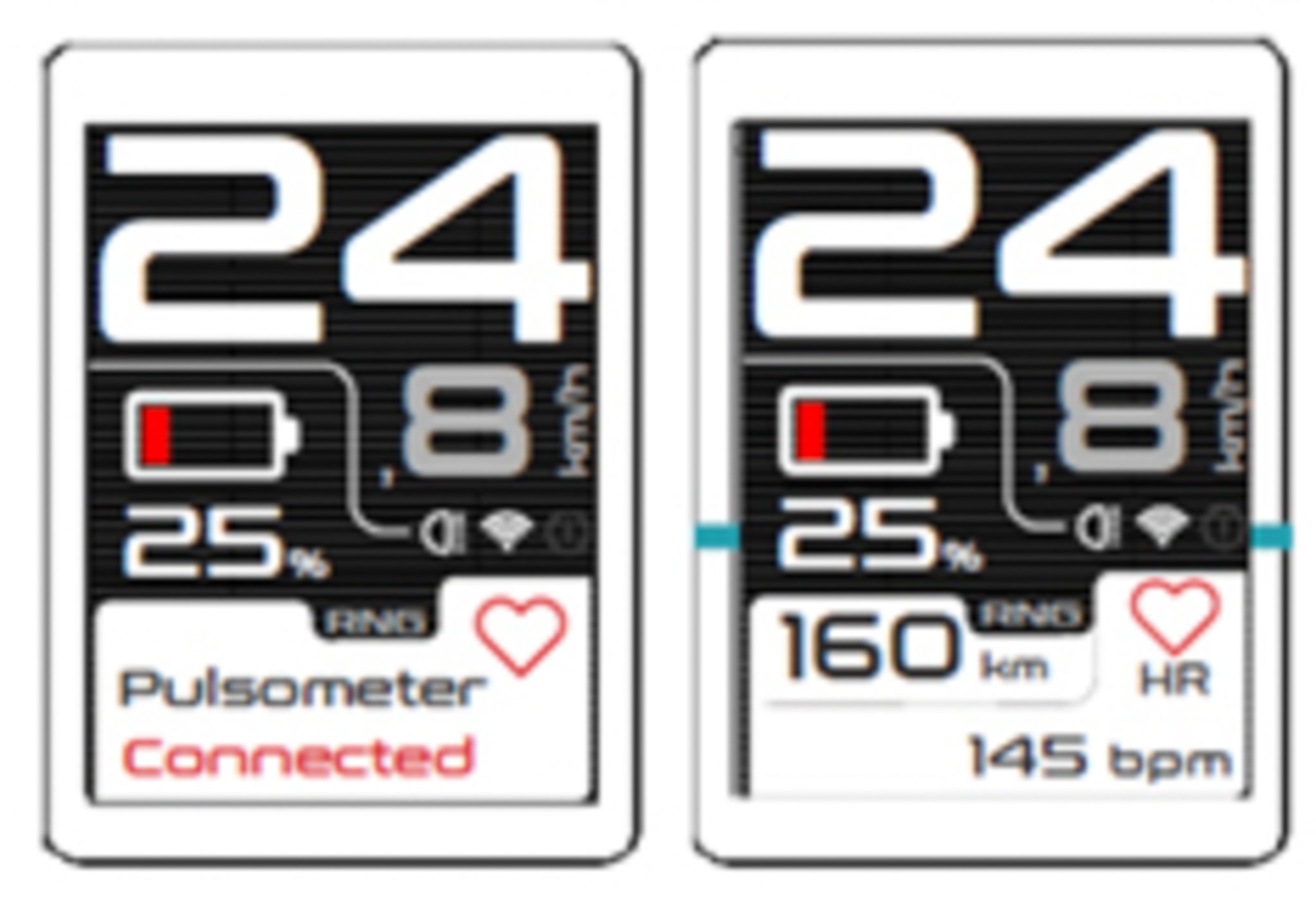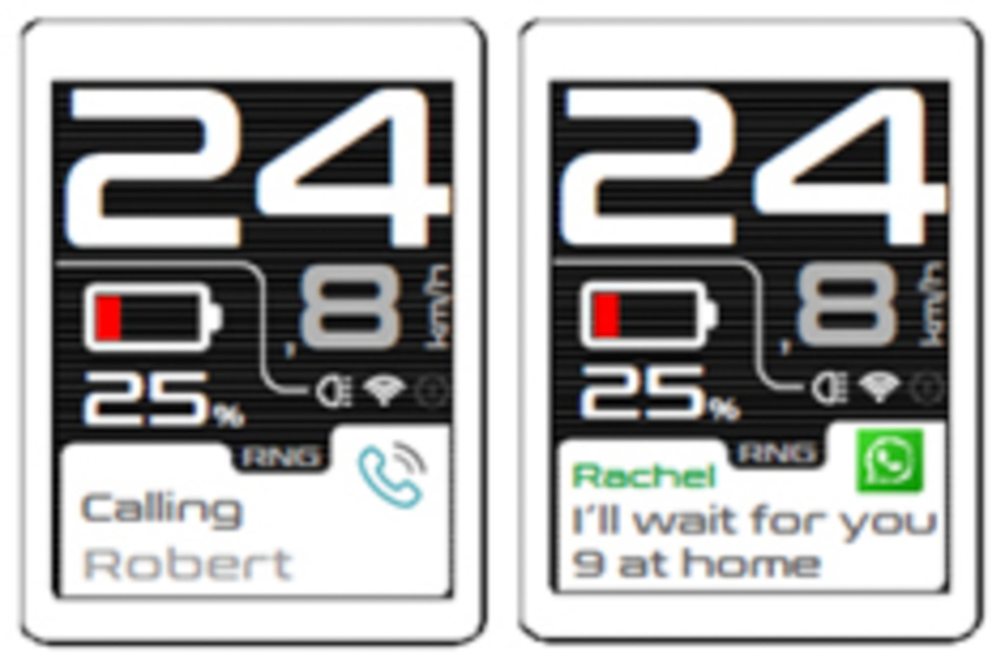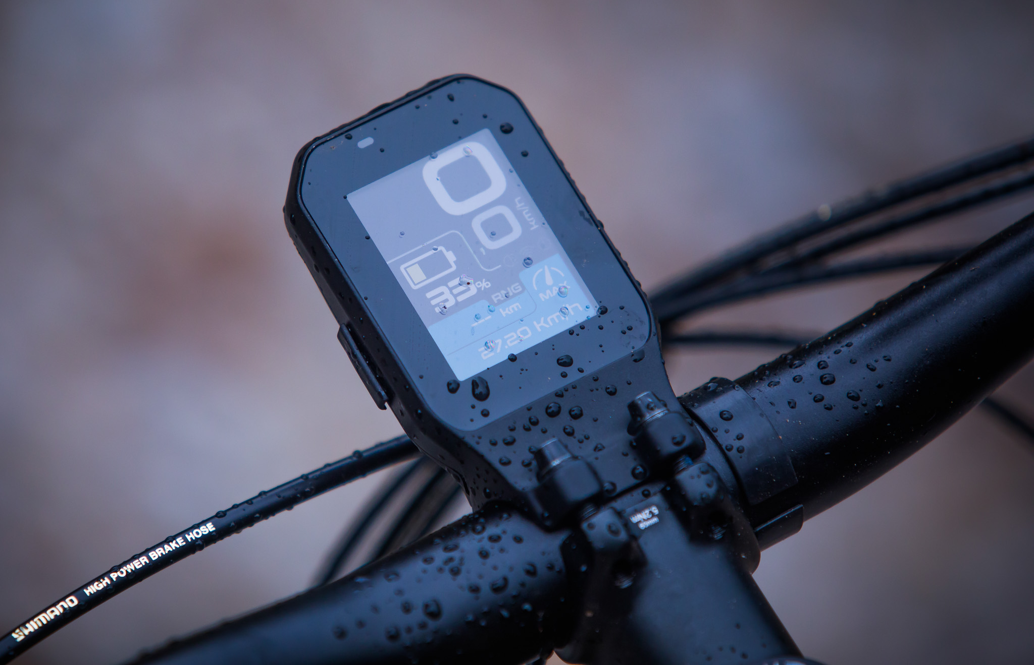 L’écran affiche une mine d’informations ultra-complète (du niveau de la console Bosch Nyon mais en plus compacte) : indicateur de charge, kilométrages partiel et total, vitesse, vitesse moyenne, cadence de pédalage, cadence de pédalage moyenne, mais aussi météo, rappels d’hydratation et d’alimentation (au cas où votre estomac resterait muet), calories, fréquence cardiaque, dénivelé… La connexion au smartphone se fait via Bluetooth, ce qui permet ensuite de recevoir SMS et appels sur l’écran.
