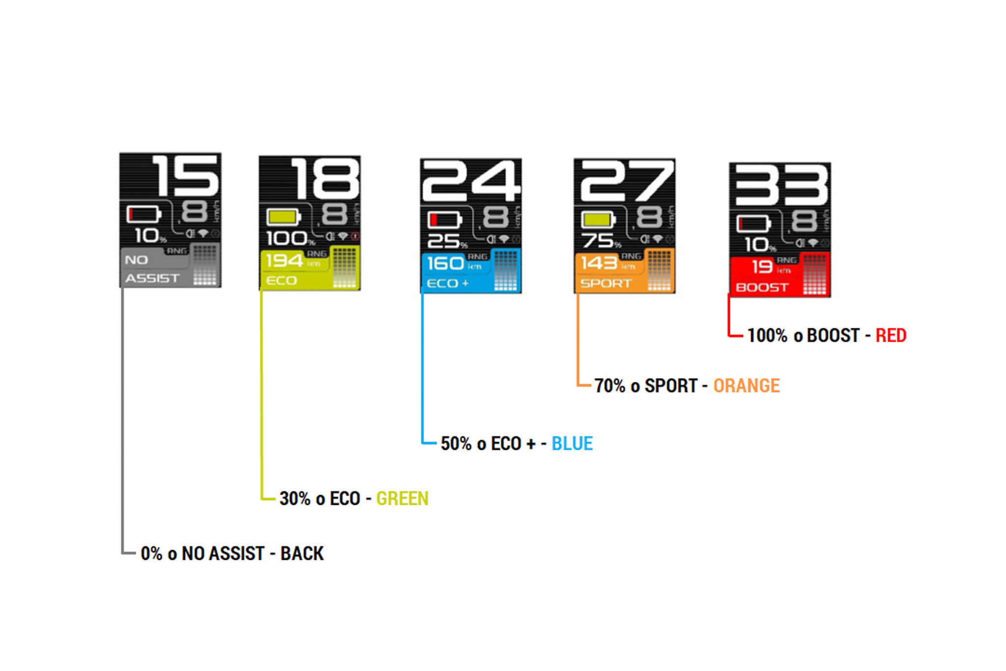 « Pour qui aime, il y a beaucoup de temps à passer dans les paramétrages afin que le vélo s’adapte totalement à son utilisateur »,prévient Nicola Vies. Et à l’énoncé de l’ensemble des possibilités, c’est un peu les portes du paradis geek qui s’ouvrent. Comme pour le Bosch, quatre modes d’assistance sont proposés : Eco+, Eco, Sport et Boost. Tous peuvent être paramétrés afin de délivrer la quantité de couple à la cadence de pédalage voulue. Malin, un jeu de LEDS colorées permet de se repérer à la fois sur la commande au guidon et sur l’écran en fonction du mode choisi (vert, bleu, orange et rouge, de l’Éco+ au Boost).