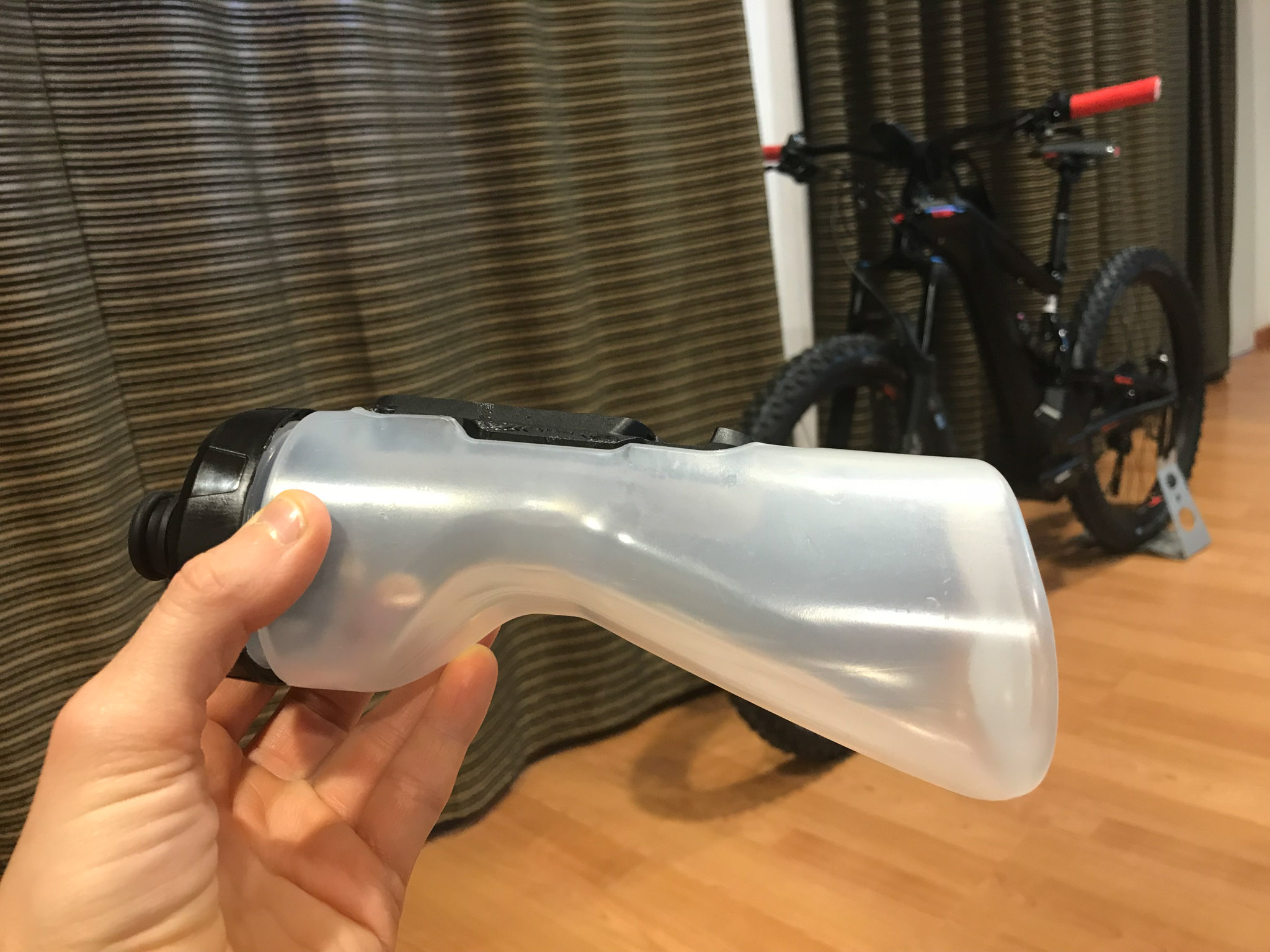 Une gourde spécifique, pouvant se loger sur le tube supérieur et évidée au niveau de l’amortisseur, a aussi été développée afin d’emmener 500 ml de liquide, pour les aficionados du porte-bidon. Celle-ci a été développée sur base du principe magnétique FidLock.