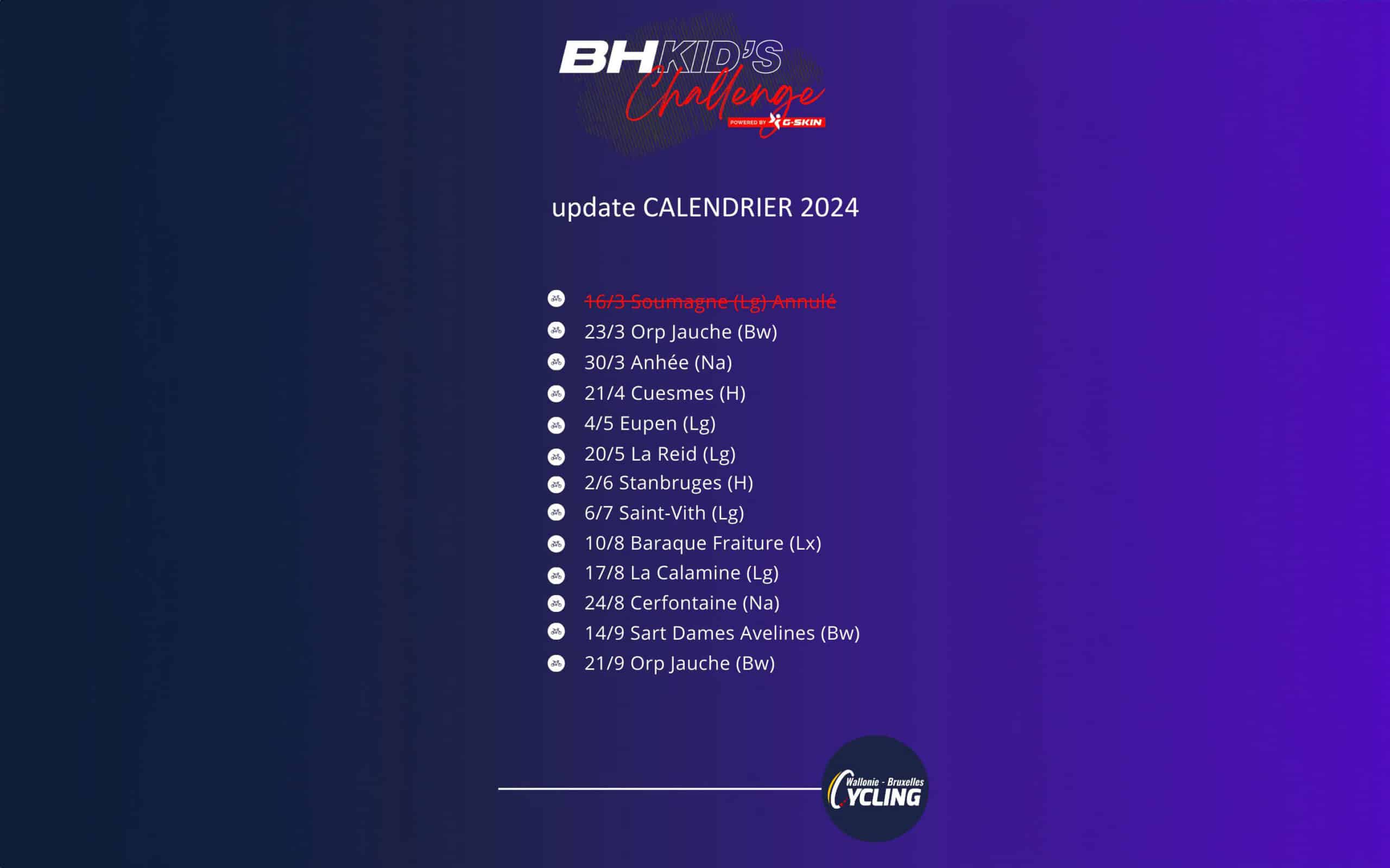 Après plus de 25 années d’existence sous le nom de « Kids Trophy », la série de courses XC belges destinées aux pilotes de 7 à 14 ans se renouvelle et change de nom pour devenir le « BH Kid’s Challenge ». Si cette transformation est empreinte de changements internes, notamment au niveau de l’organisation désormais chapeautée par la Fédération Cycliste Wallonie-Bruxelles (FCWB), la philosophie reste la même et l’objectif demeure identique : faire découvrir aux jeunes pilotes le plaisir de la compétition.