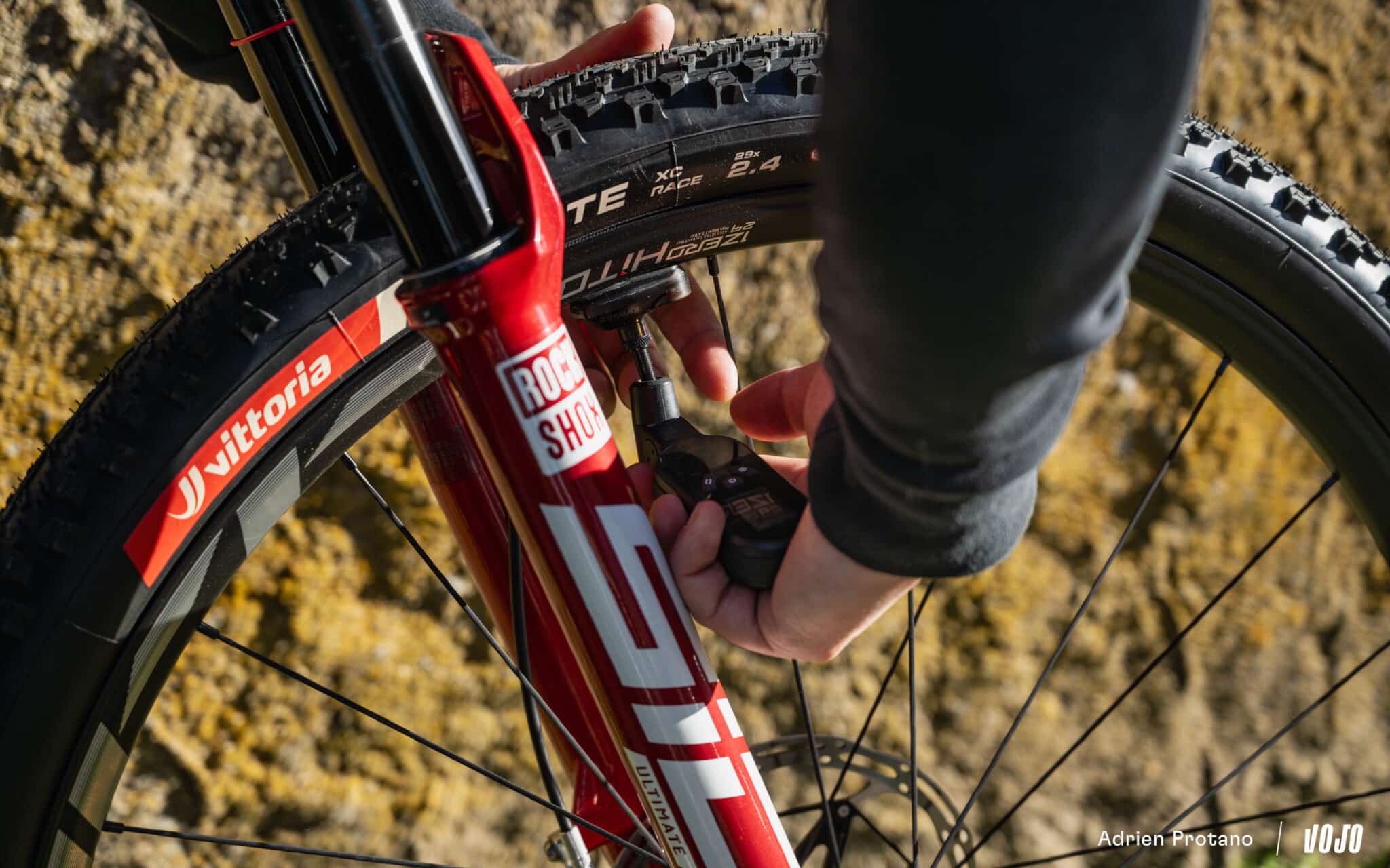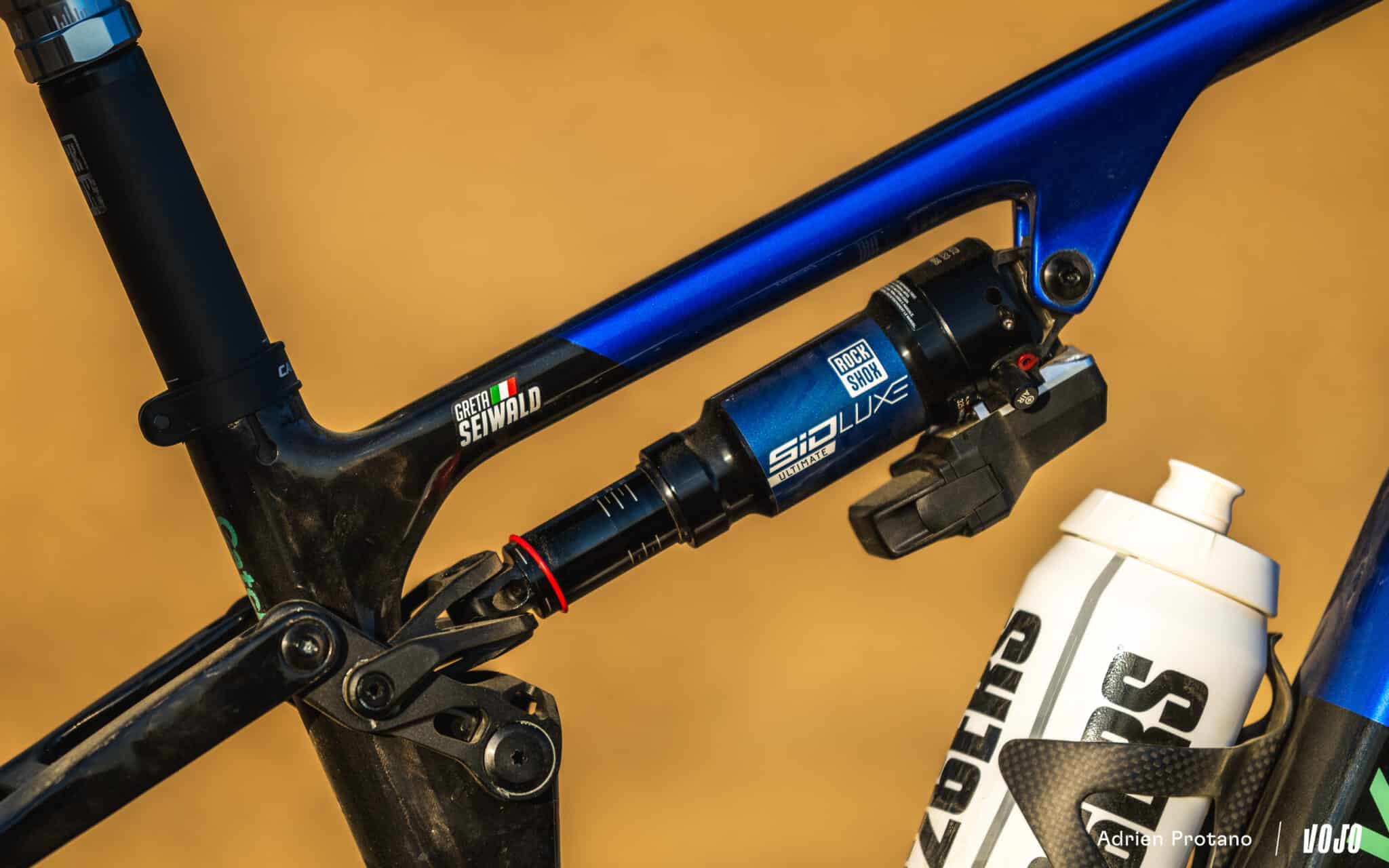On vous en a déjà proposé le test, ce sont des suspensions Flight Attendant, à savoir pilotées électroniquement, qui équipent le vélo du team : Test longue durée | Les 10 travaux du RockShox Flight Attendant XC. La fourche bénéficie toutefois du coloris signature rouge de chez Sram, une édition limitée que l’on risque de voir apparaître chez d’autres équipes !