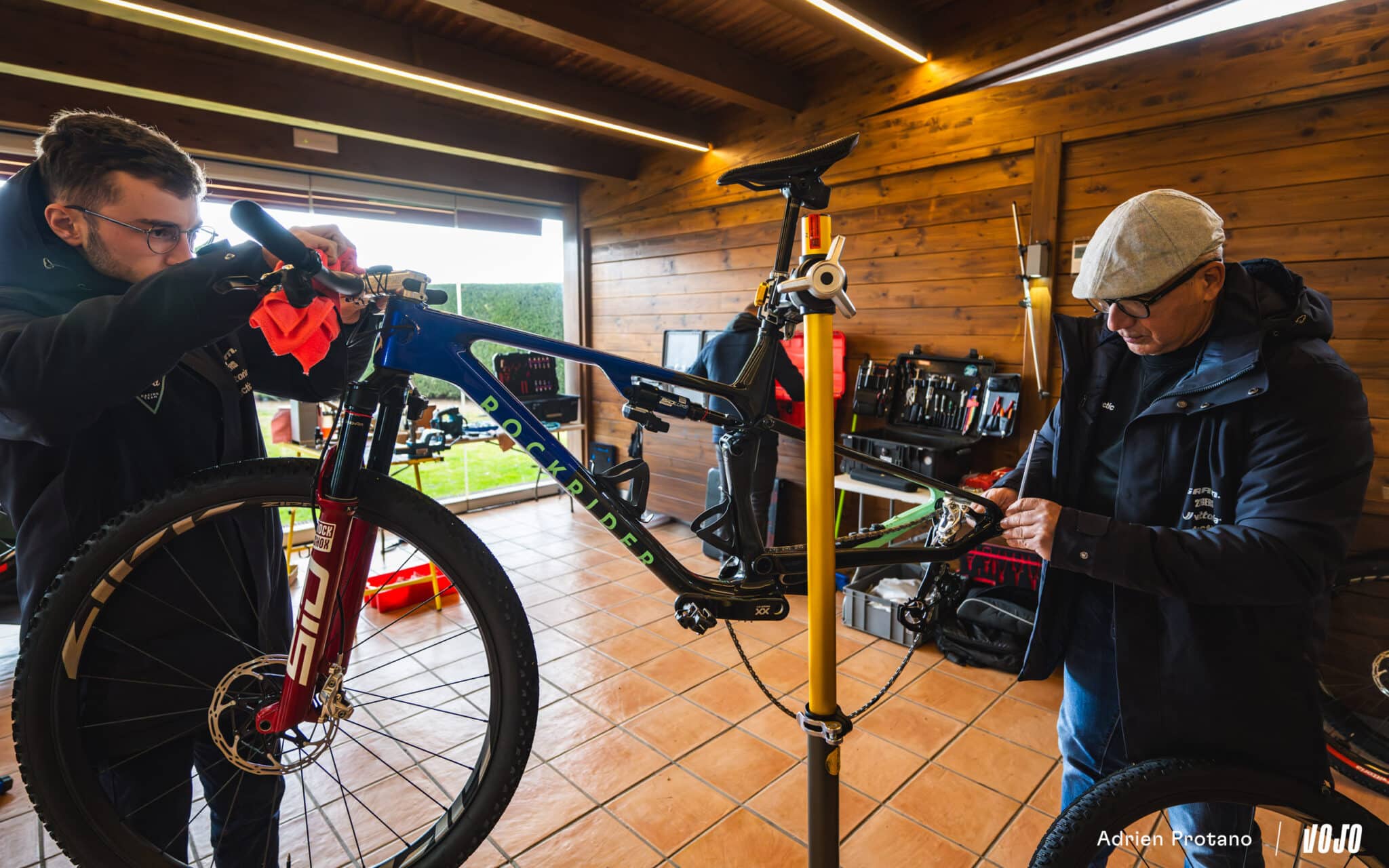 Ce passage aux suspensions électroniques n’effraie pas trop Claudio, l’un des mécanos du team (à droite sur la photo): « J’ai déjà travaillé avec le Flight Attendant à l’époque où j’étais mécano pour Santa Cruz – RockShox. Je connais déjà tout ça (rires) », s’amuse-t-il.