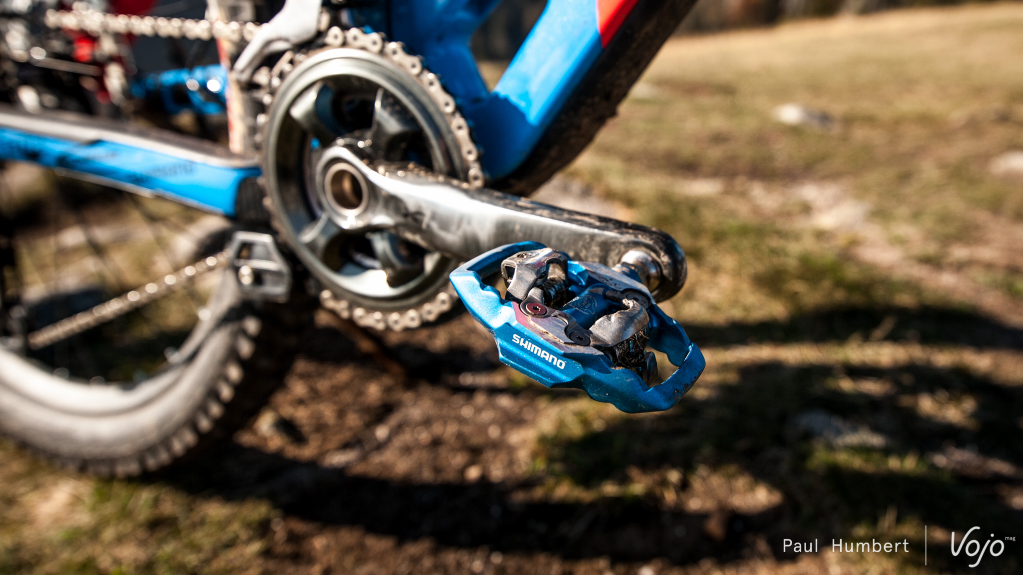 Toujours chez Shimano, Nicolas Lau utilise les pédales XTR « 25 ans » de couleur bleue.