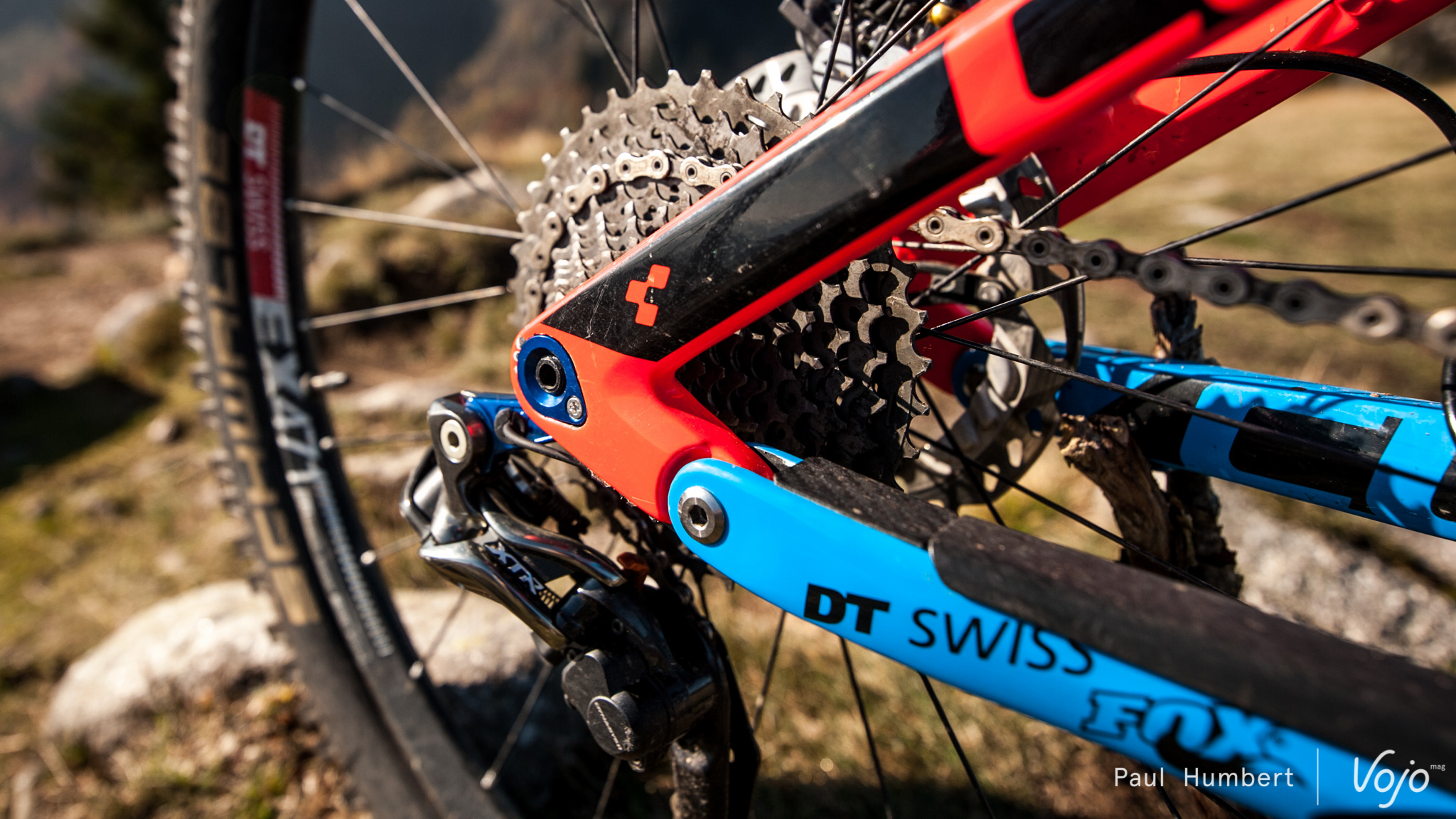 L’axe arrière passe au format Boost, ce qui augmente la rigidité générale du vélo. Les bases arrières du Stereo se raccourcissent (435,5mm) et l’angle de direction est plus couché (65°). Bref, le Stereo affiche enfin les côtes d’un vélo d’enduro de compétition moderne. « Le raccourcissement des bases me permet de rentrer plus fort dans les épingles et l’ouverture de l’angle de direction m’offre une plus grande stabilité à haute vitesse« , nous explique-t-il.