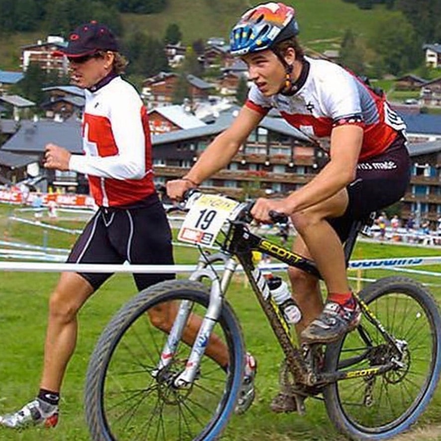 Ici, sur cette image d’époque, on voit aussi Thomas Frischknecht qui court à côté de lui pour l’encourager. Celui qui est devenu son manager au sein du team Scott-Sram, se souvient : « J’étais encore coureur à l’époque, et j’ai même fini 3e aux Gets. Mais je m’intéressais déjà aux jeunes, et tout particulièrement à Nino. J’avais perçu qu’il avait quelque chose de vraiment spécial. Aux Gets, il a l’a prouvé pour la première fois. Par la suite, vers la fin de ma carrière de coureur, quand j’ai commencé à passer de l’autre côté de la barrière et à monter une équipe, j’ai immédiatement pensé à lui. Et aujourd’hui, 21 ans plus tard, nous sommes toujours ensemble ! »