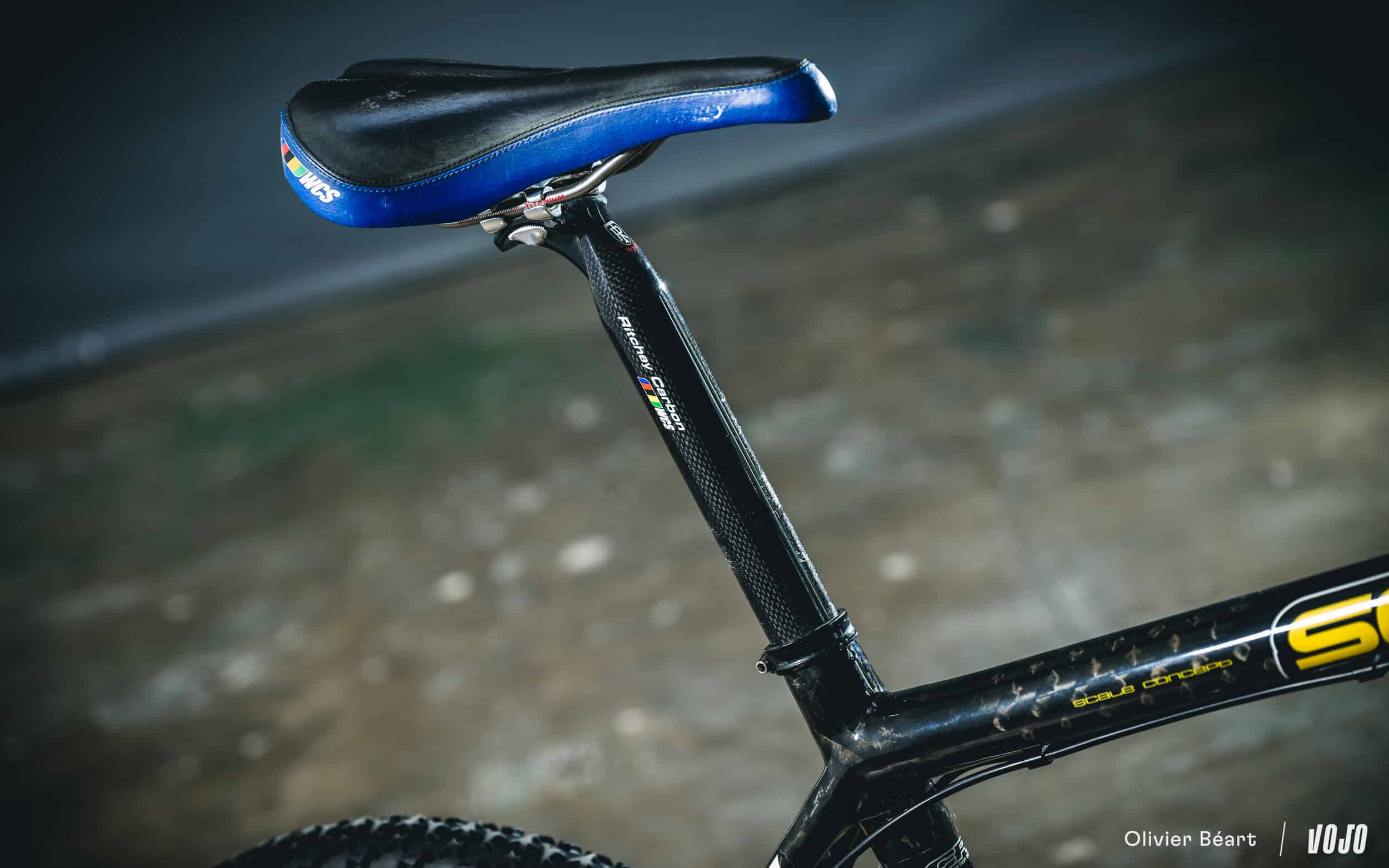 La selle et la tige de selle sont signées Ritchey. Ritchey était un équipementier très important à l’époque, plus qu’aujourd’hui, et le kit Ritchey présent ici, bien plus complet que sur le vélo de série, s’explique par les liens très étroits que Tom Ritchey et Thomas Frischknecht ont toujours entretenus. L’Américain a toujours soutenu le pilote suisse et le partenariat s’est étendu aux protégés de ce dernier, ainsi que pendant longtemps aux équipes dont « Frischi » s’est occupé (Scott SwissPower, etc).