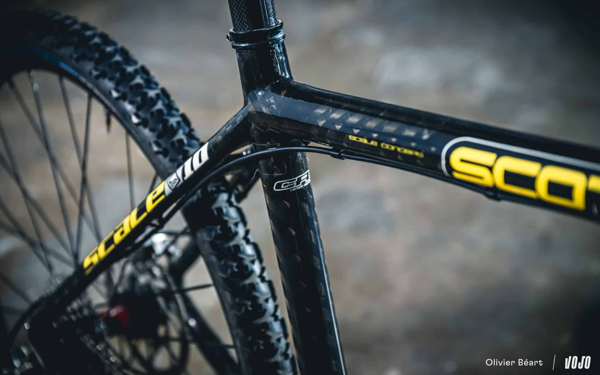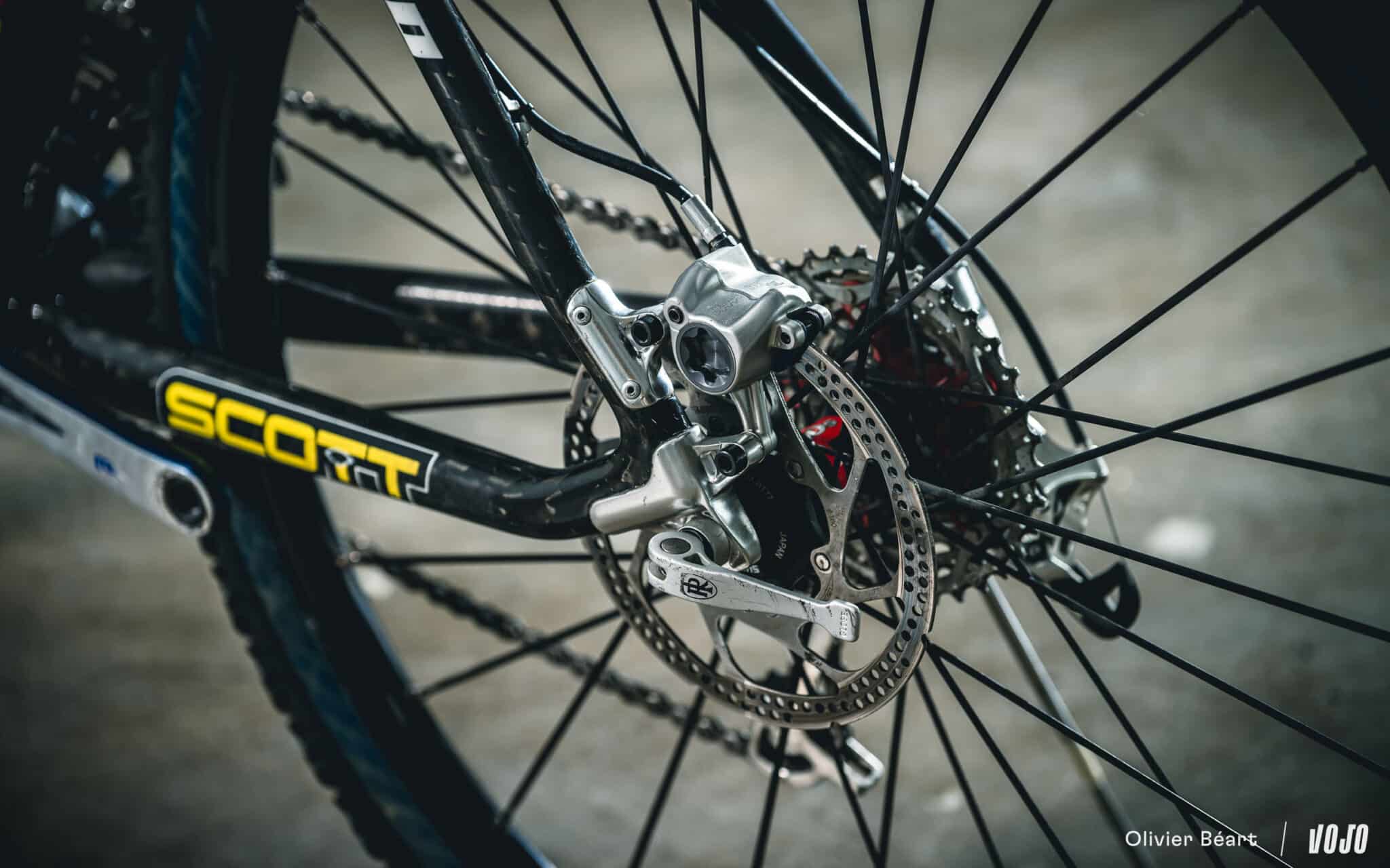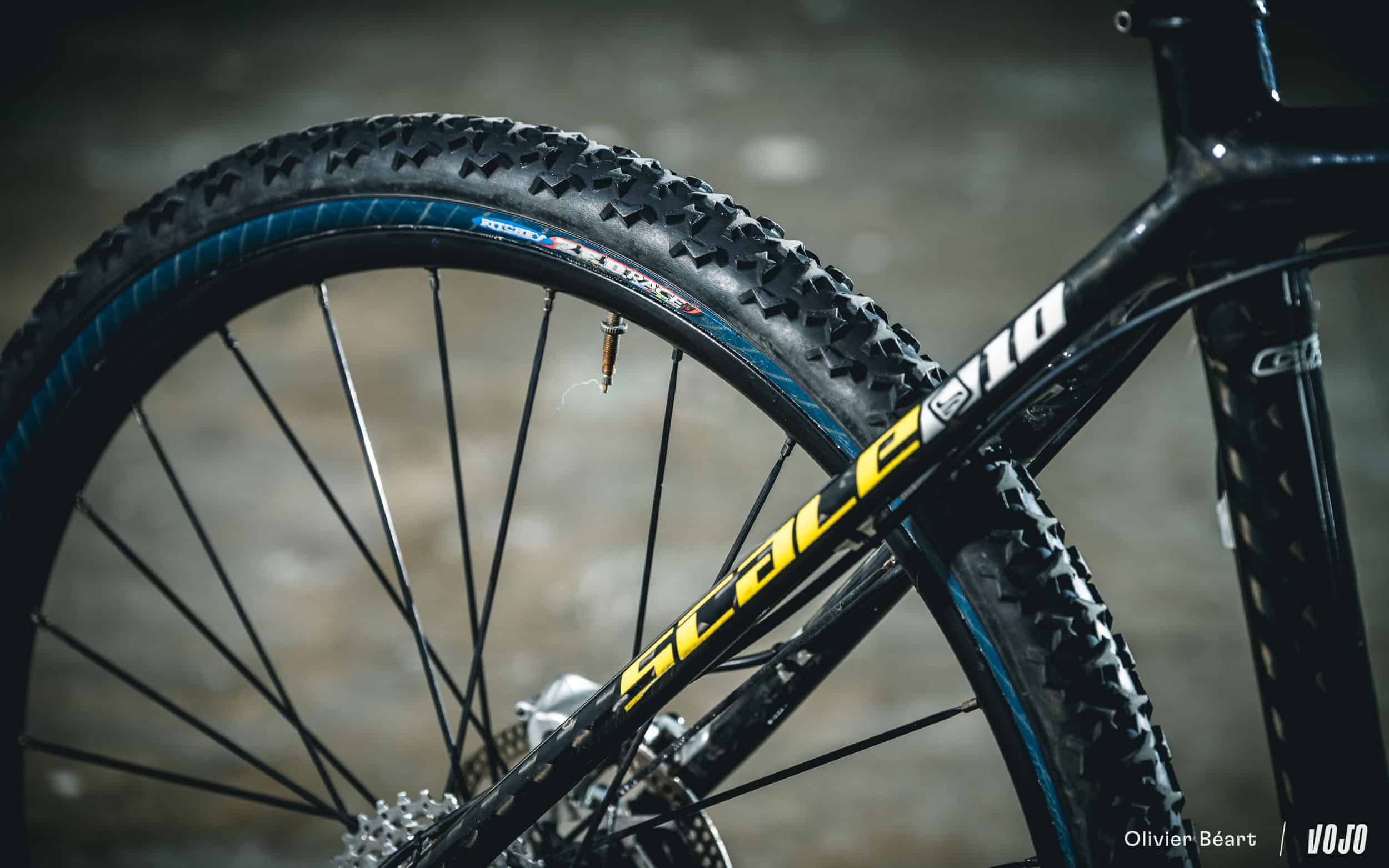 Pour la petite histoire, ces pneus n’étaient pas les mêmes que ceux qui équipaient la version de série du Scott Scale 10. Il s’agit d’un composant particulièrement compliqué à retrouver. Ce modèle précis est rare et Nino roulait avec la version WCS (World Cup Series) haut de gamme reconnaissable à ses flancs bleus. Un modèle très léger et aussi… fragile qui résiste mal au temps et qui est donc devenu très rare.