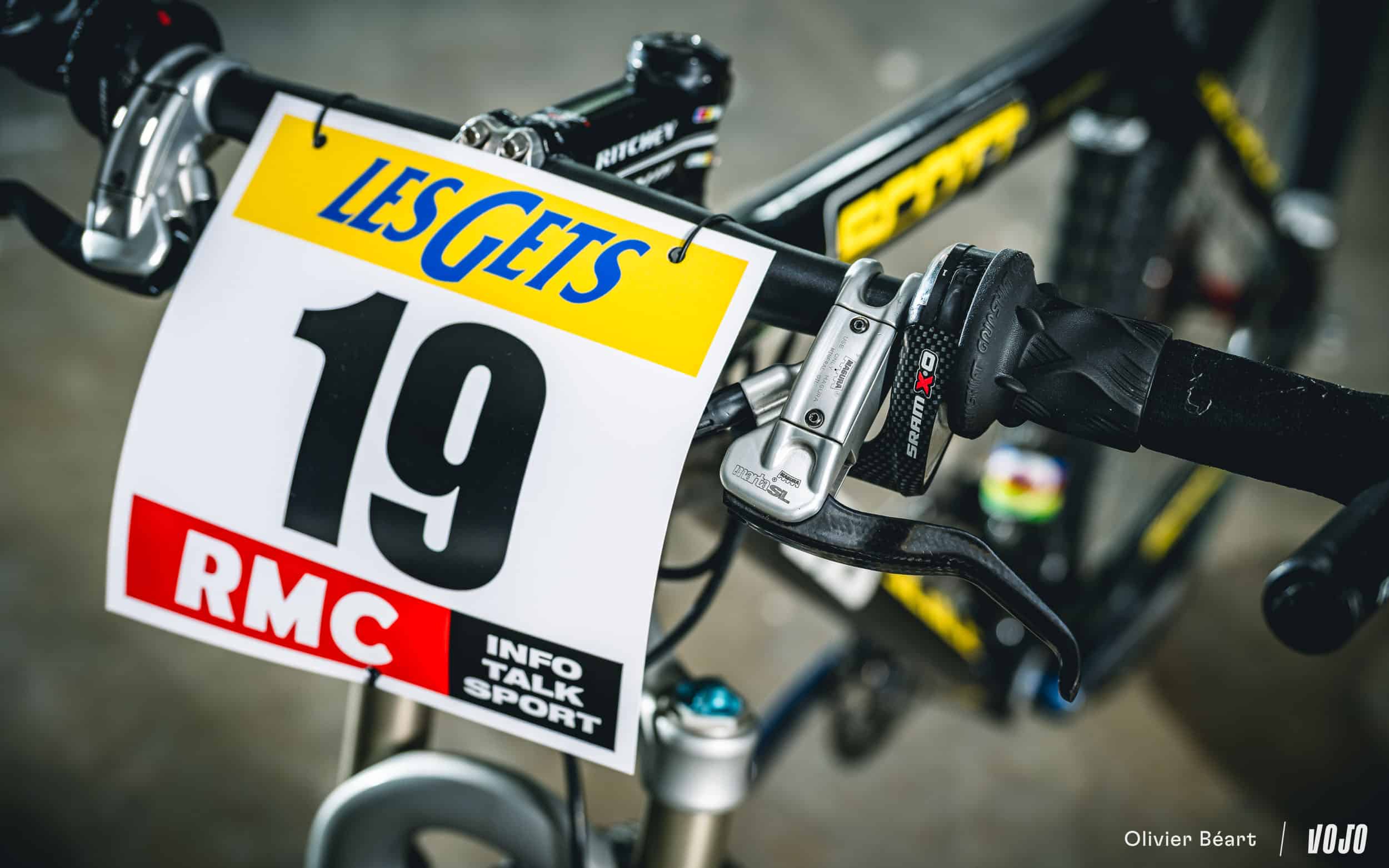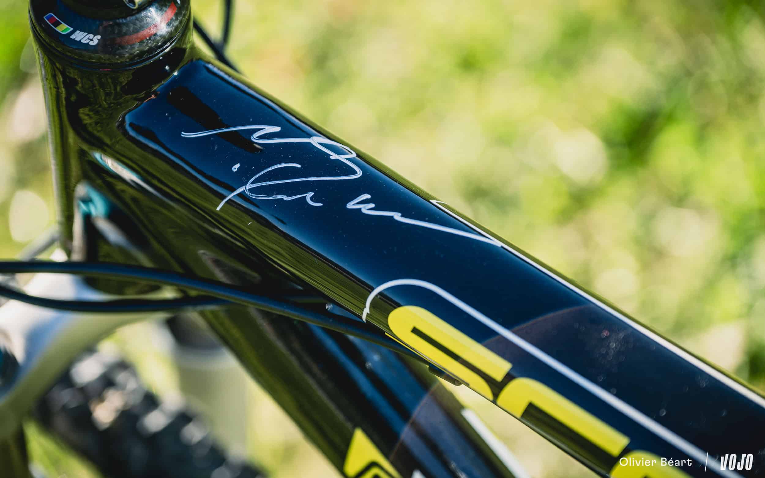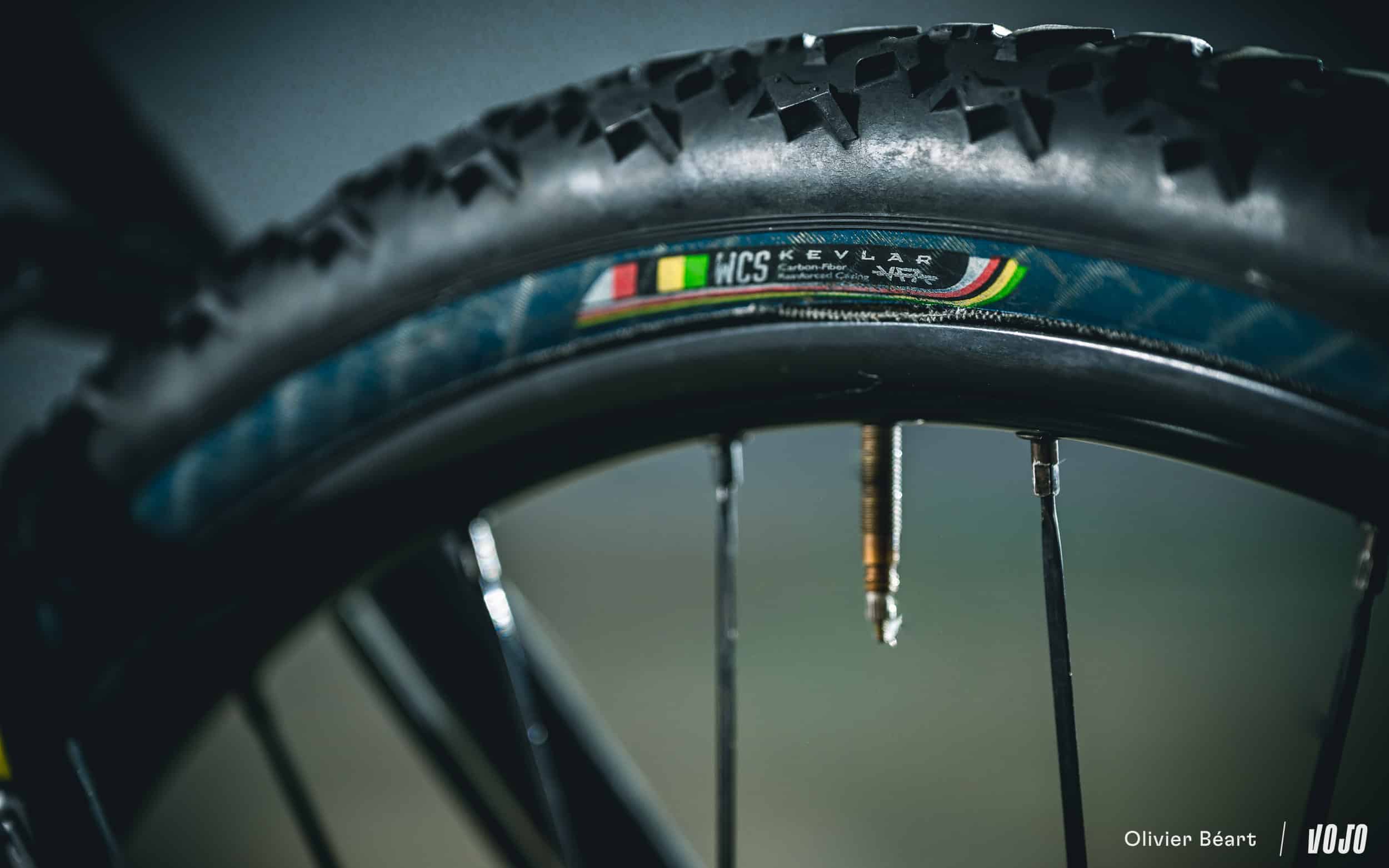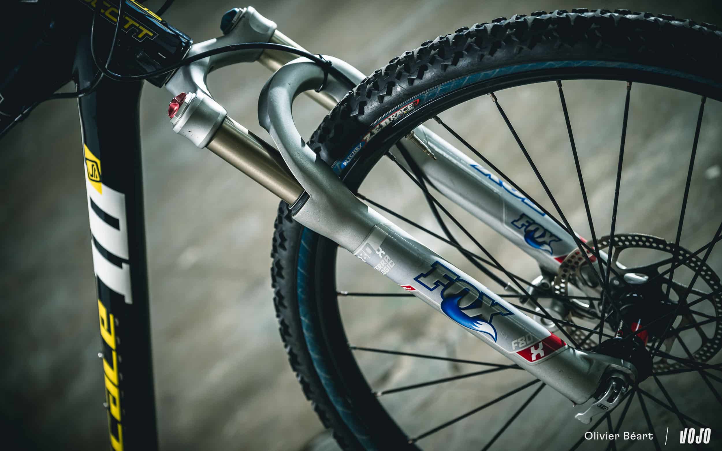 Pour la petite histoire, ces pneus n’étaient pas les mêmes que ceux qui équipaient la version de série du Scott Scale 10. Il s’agit d’un composant particulièrement compliqué à retrouver. Ce modèle précis est rare et Nino roulait avec la version WCS (World Cup Series) haut de gamme reconnaissable à ses flancs bleus. Un modèle très léger et aussi… fragile qui résiste mal au temps et qui est donc devenu très rare.