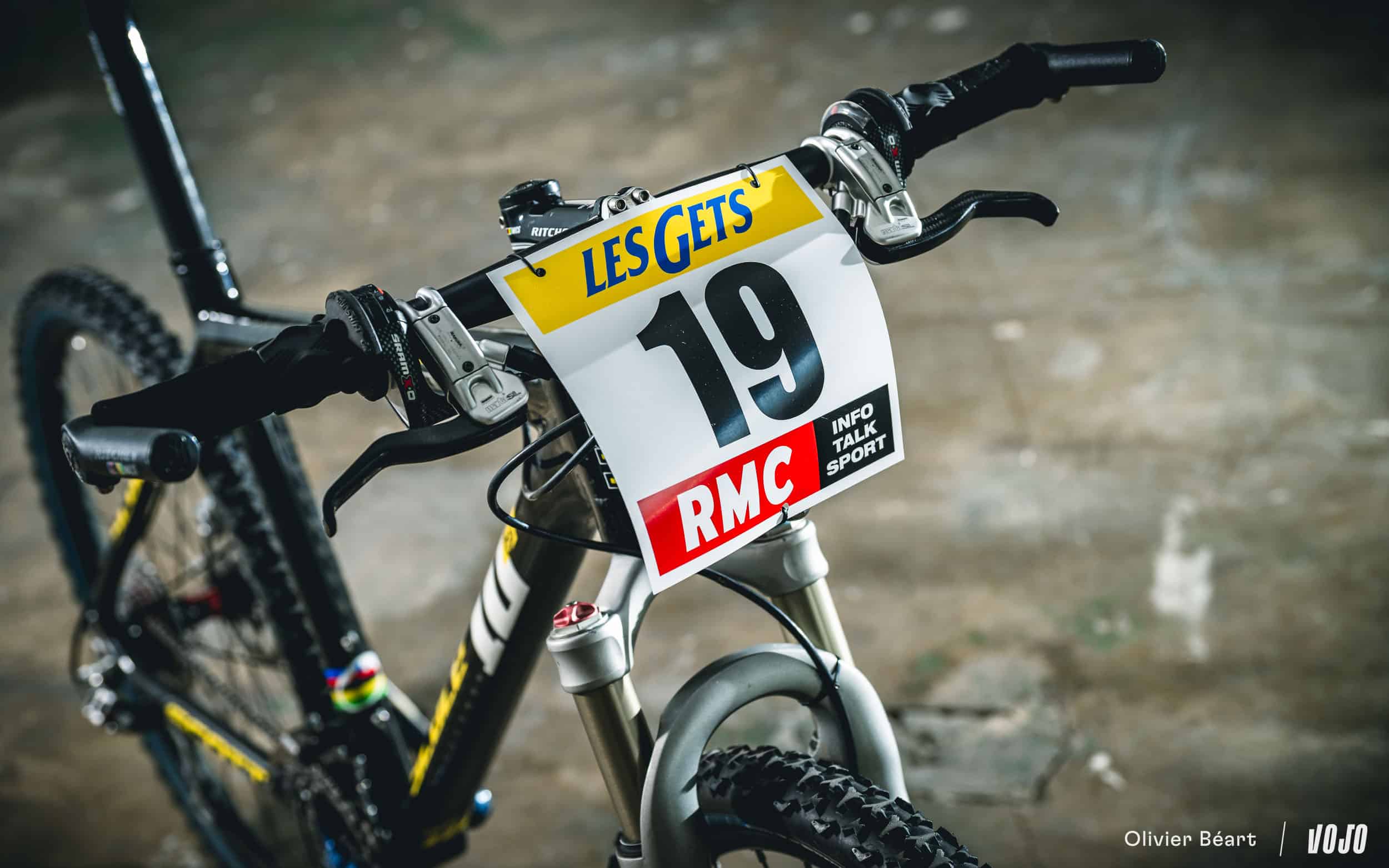 A l’époque, Nino Schurter roulait avec des freins Magura Marta SL équipés de leviers en carbone. Très légers et efficaces, ils n’auraient probablement pas à rougir sur un vélo actuel. Le cintre et la potence sont des Ritchey WCS dans le nouveau diamètre oversize 31.8 mm qui venait de sortir à l’époque. Aux extrémités, on retrouve un accessoire qui a disparu aujourd’hui : des cornes, qu’on utilisait en côte pour avoir une meilleure position. Enfin, vous noterez que, grâce à notre graphiste Esteban, nous avons pu refaire à l’identique la plaque de cadre numéro 19 que Nino arborait à l’époque sur son vélo pour les Worlds aux Gets.