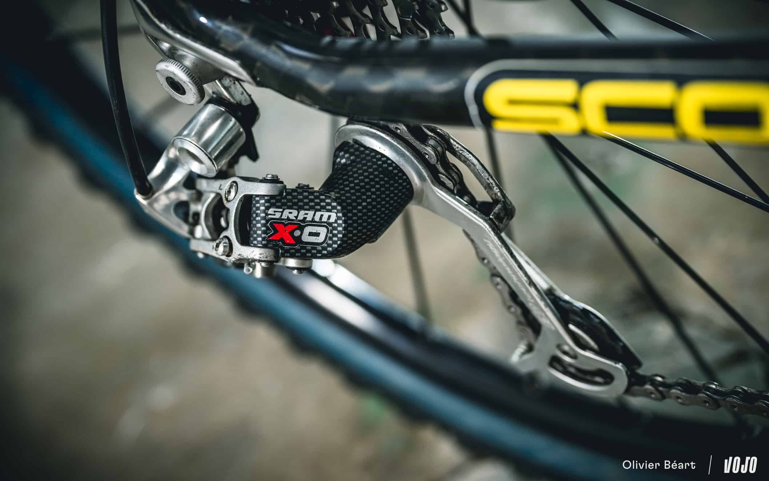 Coup de projecteur sur le magnifique dérailleur Sram X.O, qui était une petite révolution à l’époque avec ses pièces en alu usiné et en matériaux composites. Il a d’ailleurs très bien vieilli et il fonctionne comme au premier jour ! C’est aussi l’occasion de rappeler que Nino Schurter a roulé avec des dérailleurs Sram et uniquement Sram tout au long de sa carrière.