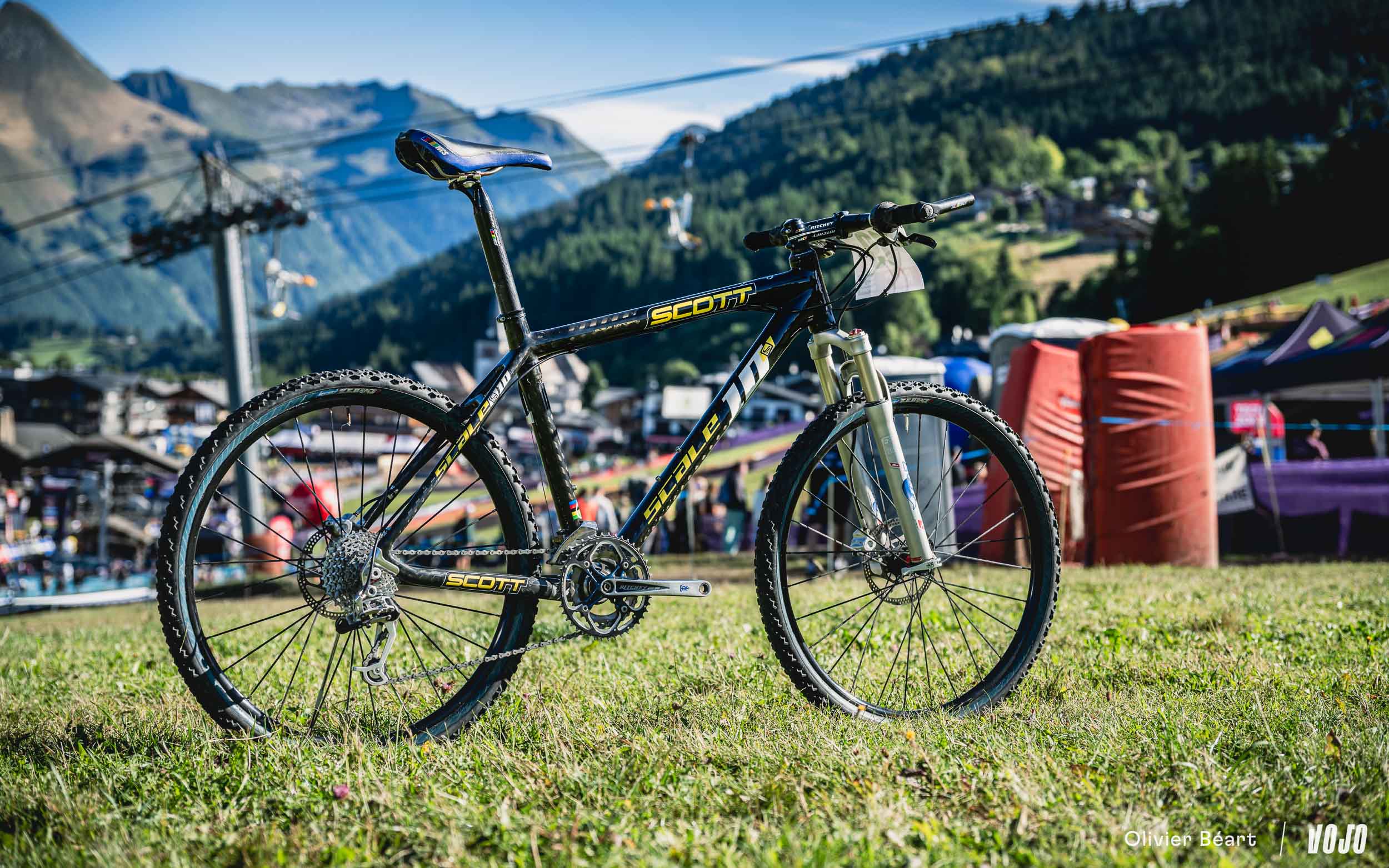Pour marquer le coup, nous avons voulu faire une surprise à Nino à l’occasion de la coupe du monde des Gets, en lui amenant le Scott Scale 10 avec lequel il a décroché son tout premier titre de champion du monde, en catégorie Junior. Ou plutôt une réplique la plus exacte possible car personne ne sait exactement ce que le vélo précis roulé par Nino est devenu. A l’époque, son mécanicien n’était pas encore celui qui est devenu son binôme inséparable, Yanick The Mechanic, et cette machine ne fait pas partie de la très belle collection qu’il a constituée par la suite et que vous pouvez voir en détail dans cet article : Visite | Scott-Sram : la collection des vélos de Nino Schurter par Yanick The Mechanic.