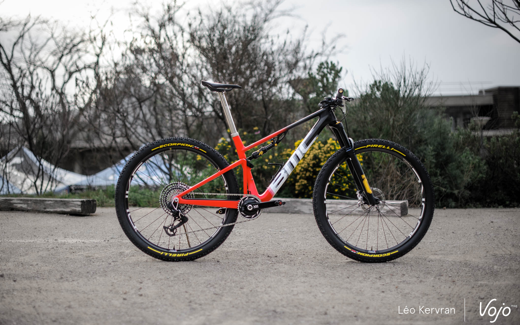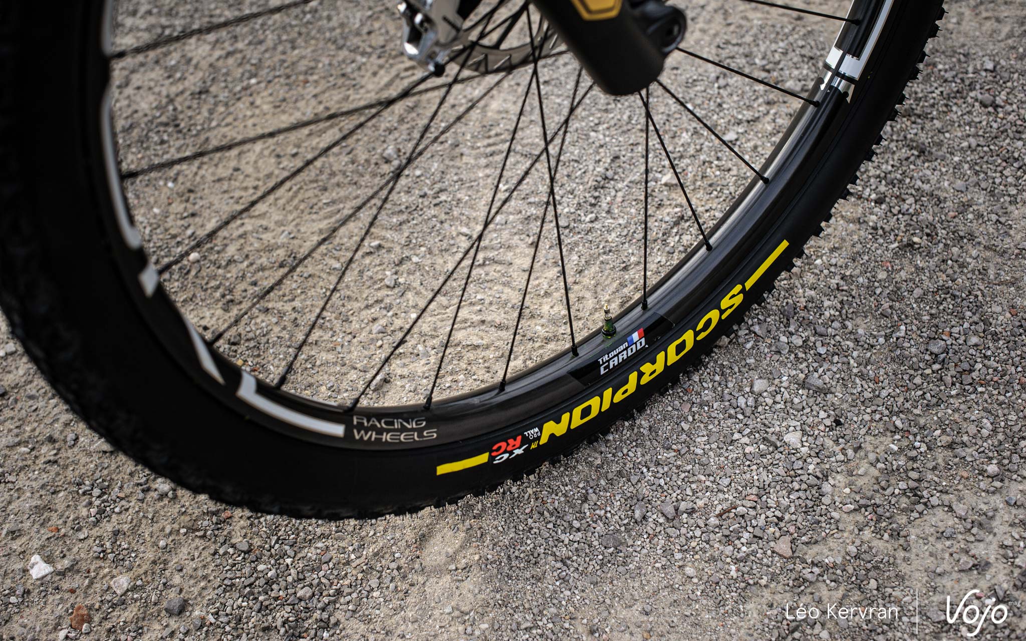 Pneus Pirelli Scorpion XC RC 2.4 et roues Duke pour le BMC MTB Team, sans inserts à l’heure actuelle. Côté pressions, Titouan Carod et Jordan Sarrou devraient tous les deux rouler avec 17 psi (1,17 bar) à l’avant et 19 psi (1,31 bar) à l’arrière selon Adrien Prevost, le mécanicien de l’équipe.