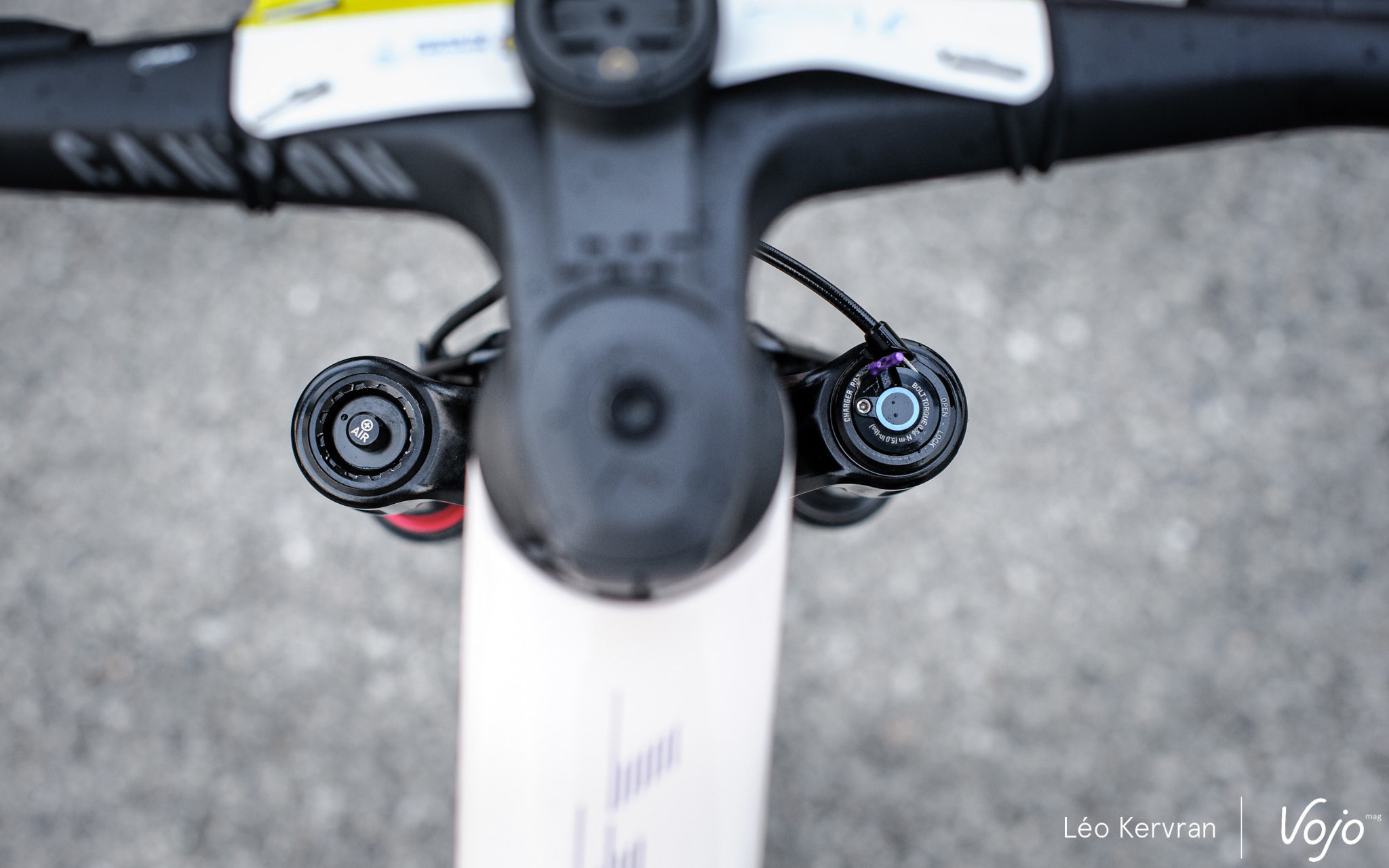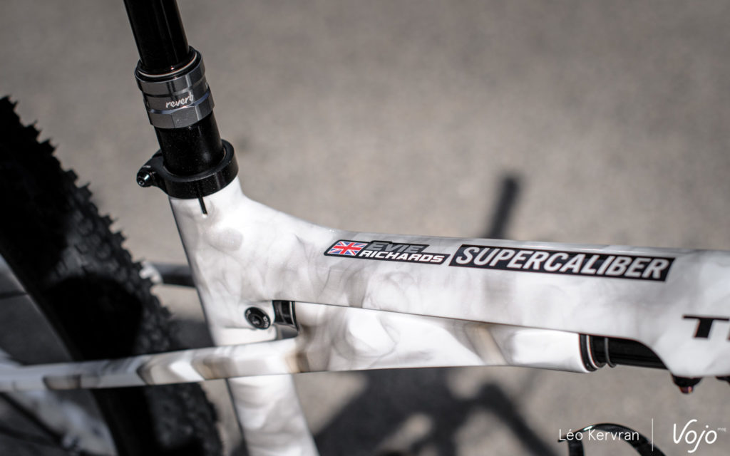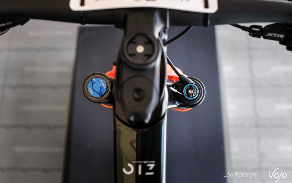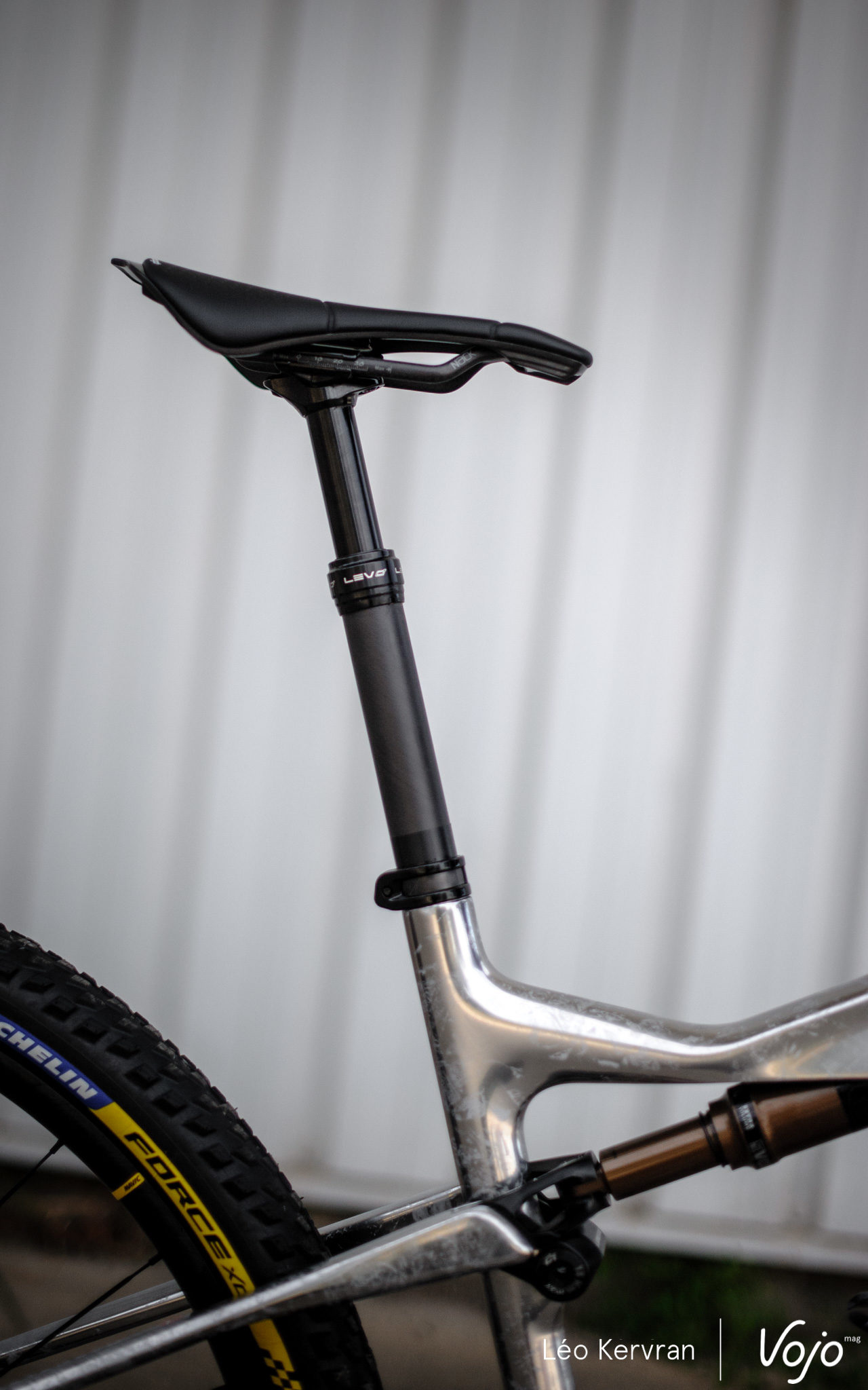 La tige de selle télescopique est désormais un accessoire incontournable chez les Elites et à ce niveau, les pilotes qui roulent encore en tige de selle fixe sont l’exception. Sebastian Fini a lui opté pour une KS Lev-Ci avec fourreau en carbone et un tout petit débattement : 75 mm.