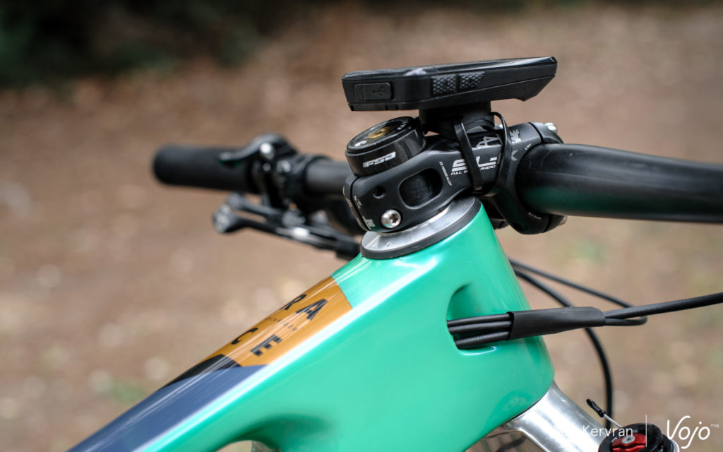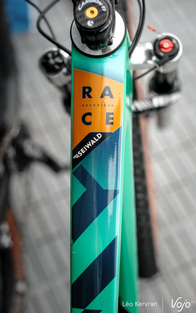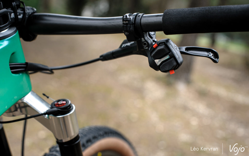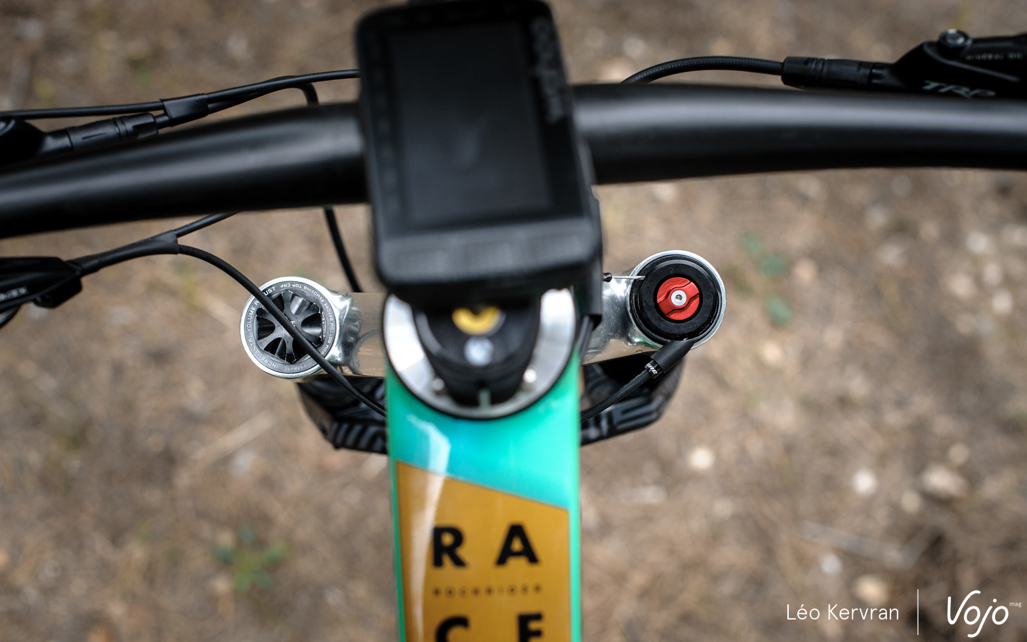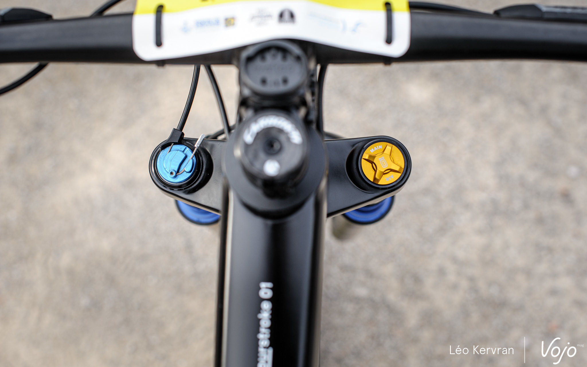La tige de selle télescopique est désormais un accessoire incontournable chez les Elites et à ce niveau, les pilotes qui roulent encore en tige de selle fixe sont l’exception. Sebastian Fini a lui opté pour une KS Lev-Ci avec fourreau en carbone et un tout petit débattement : 75 mm.