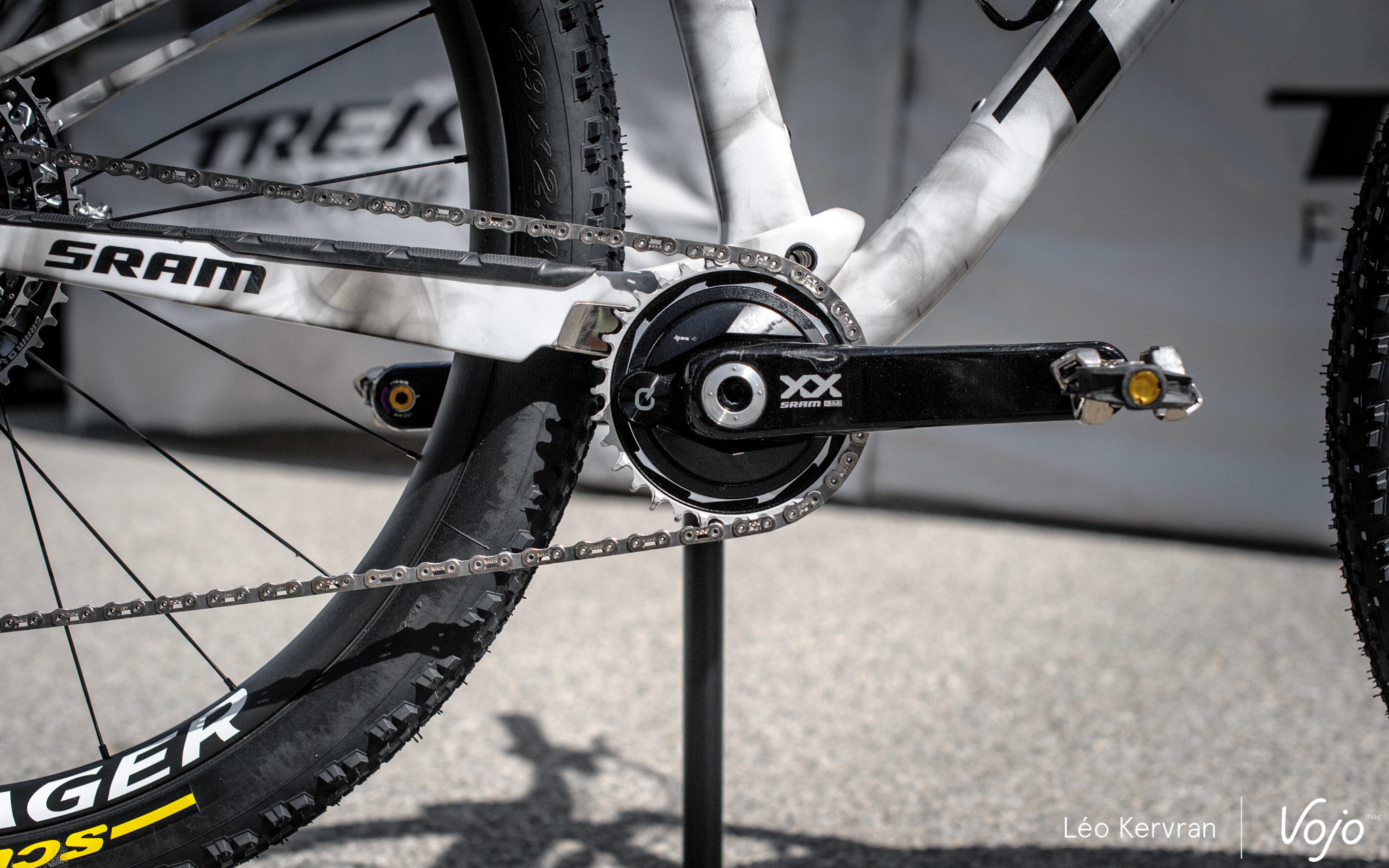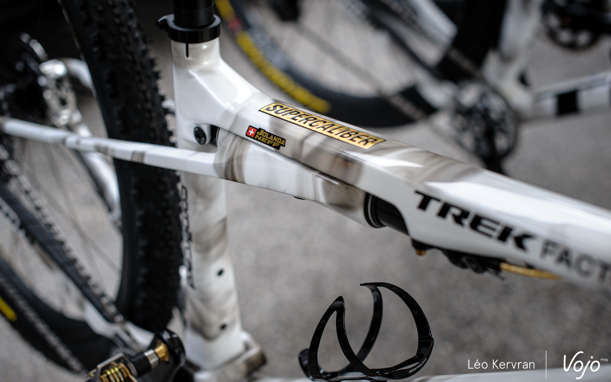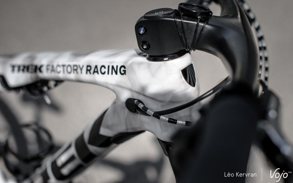 A nouveau, tout le monde a droit à son groupe Sram XX SL… avec une petite touche : comme toujours chez Trek, les batteries AXS sont étiquetées aux couleurs des pilotes.