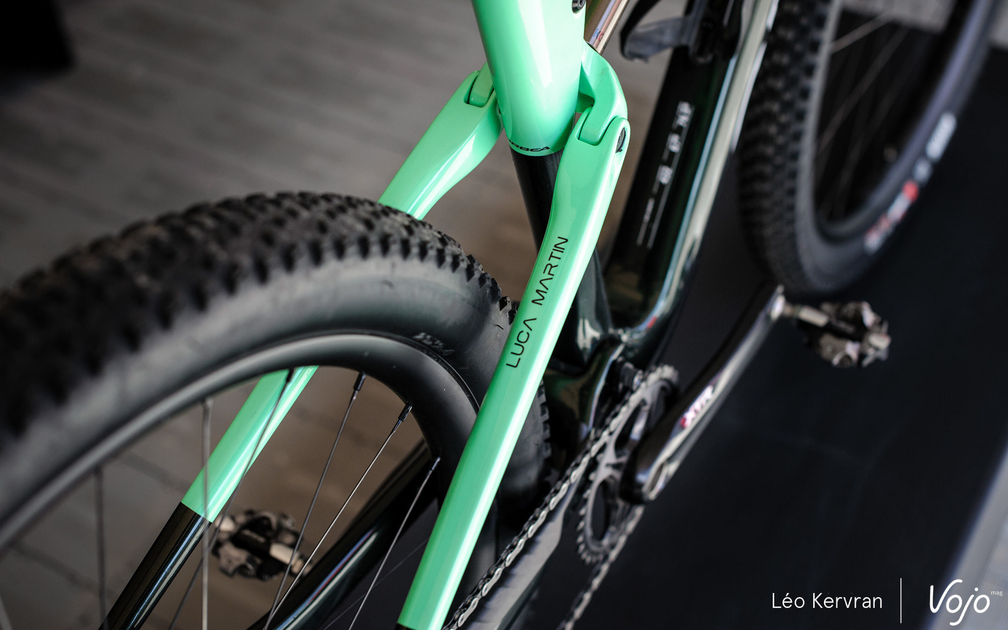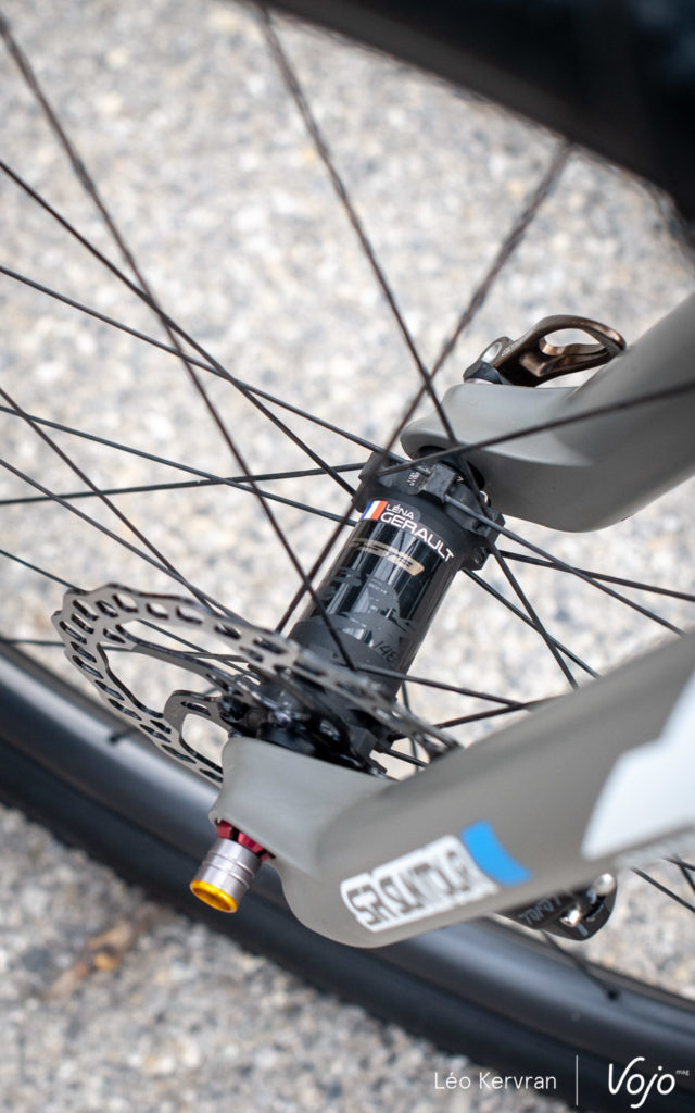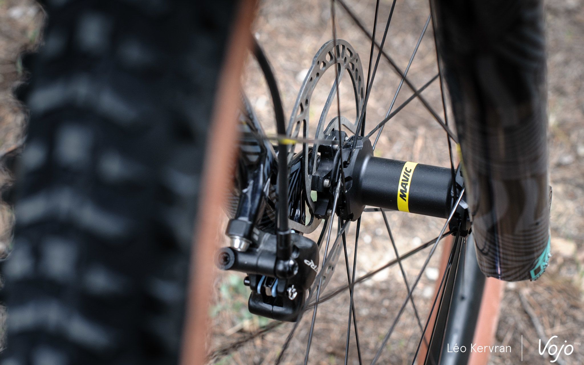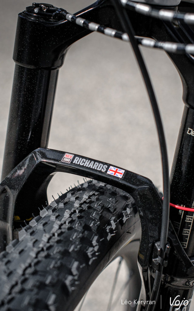 Roues Mavic Crossmax SL Ultimate et pneus prototypes Hutchinson pour le train roulant. Le dessin des pneus est celui des Skeleton, ce qui signifie que la nouveauté se cache soit dans la carcasse soit dans la gomme.