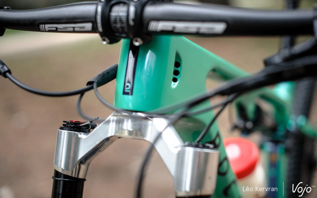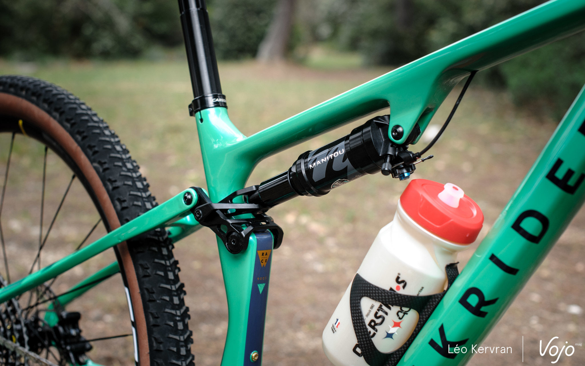 Un peu d’insolite côté suspensions puisque c’est Manitou qui s’occupe d’amortir le vélo. C’était un des principaux axes de travail cet hiver, nous a expliqué Théo Mougenel, l’un des mécaniciens de l’équipe.