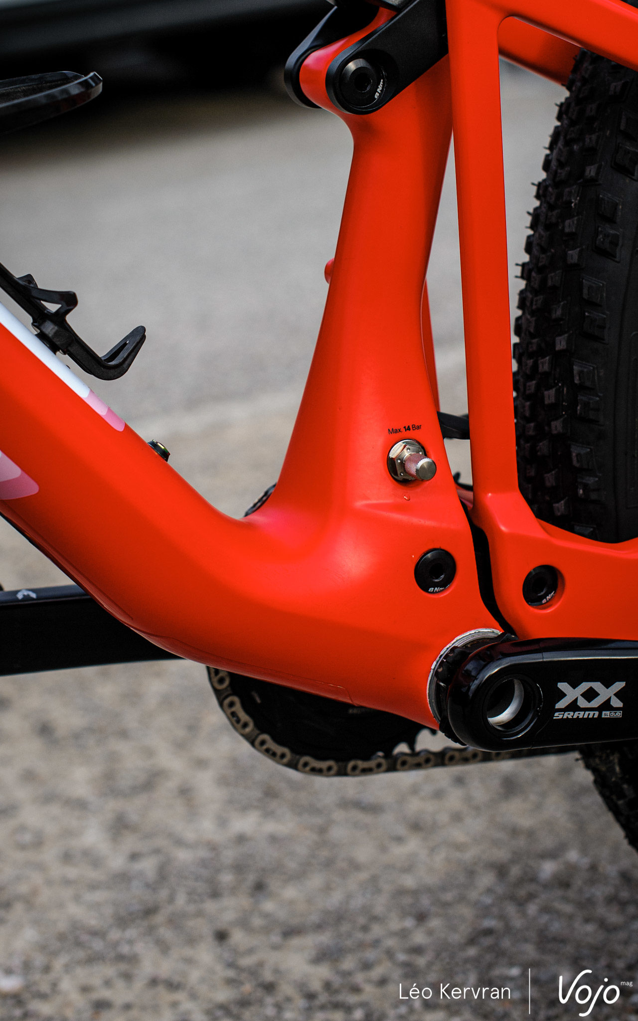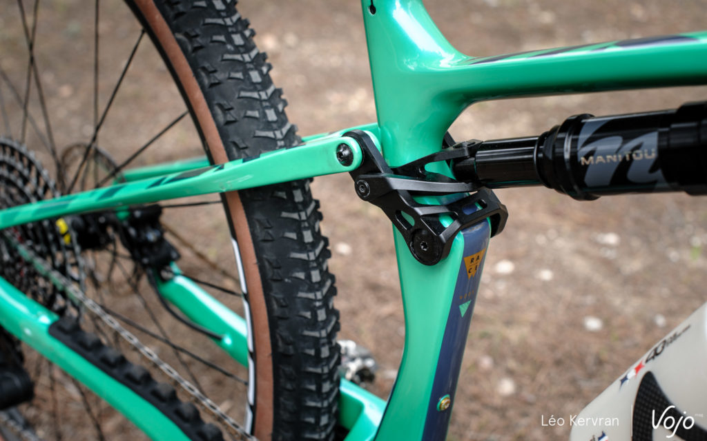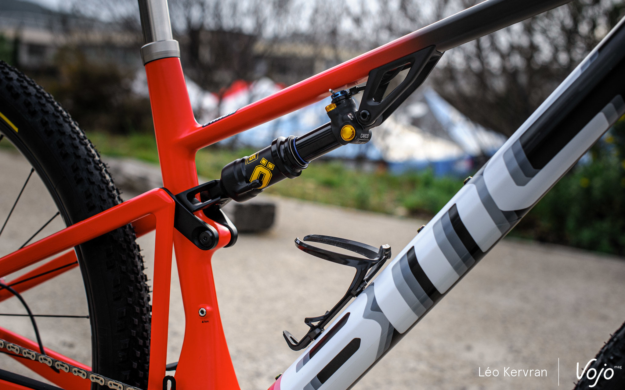 D’après ce qu’on a pu apprendre, le cadre est annoncé à 1 540 g et le châssis est conçu autour d’un débattement de 120 mm à l’avant comme à l’arrière. On remarque un imposant pontet de rigidification entre les haubans, pas si courant en XC.