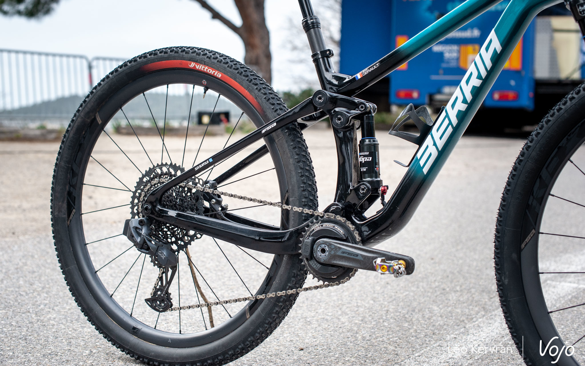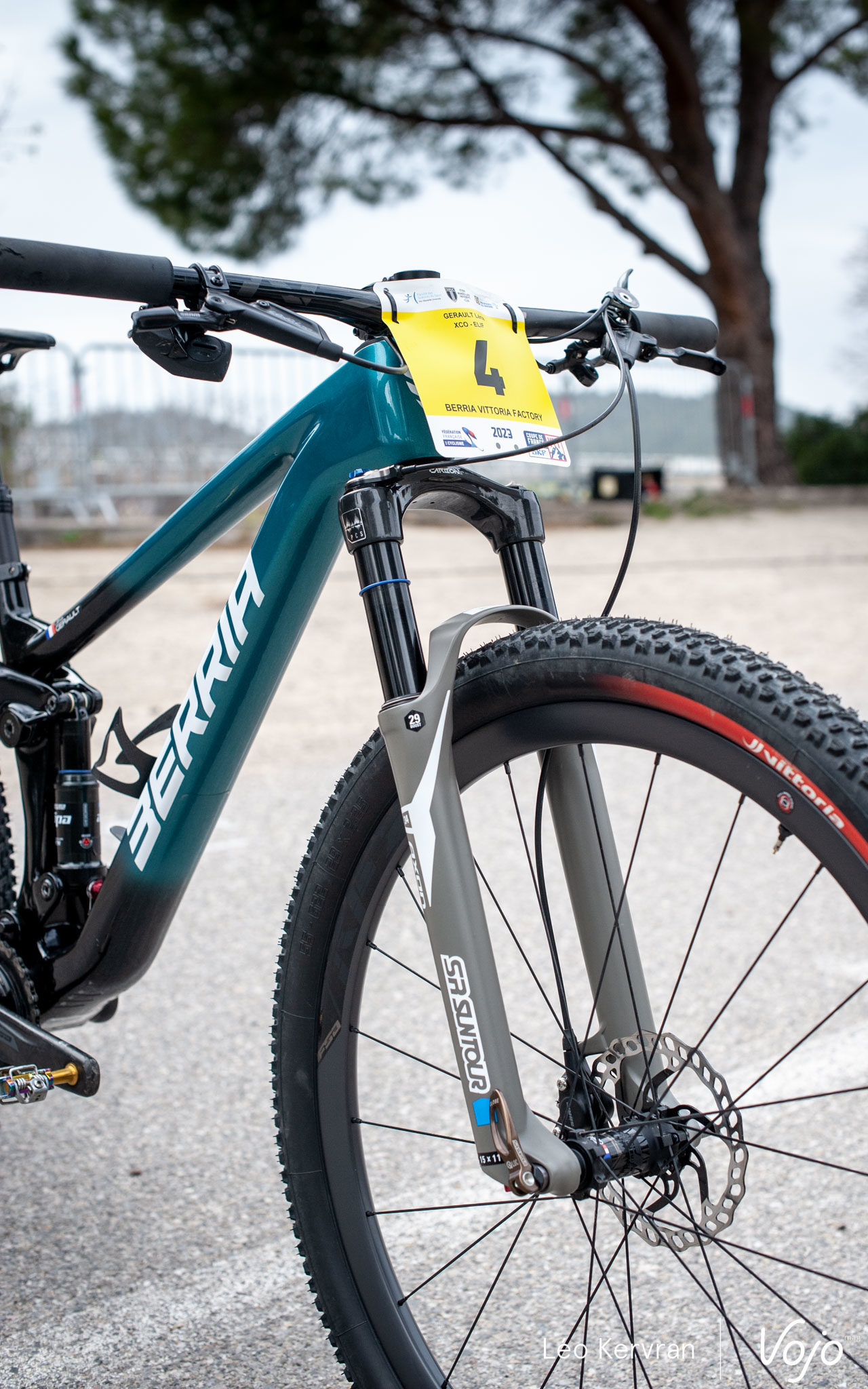 Surprise sur la transmission, c’est un dérailleur Sram GX Eagle AXS avec patte de dérailleur qui équipe le vélo. Le team manager Jérôme Dericbourg nous explique qu’ils ont reçu les nouveaux groupes au moment de partir pour Marseille et comme on ne monte pas une nouveauté le jour de la course, ils sont restés à la maison. Sur les prochaines courses, on devrait bien voir les Berria Mako avec du XX SL en prise directe .