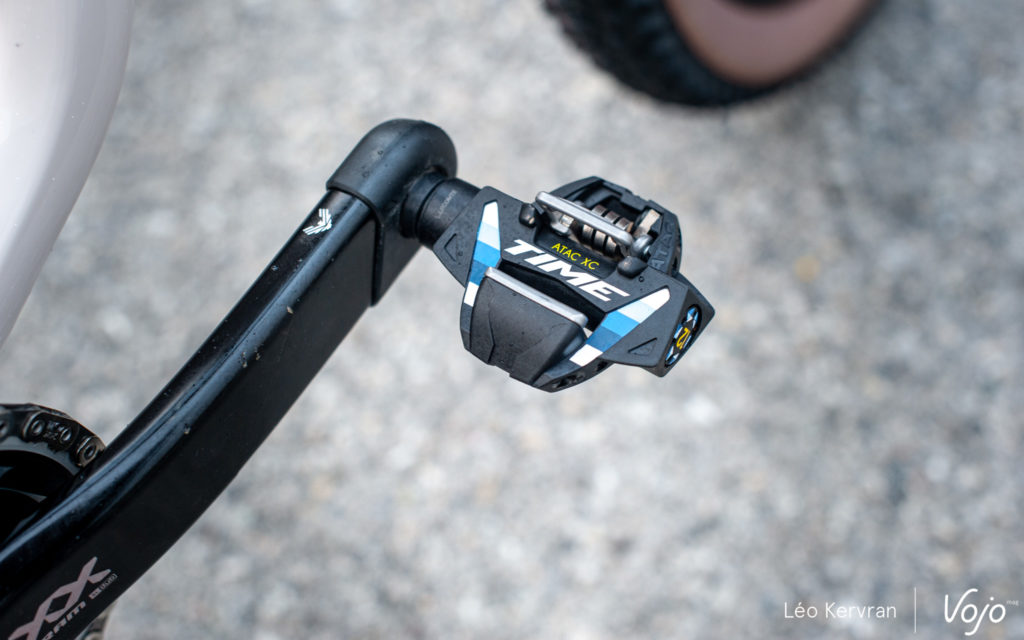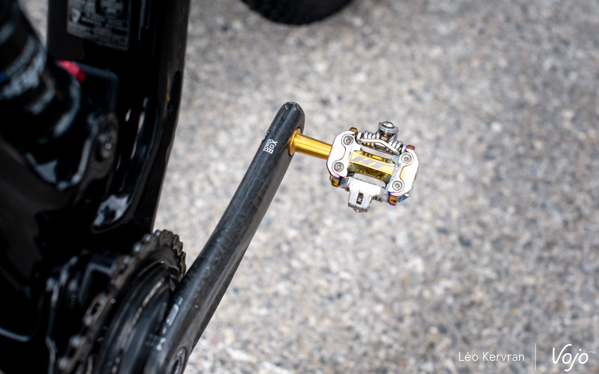 Il fallait bien une petite touche pour rappeler son titre européen et c’est au niveau des pédales qu’on la trouve, avec une paire de Time Atac XC 12 customisées aux couleurs du maillot bleu et blanc.