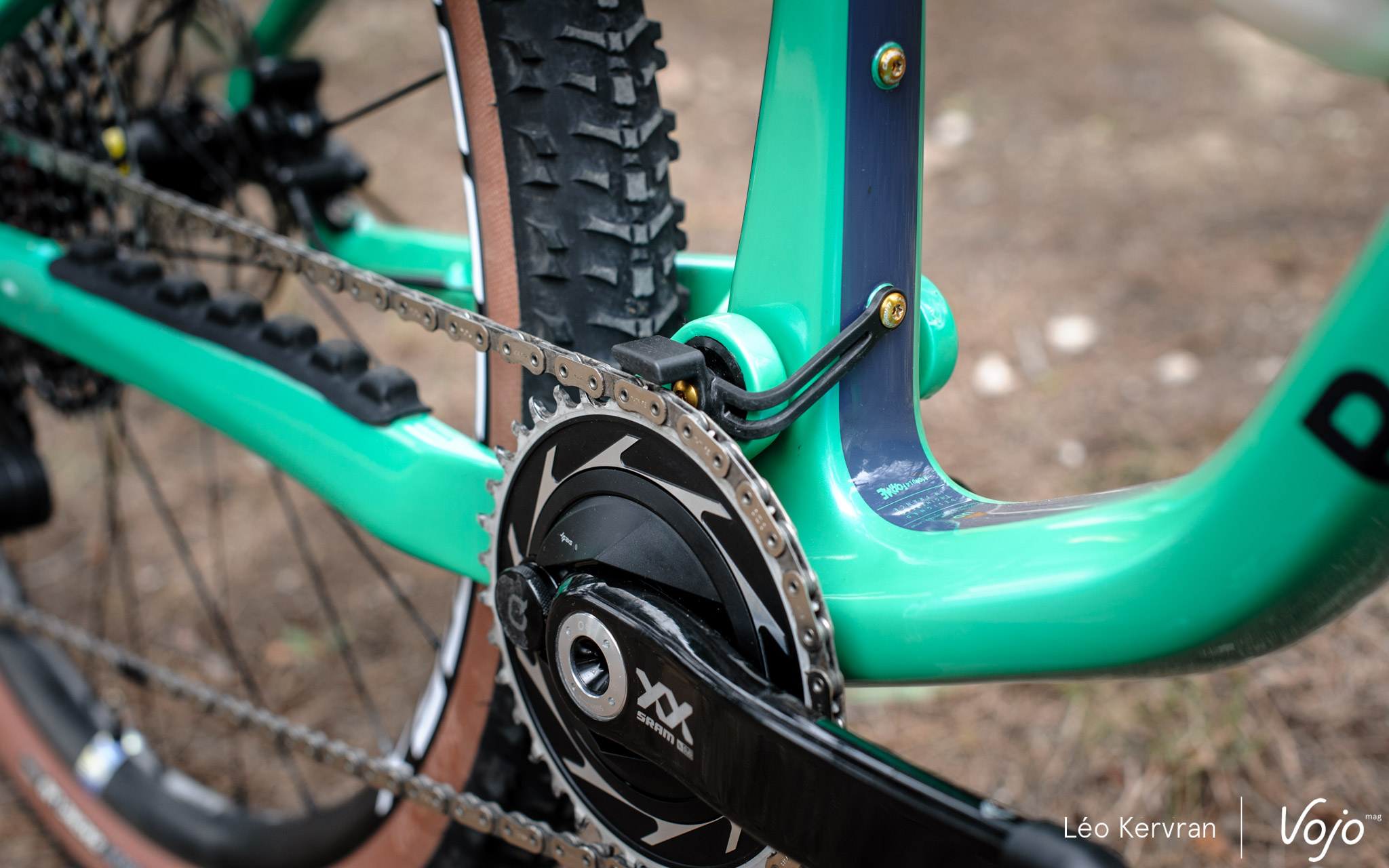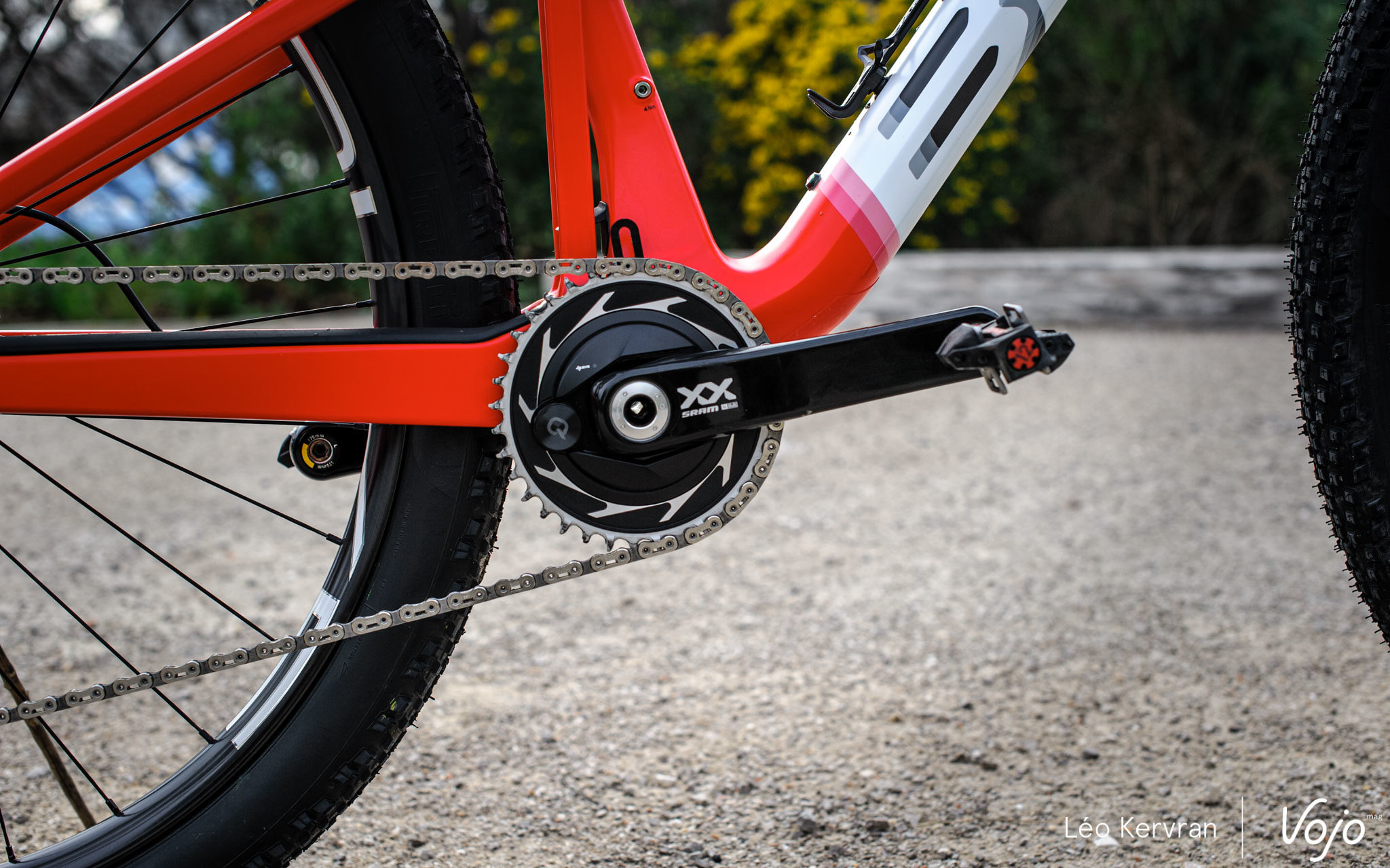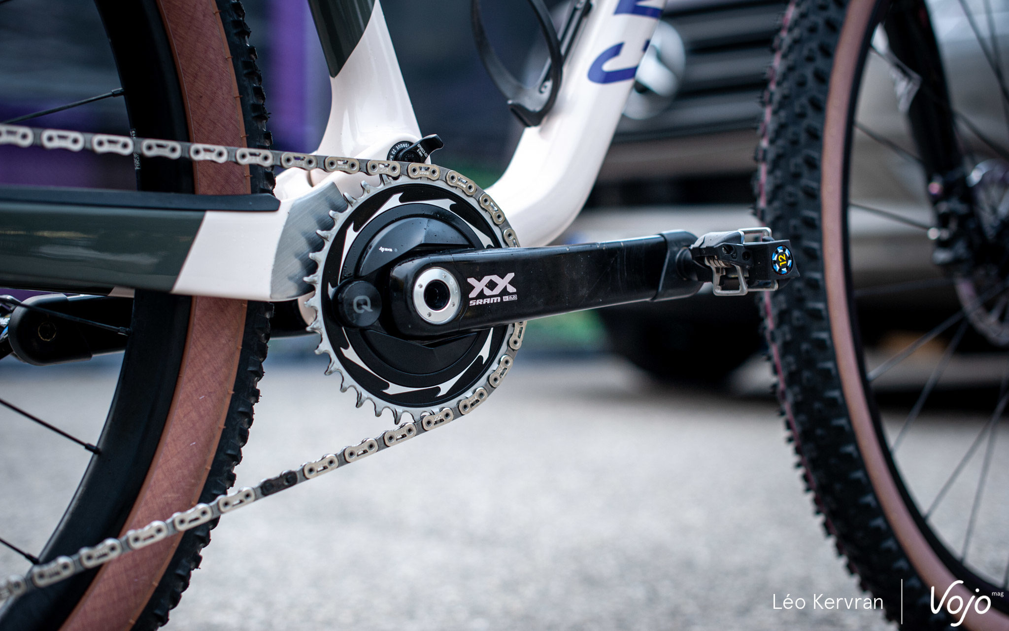 A peine sorti officiellement et déjà présent sur la course ! Le nouveau groupe Sram XX SL, qu’on vous présentait en début de semaine (lire Reportage | Sram Eagle AXS 2023 : entrée dans un nouvel âge), est partout chez les grandes équipes du paddock. Du côté de Loana Lecomte, on a opté pour le pédalier avec capteur de puissance intégré et un plateau de 34 dents.