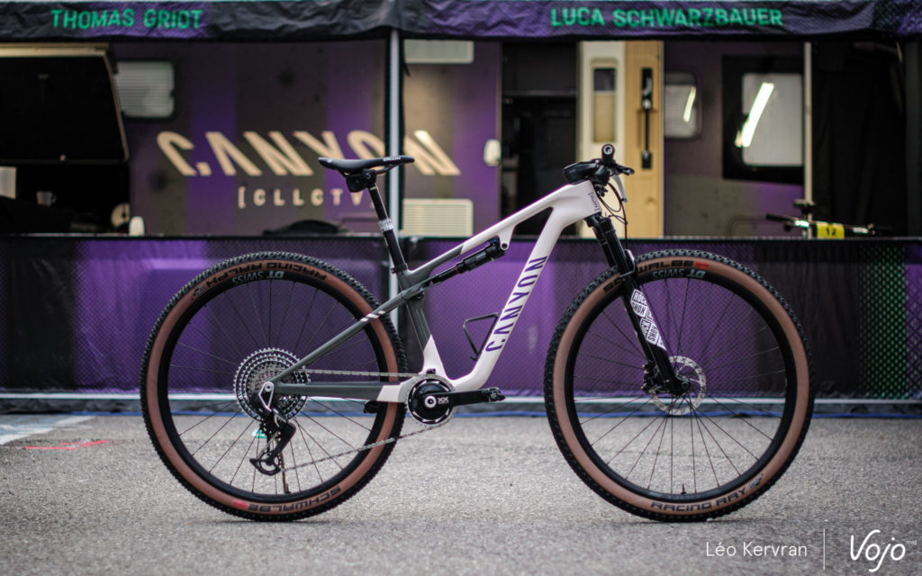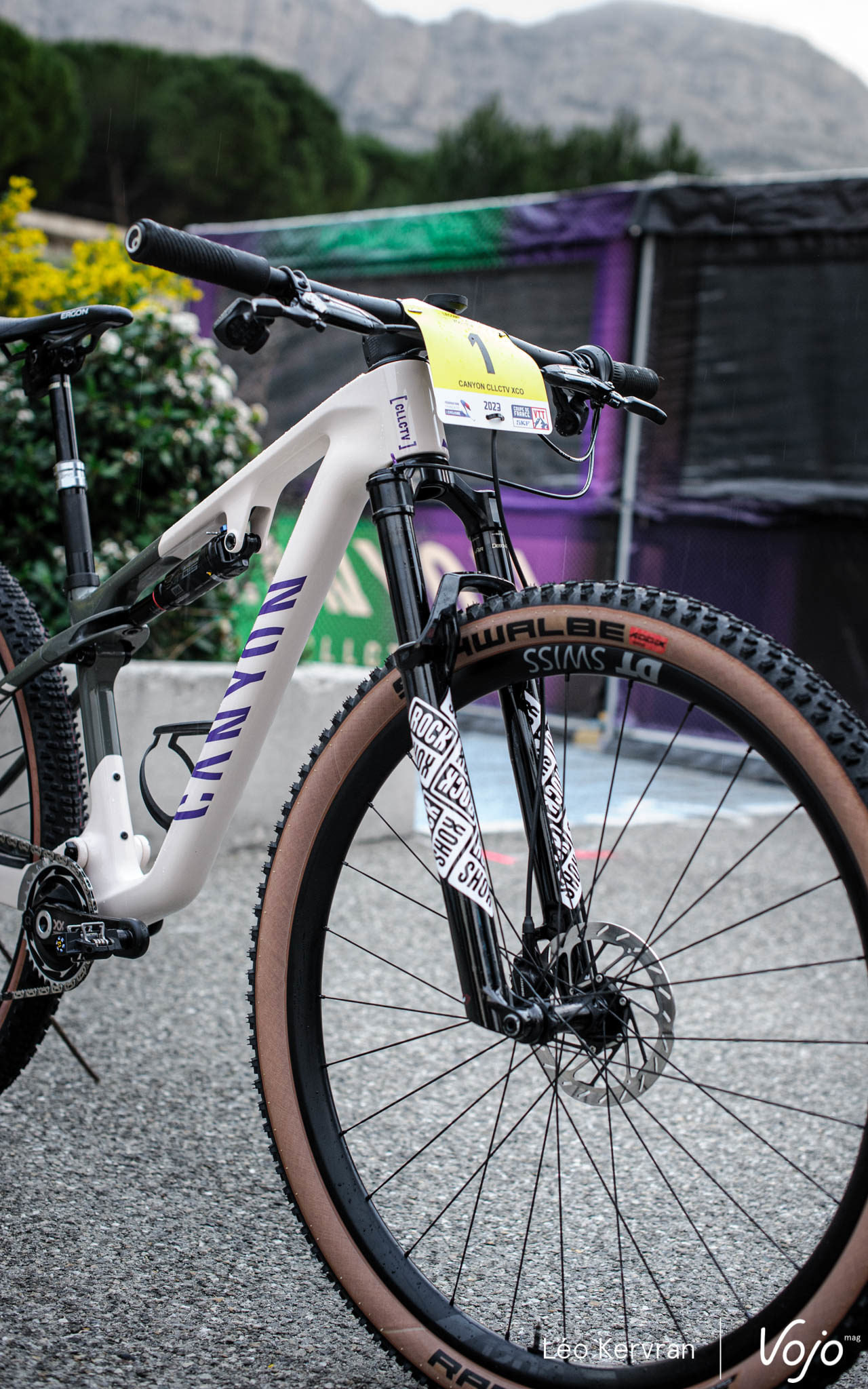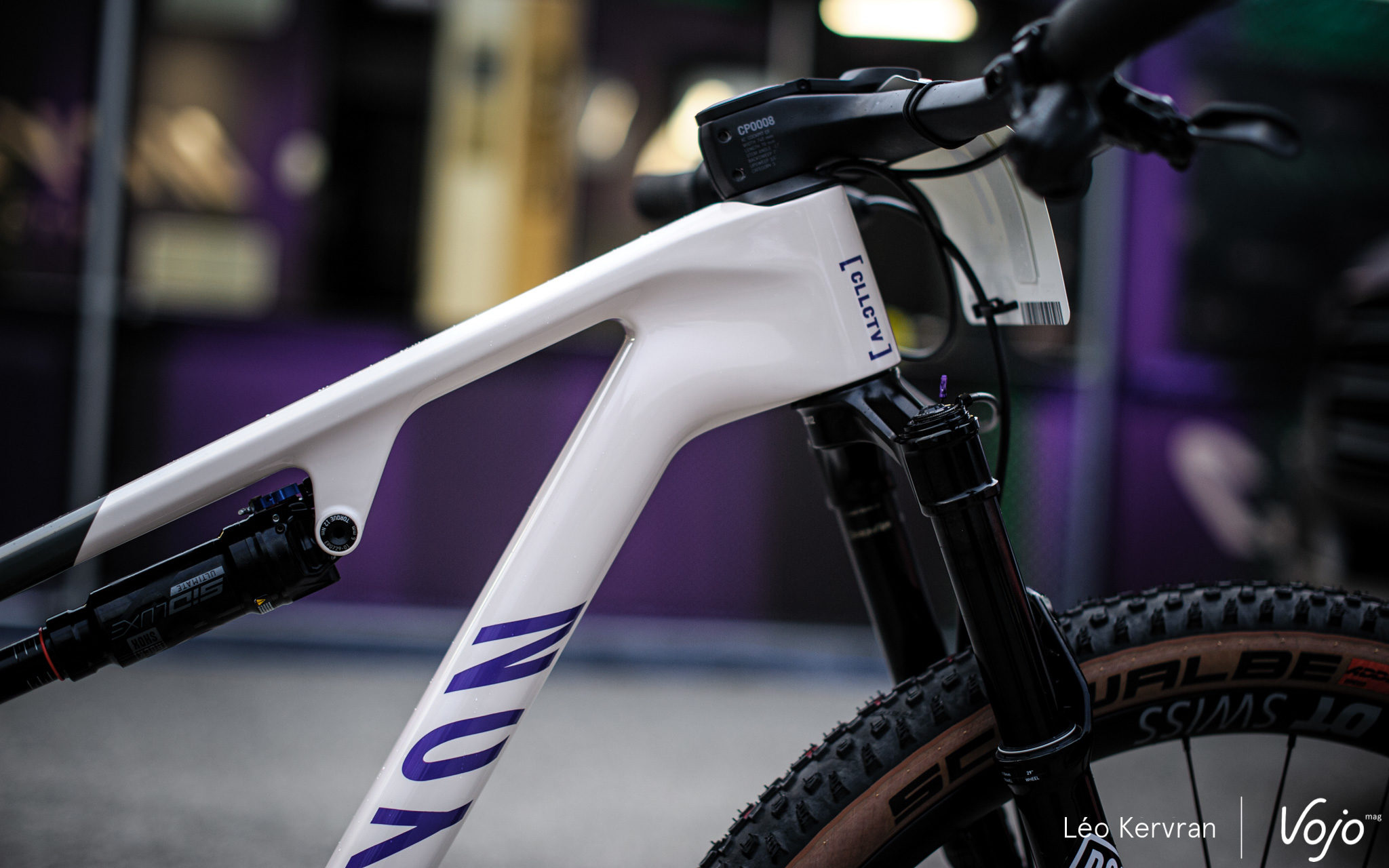 Equipé par Sram de la tête aux pieds ou presque, le Canyon Cllctv XCO participe aussi au développement des produits et sur le vélo, on découvre une fourche prototype qui pourrait bien préfigurer la future SID. On remarque entre autres un té allégé et une nouvelle cartouche, baptisée Charger Race Day 2.