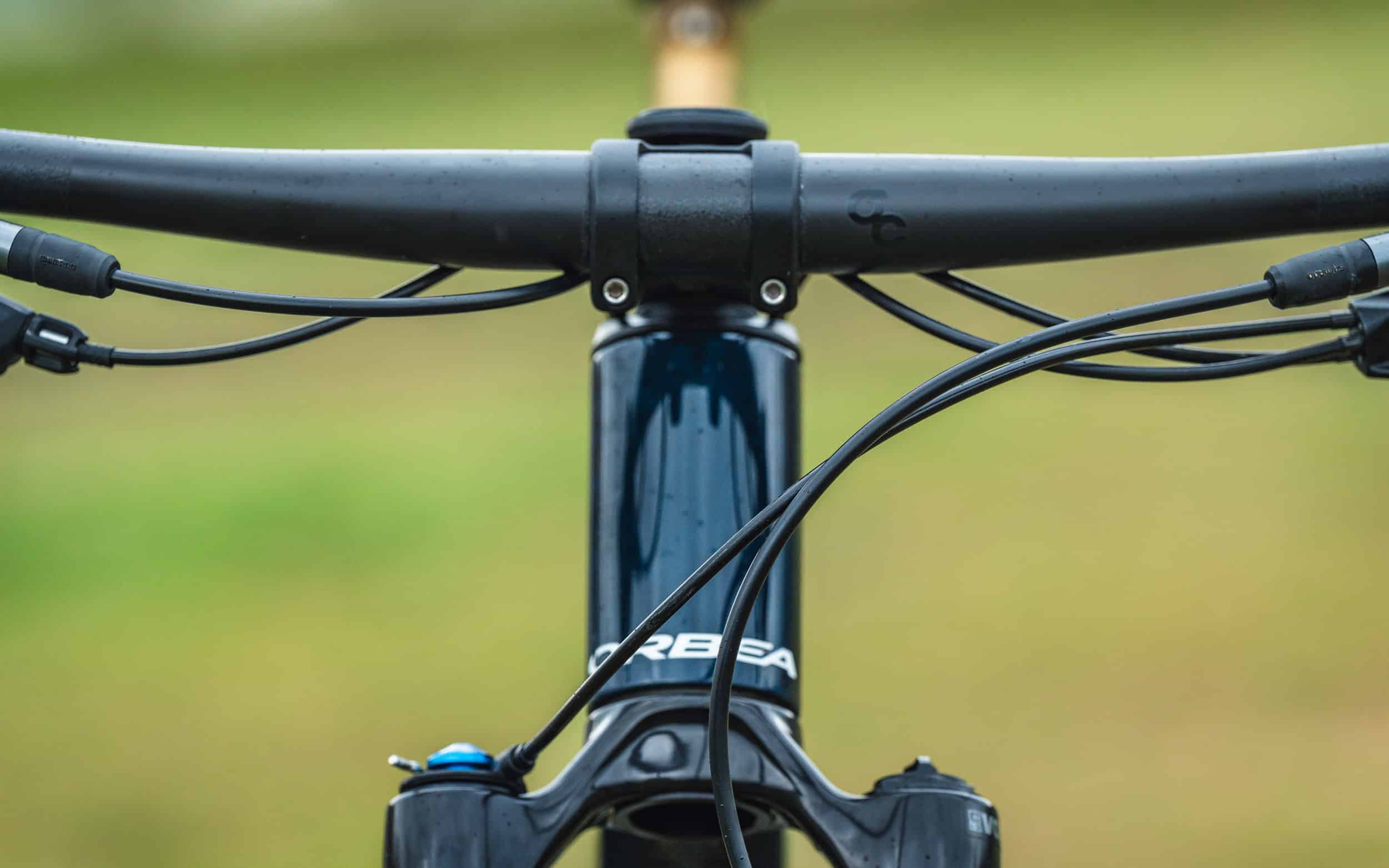 Le poste de pilotage est maison, avec un ensemble OC (pour Orbea Components) dans lequel on retrouve un cintre en carbone de 760 mm de large, et une potence en alu affichant un angle de -10°.