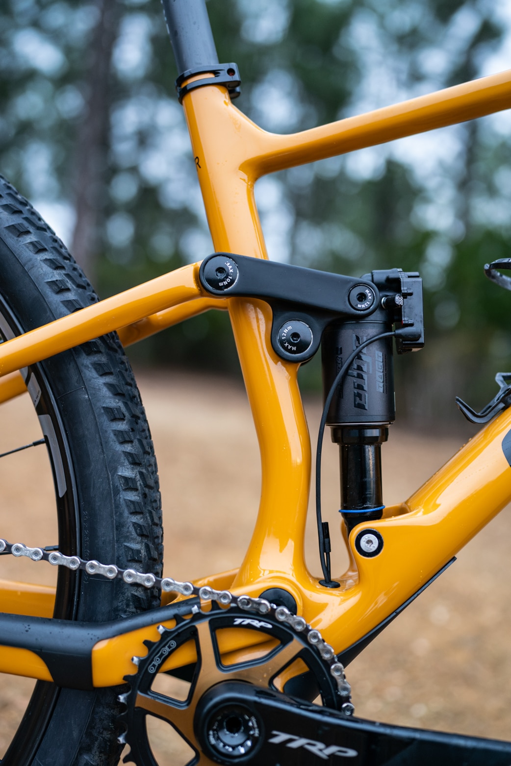 On retrouve un combo de suspensions de chez Fox, à savoir un amortisseur Float SL et une curieuse Fox 34 que l’on avait déjà aperçue sur le vélo de son ex-coéquipier Luca Martin.