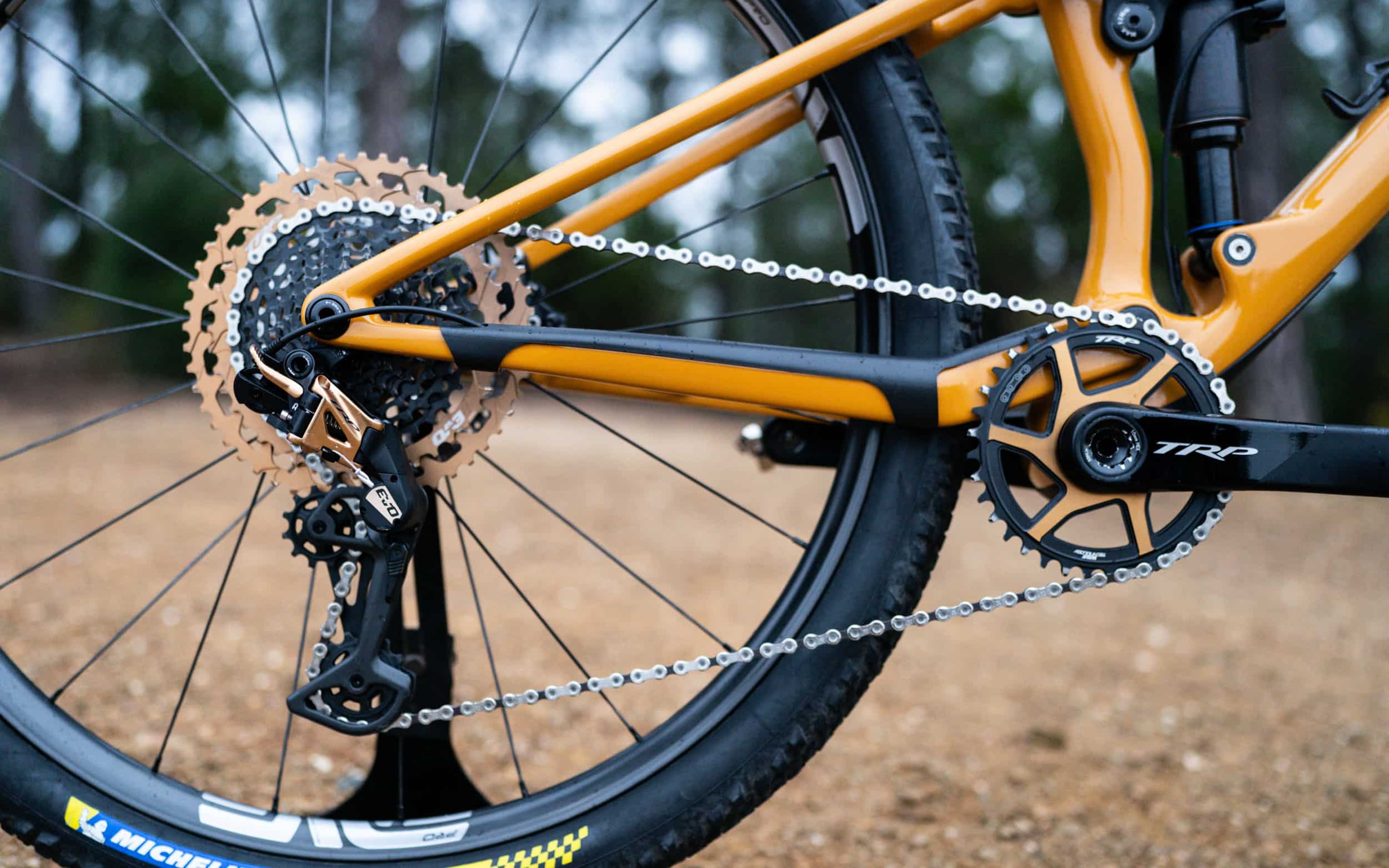 Ici aussi, on retrouve des suspensions pilotées électroniquement avec un duo Flight Attendant de chez RockShox. La transmission est aussi estampillée Sram, avec un groupe T-Type AXS XX SL, équipé d’un capteur de puissance au niveau du plateau.