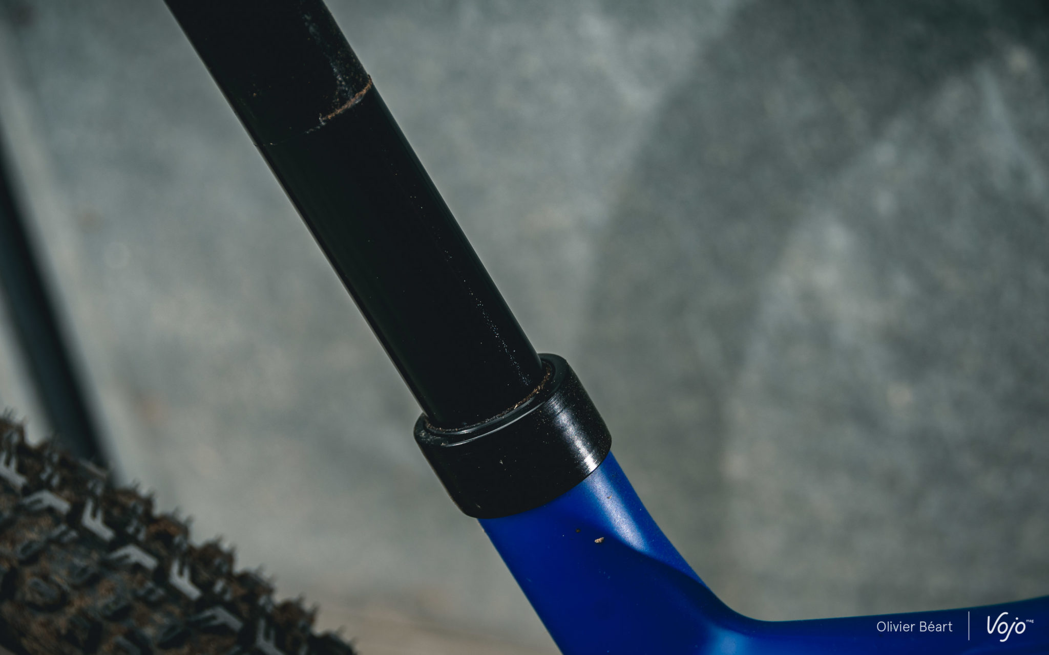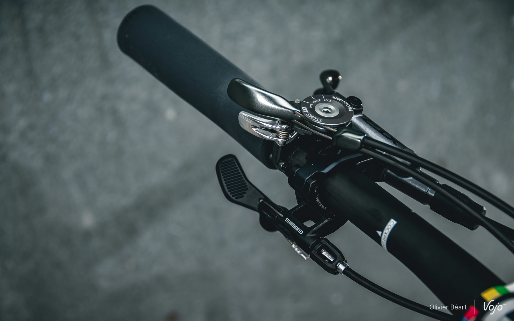 On note aussi la présence d’une nouvelle potence maison, très légère mais surtout qui reste bien rigide. Sur un vélo en taille M, elle mesure 60mm et 70 sur un L.