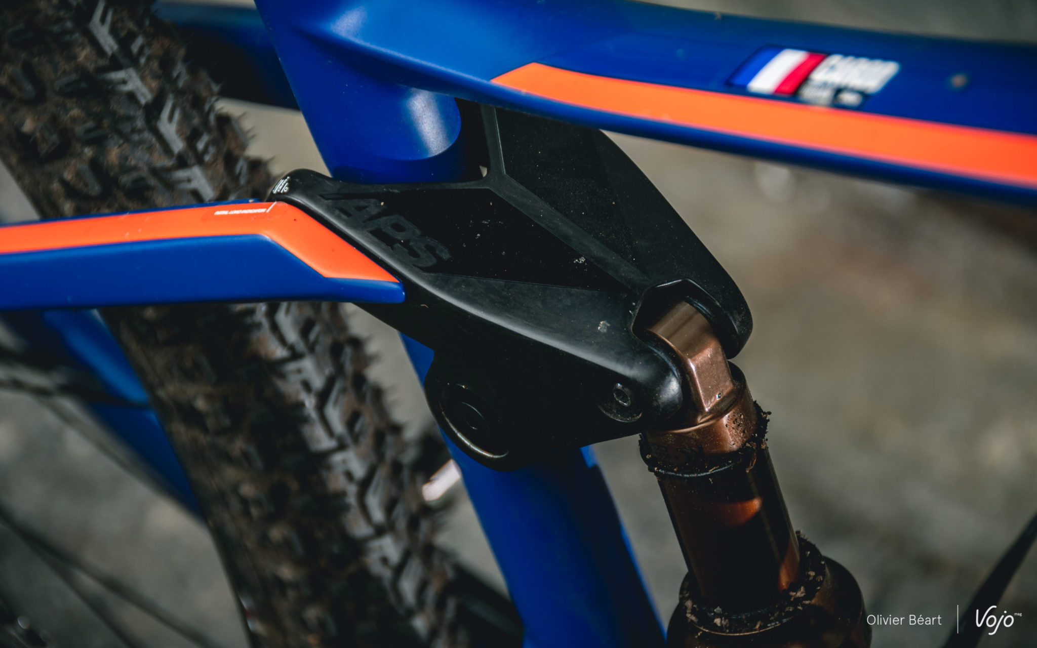 Le principe de suspension, lui, ne change pas. BMC reste attaché à son système APS, qui a été légèrement retouché. Il adopte une biellette supérieure en carbone et un amortisseur à fixation Trunnion sur le bas, plus rigide.
