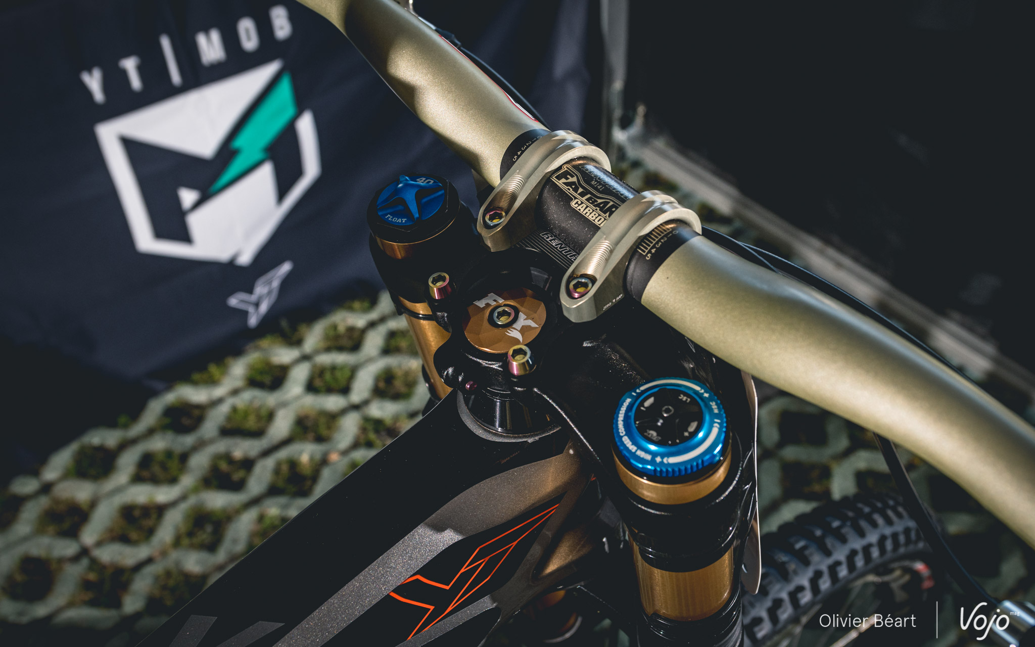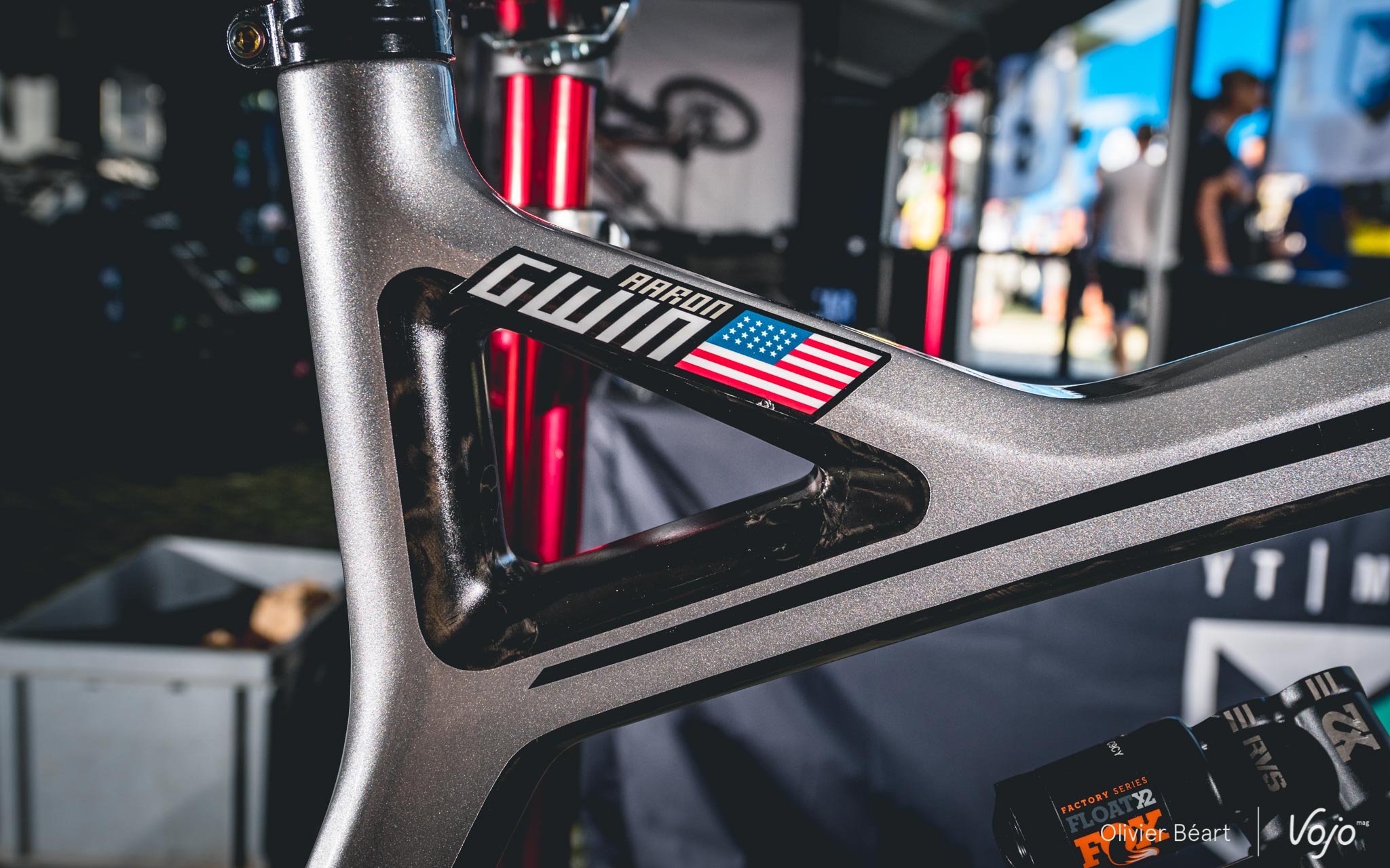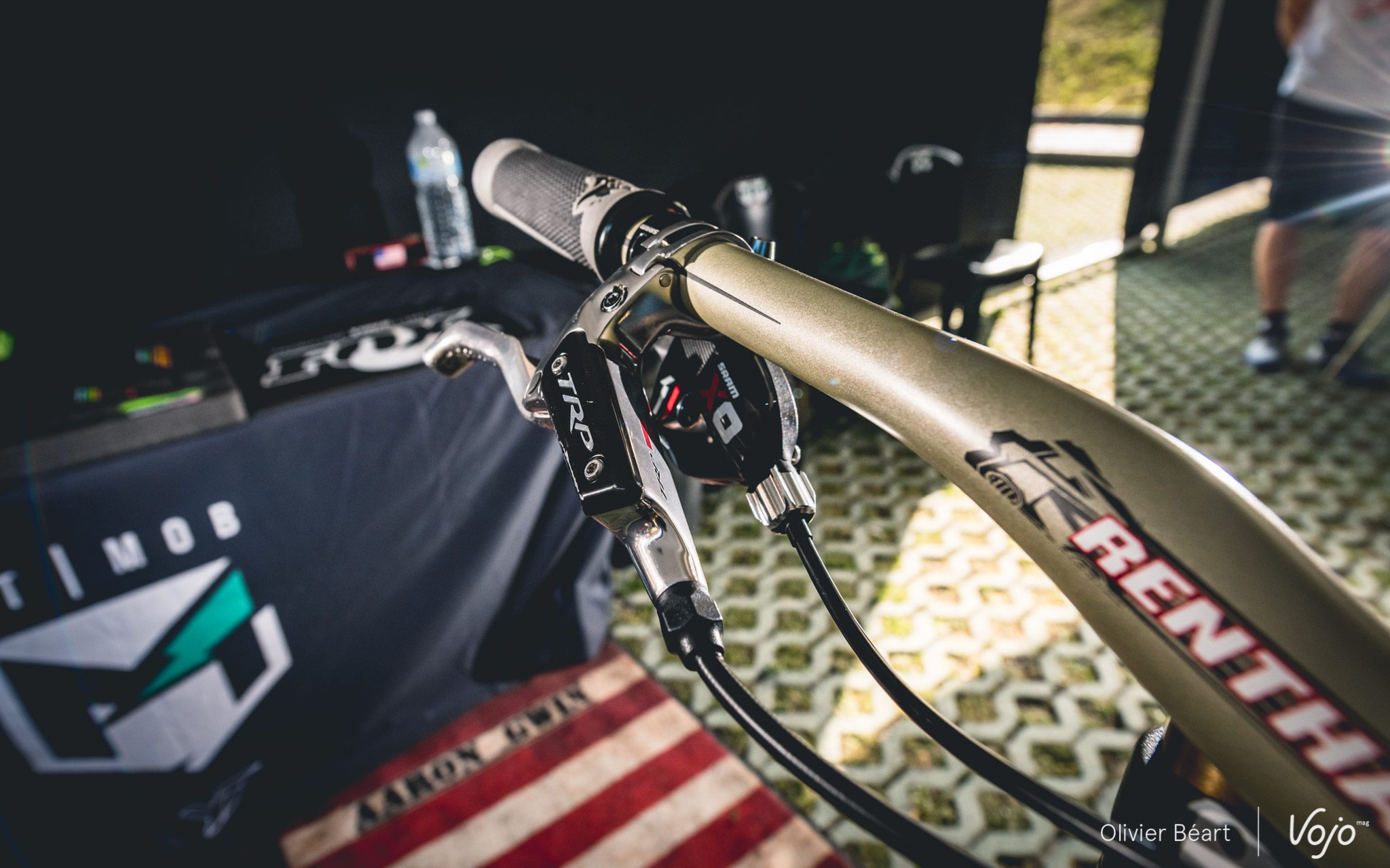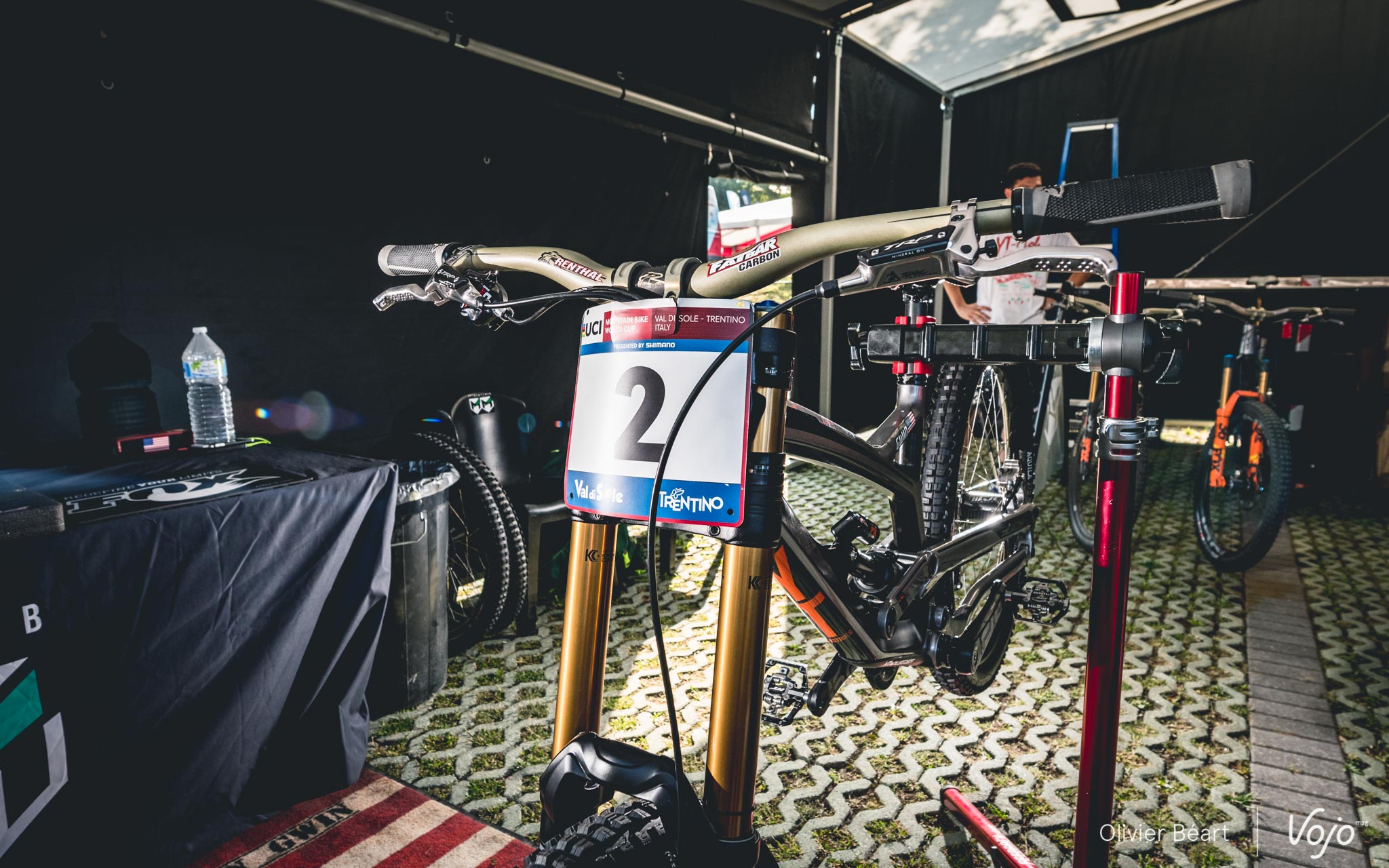 Aaron Gwin roule avec un cintre de 785mm et 30mm de rise. Quelques heures après notre passage, la plaque n°2 va être remplacée par un beau n°1 à la faveur de sa victoire à Val di Sole et des déboires de Greg Minnaar.