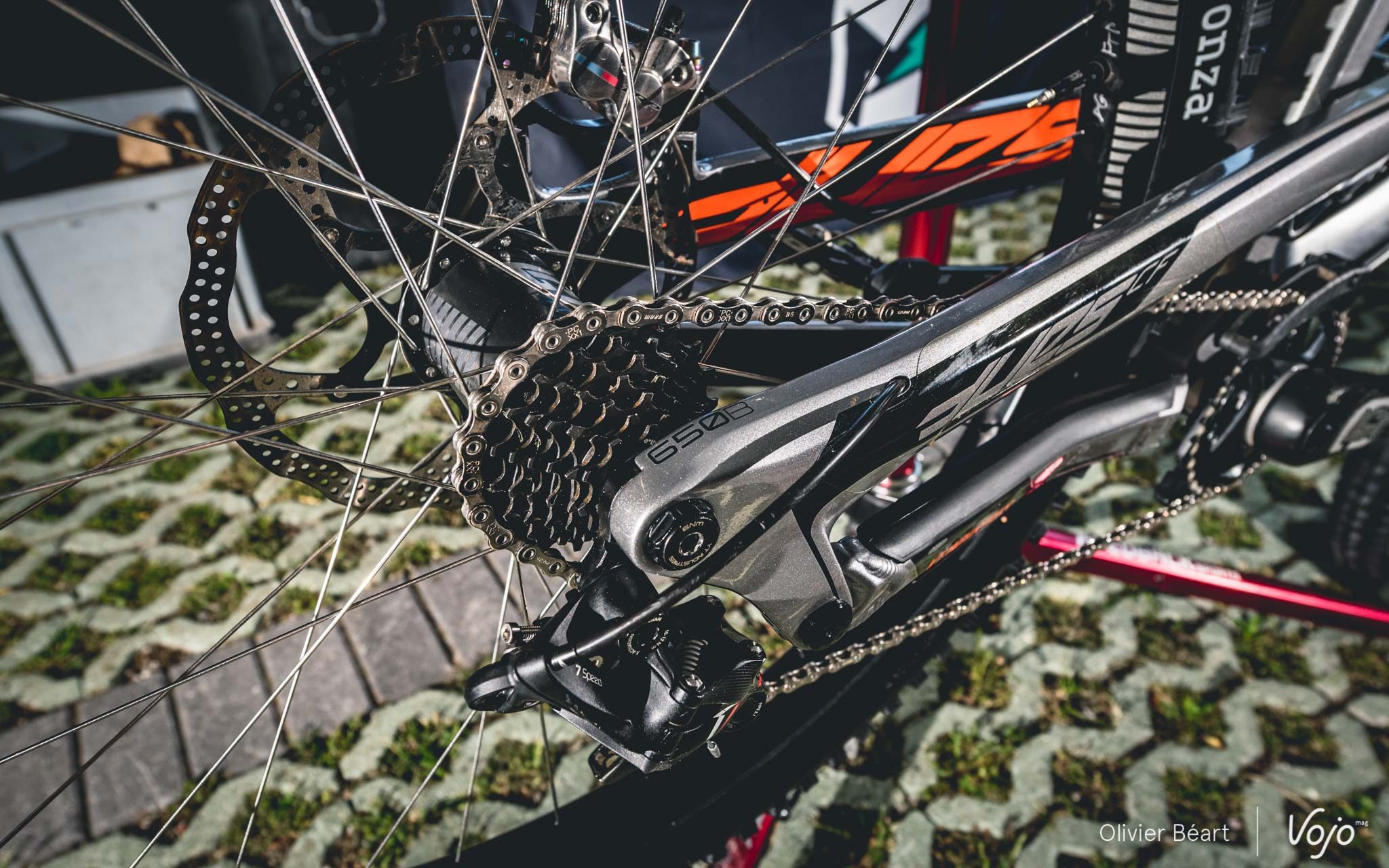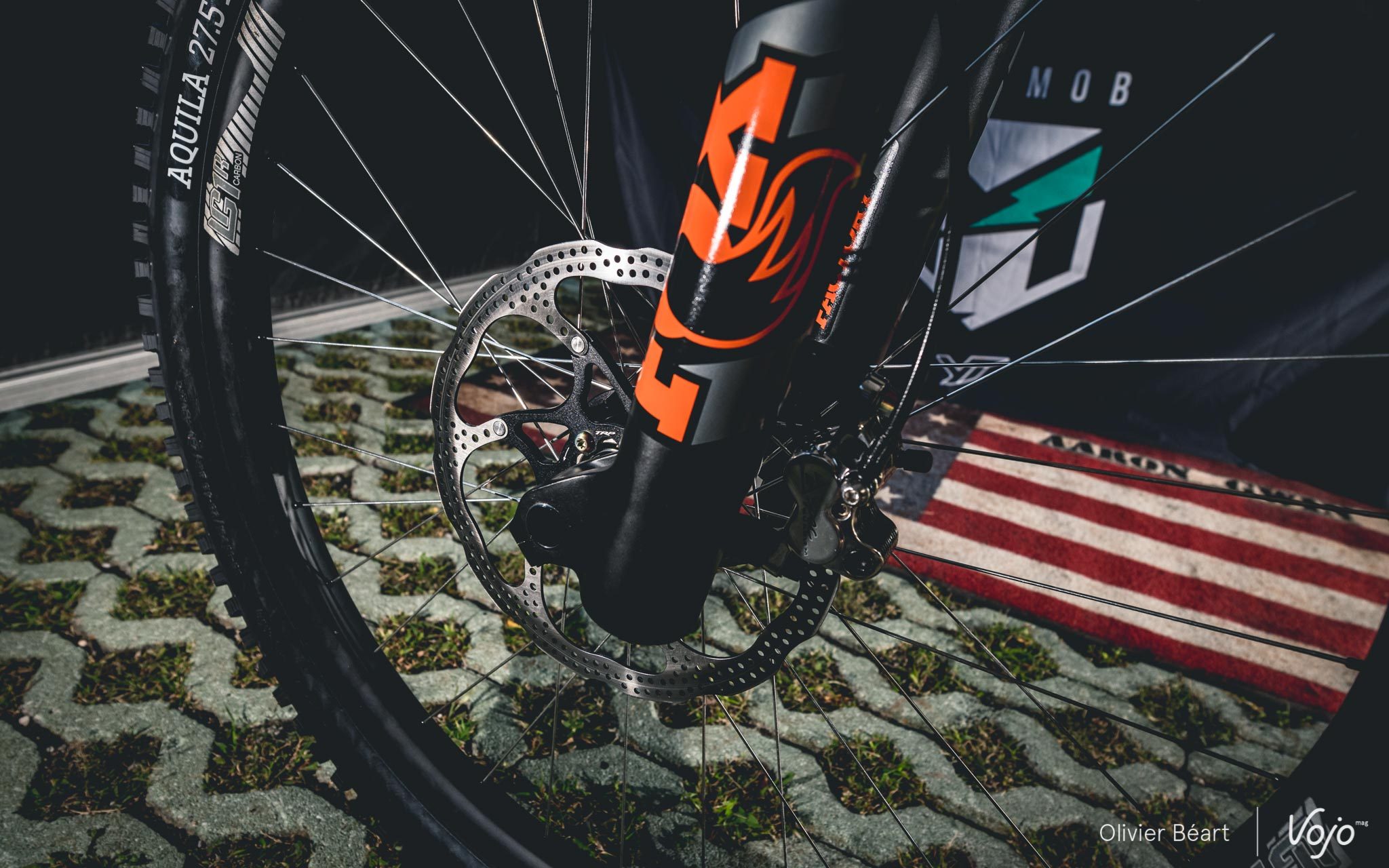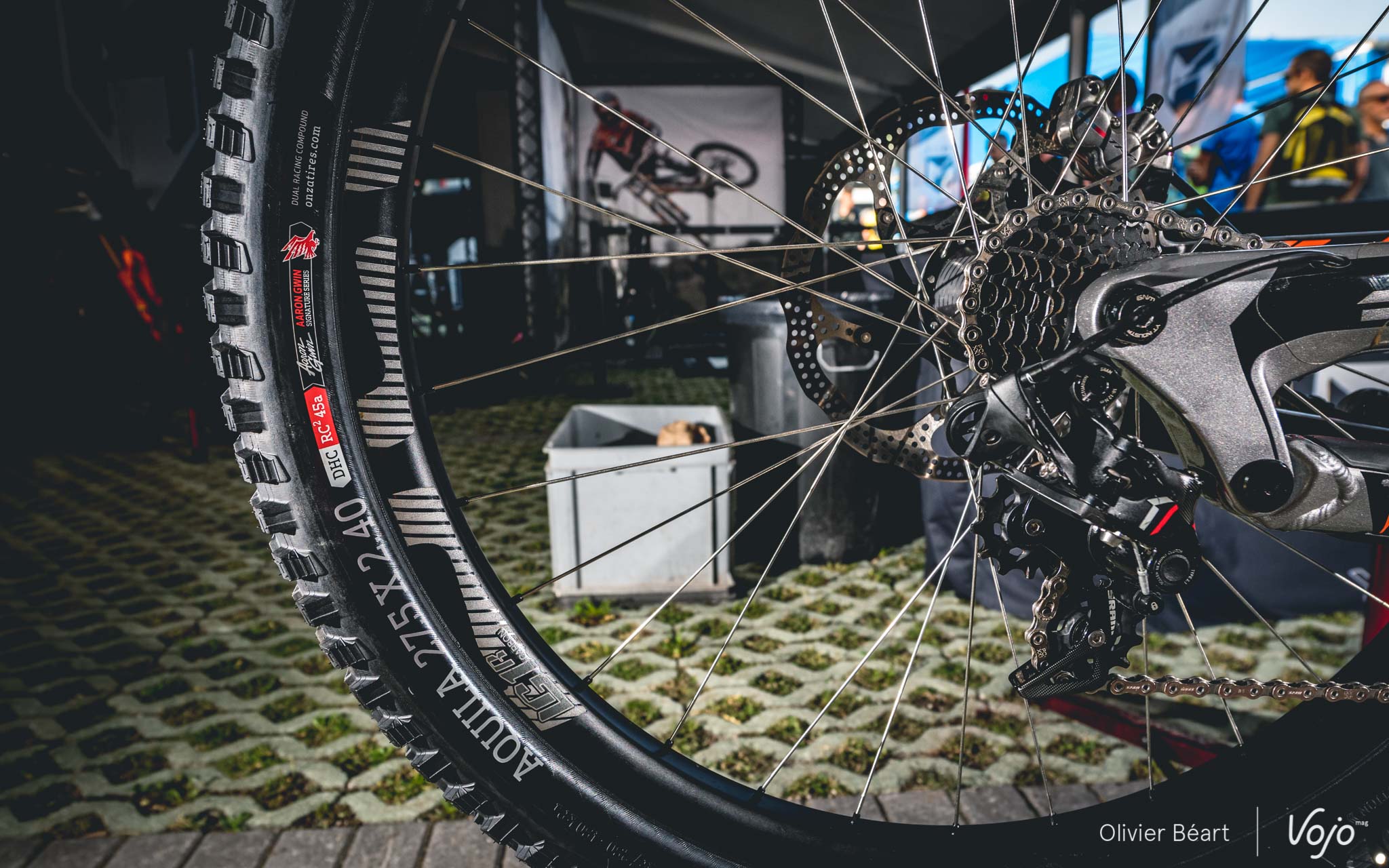 Les roues font l’objet d’une attention toute particulière. Si les composants de base sont de série (E13 LG1R Carbon), les roues sont montées à la main par le mécanicien d’Aaron Gwin, qui utilise des rayons argentés et pas noirs pour les différencier des versions de série. Les pneus sont des Onza Aquila en 27,5×2.4 (oui, Aaron Gwin est resté fidèle aux « petites » roues), des pneus qu’il a contribué à développer. La gomme est en 45a, soit très tendre, avec une bande de roulement un peu plus dure (55a).