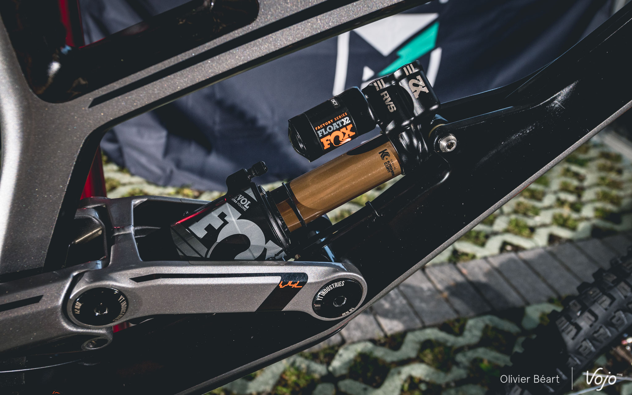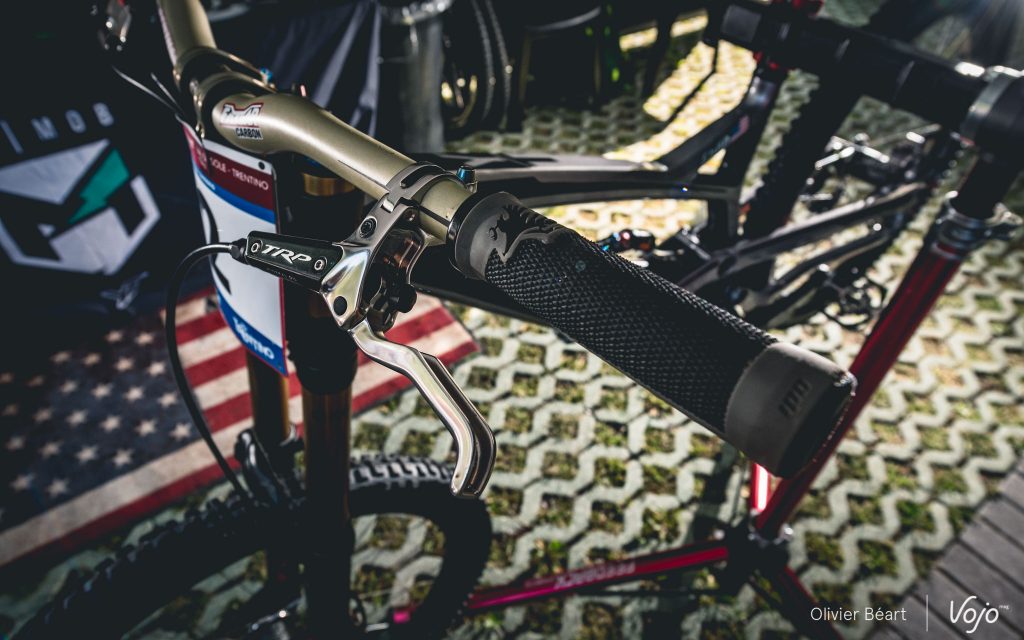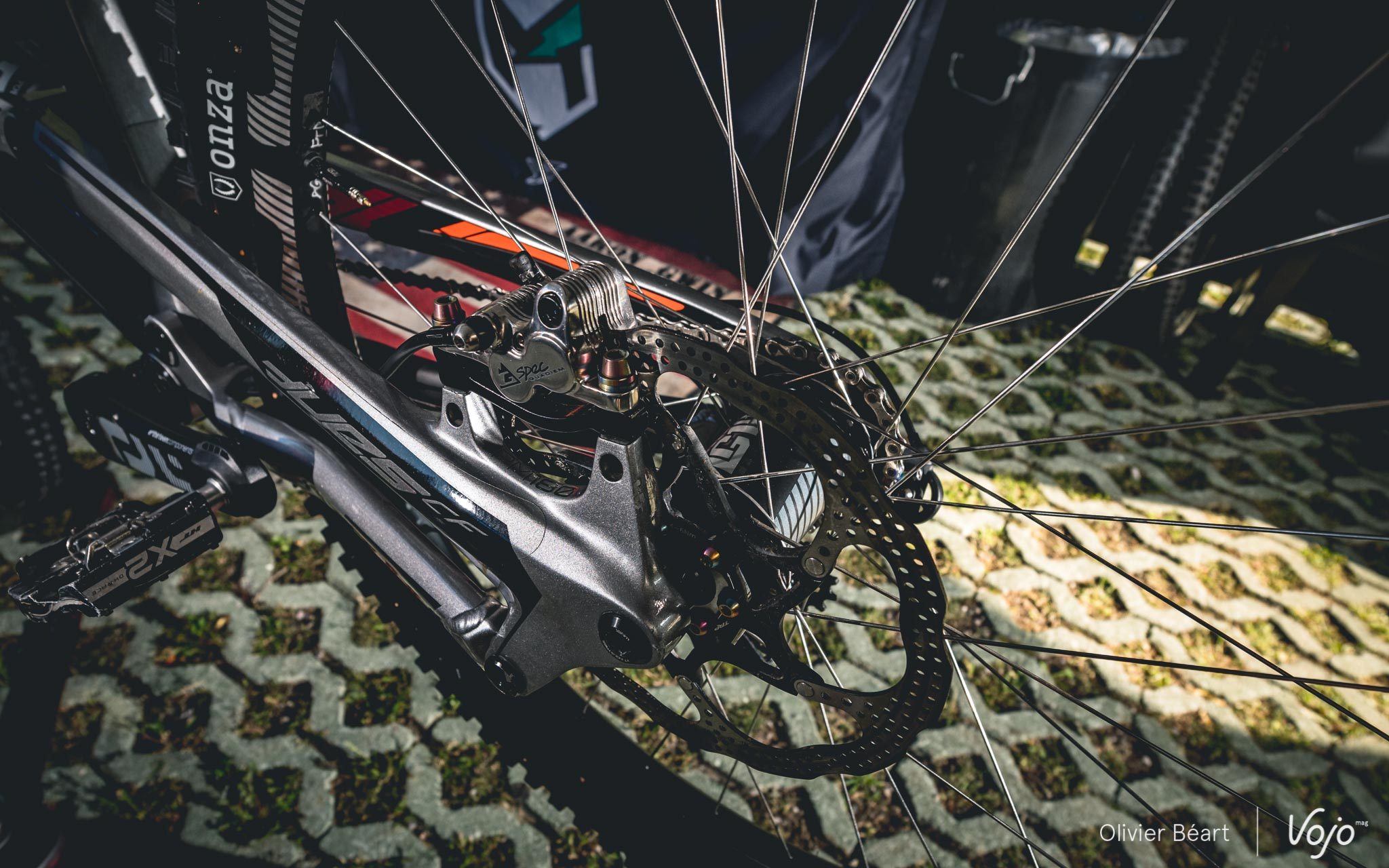Bien entendu, les suspensions font l’objet d’une attention toute particulière. Aaron Gwin est connu pour rouler avec des suspensions assez dures, mais ici à Val di Sole, cela semblait moins le cas vu la longueur et le caractère exigeant de la piste. Il a choisi un amortisseur à air, qui semble avoir ses faveurs en ce moment même s’il a aussi roulé en ressort par le passé. Impossible de connaître les réglages précis, cela fait partie des petits secrets de l’équipe.