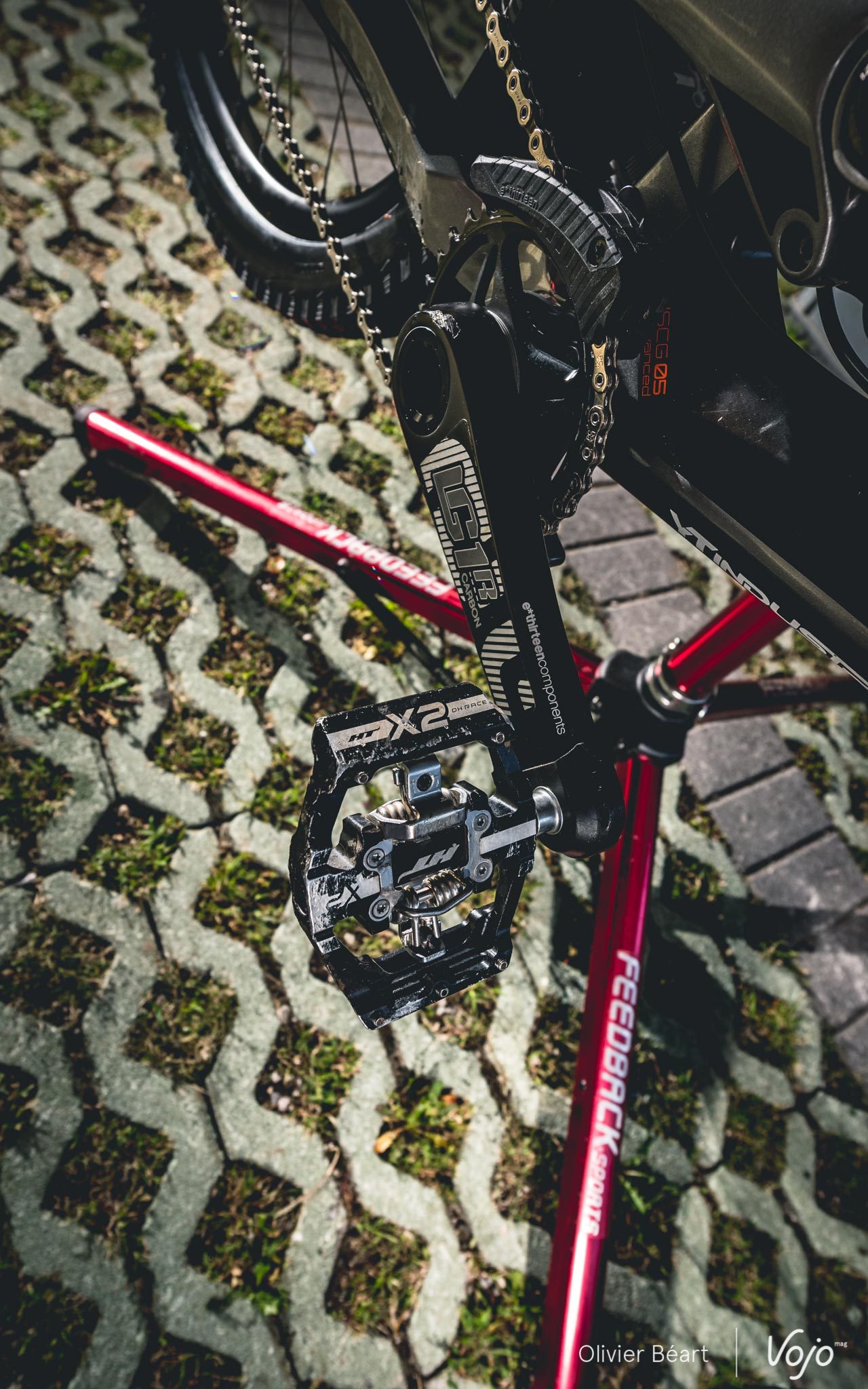 Si le dérailleur est un Sram XO1 DH, le reste de la transmission du YT Tues d’Aaron Gwin est confiée à E13. On trouve le pédalier carbone et la cassette 7 vitesses en dentures 9-21. Les pédales sont des HT X2.