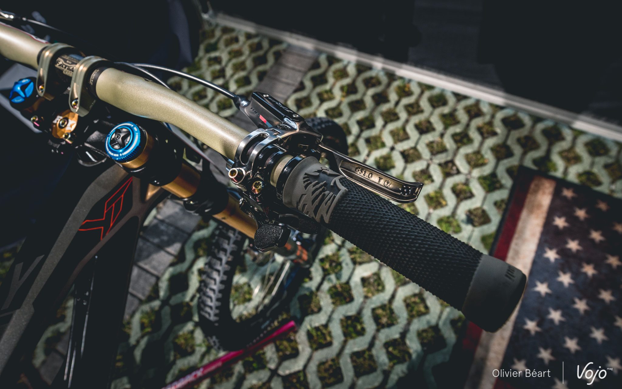 En y regardant d’un peu plus près, on voit que la commande de vitesses reçoit de petits morceaux de papier de verre pour être sûr de toujours avoir un grip parfait et de ne louper aucun changement de rapport. Ici aussi, la visserie titane est partout. Les grips sont des ODI dessinés spécialement pour le pilote : des Aaron Gwin Signature.