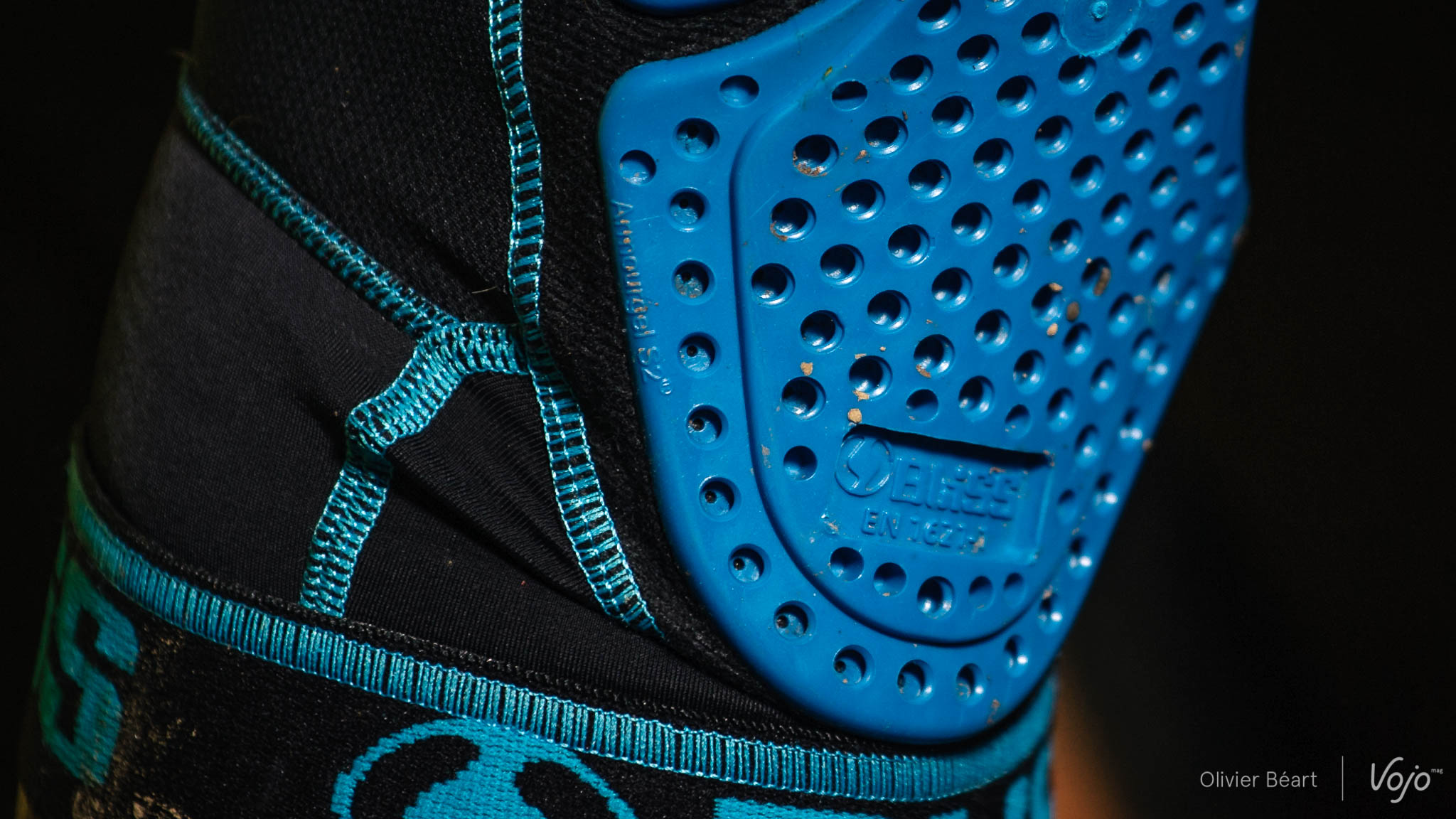 Bliss profite également d’un autre avantage de l’Armourgel : il peut être placé directement sur le textile. Ce qui permet de proposer des modèles très simples et légers, comme la gamme Minimalist dont nous testons ici les genouillères, mais qui comprend une panoplie presque complète d’équipements de protection. A noter que la marque allemande propose aussi des protections au look plus classique avec ce type d’insert, plus épais et enfermé entre deux couches de tissus pour les pratiques plus engagées.