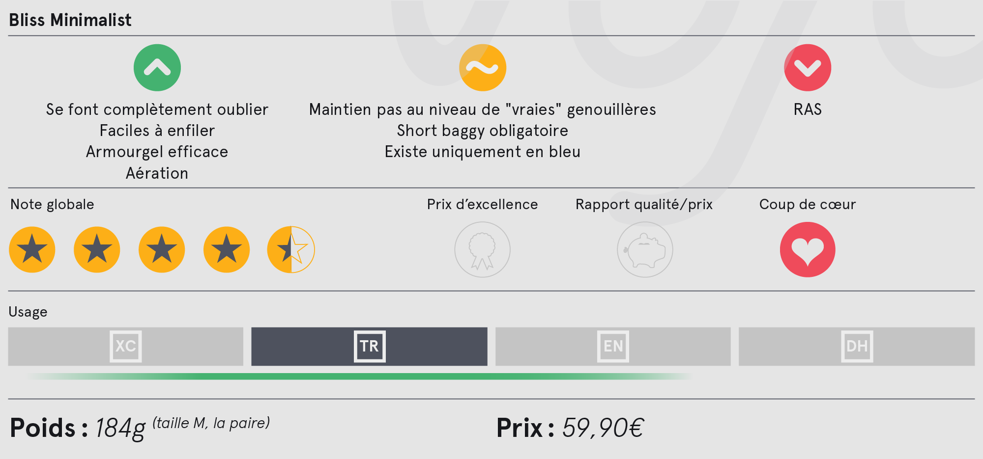 Les genouillères Bliss ont changé notre façon de voir les protections. Loin d’être réservées à un usage engagé, les porter devient vite un réflexe pour toutes les sorties. Après tout, on ne sait jamais, et même si elles n’offrent pas le même niveau de protection que des modèles classiques, c’est nettement mieux que rien du tout ! La seule contrainte qu’elles imposent finalement, c’est de porter un short baggy (façon Fumic ou Fontana) car en prolongement d’un cuissard « moule b… », vous risquez vite de devenir la risée de tout le peloton. Mais si, aujourd’hui, vous attirerez certainement les regards au départ d’une course de XC, notre petit doigt nous dit que les mentalités pourraient bien évoluer très rapidement !