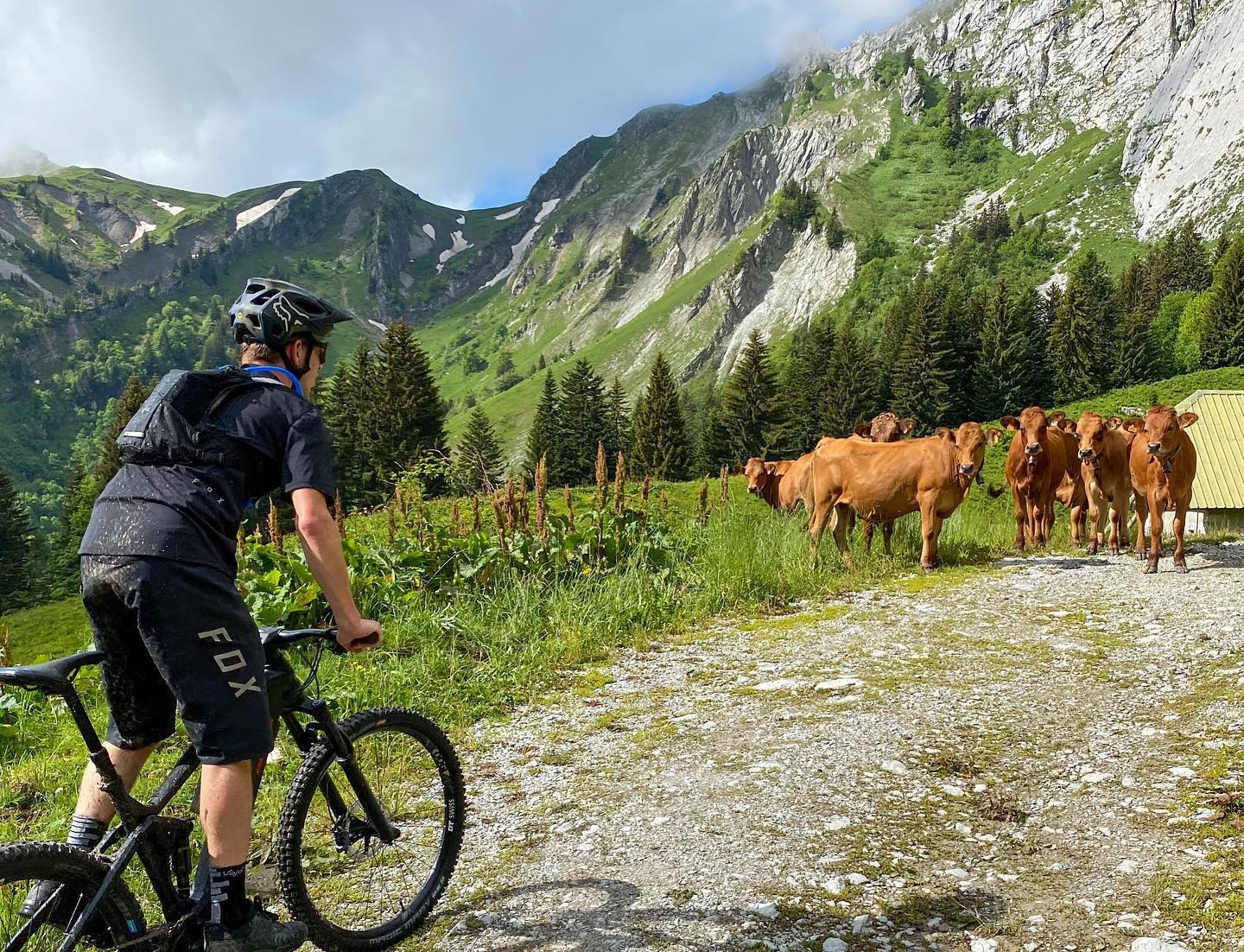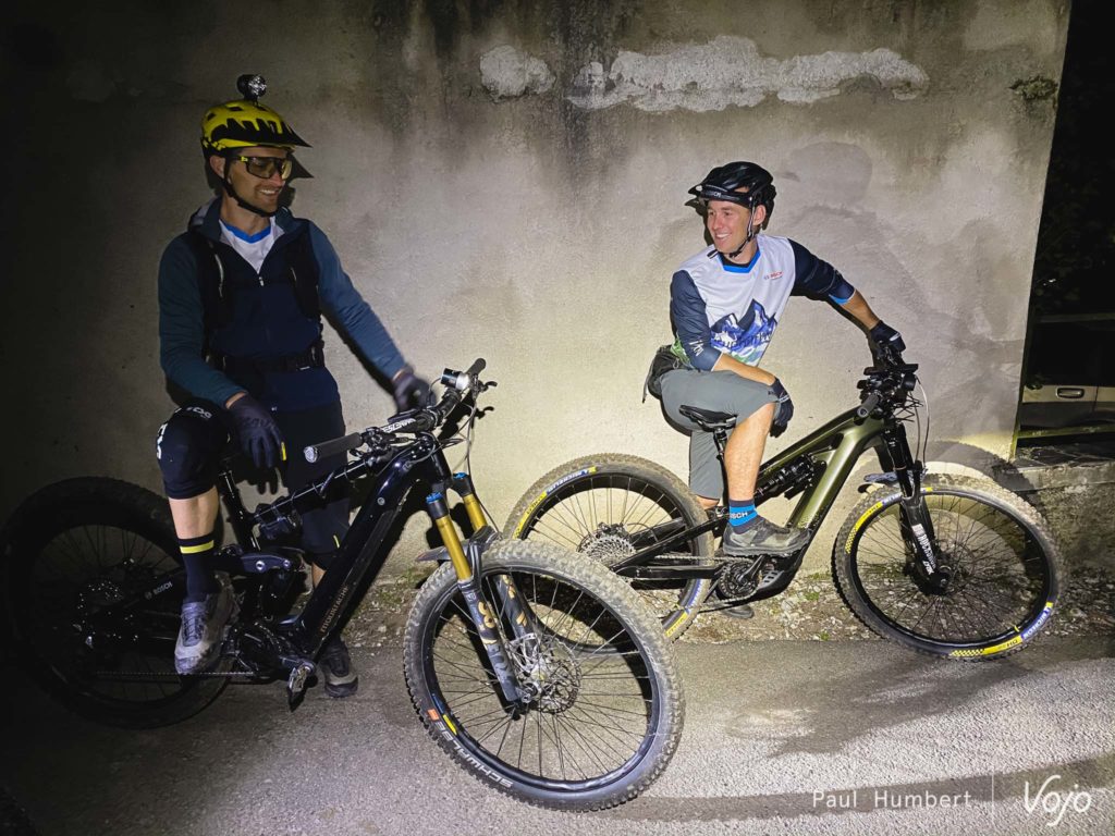 Tout s’explique ensuite avec l’arrivée de Guillaume, qui nous révèle sa surprise : il est venu avec Jérôme Clementz ! Qu’à cela ne tienne : direction le sommet du col de la Forclaz pour profiter des dernières lueurs du jour : le sentier est d’abord raide et permet de sentir, une fois qu’on y fait attention, le gain de couple sur les basses cadences quand on tire un braquet légèrement trop gros.