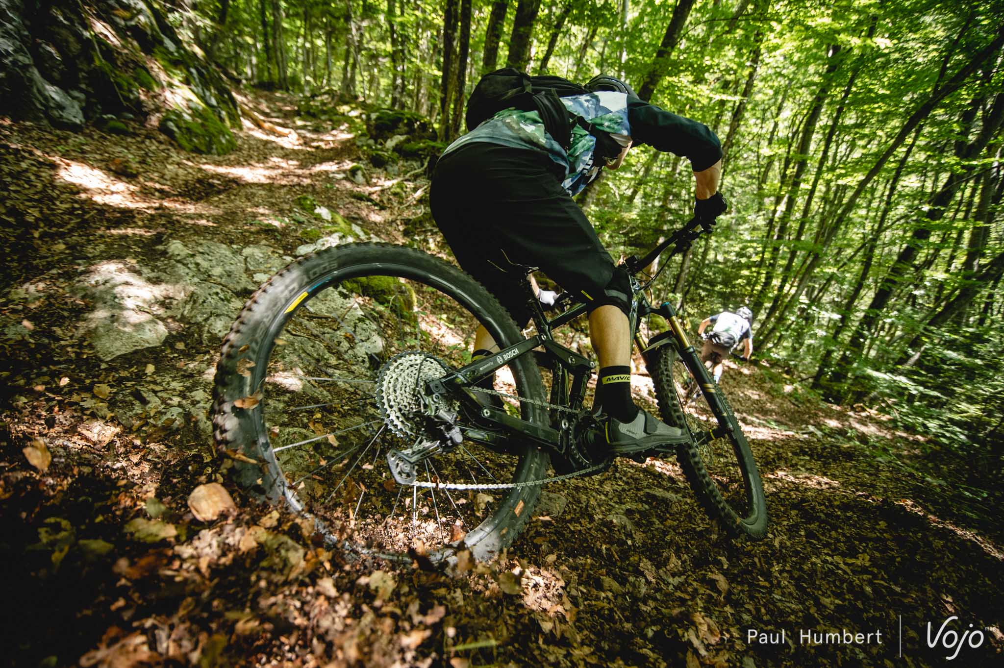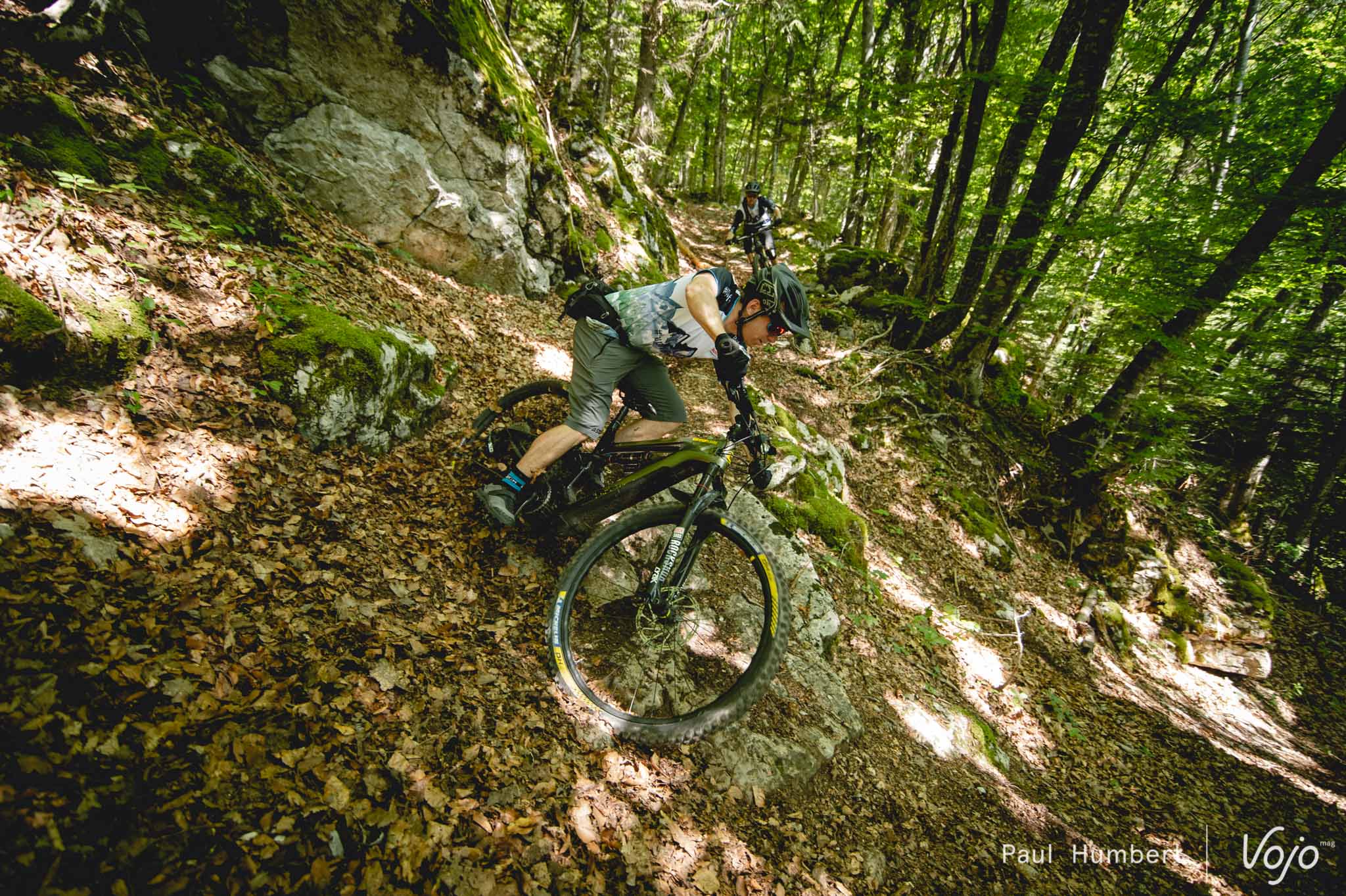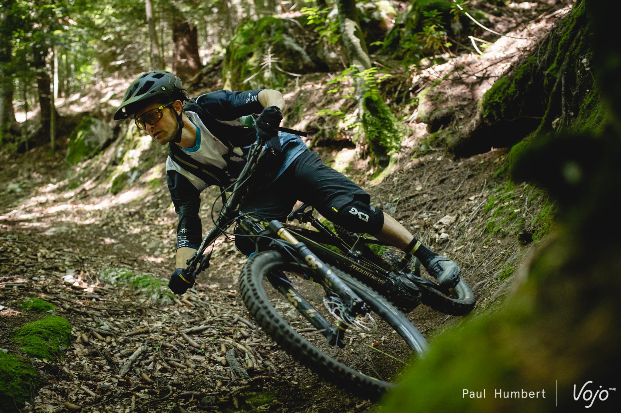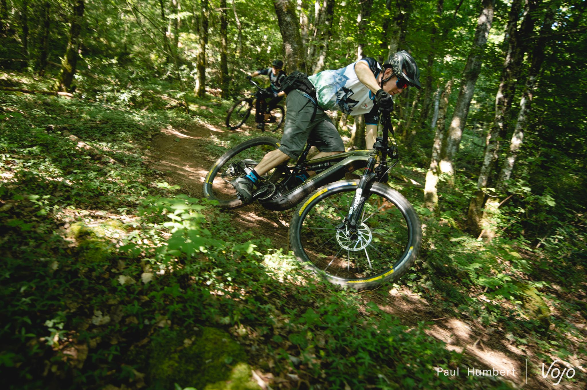 Ensuite, c’est Guillaume et Jérôme qui nous invitent à mettre des petits coups de pédale vifs, et là, on ressent très nettement la poussée de « l’extended boost ». On comprend l’idée de cet ajout au mode E-MTB mais ça en devient presque déroutant dans les passages techniques. Avant un champ de racine, on va mouliner à haute fréquence pour ensuite s’arrêter de pédaler pendant le franchissement : dans ce cas, le vélo nous accompagne ! Sur les petits franchissements, c’est agréable car ce petit coup de boost apporte du « liant » et du soutien, et on ressent moins la perte d’assistance. Sur les sections techniques les plus longues, c’est vraiment quelque chose à intégrer et il nous faudra encore quelques heures en selle pour bien dompter cette fonctionnalité.