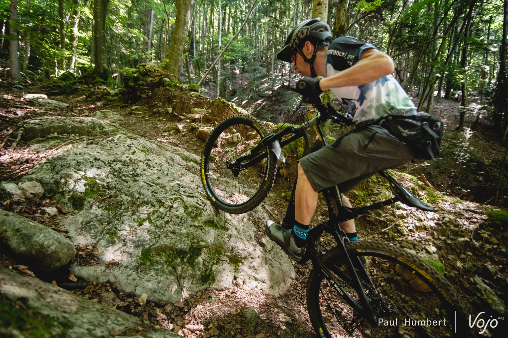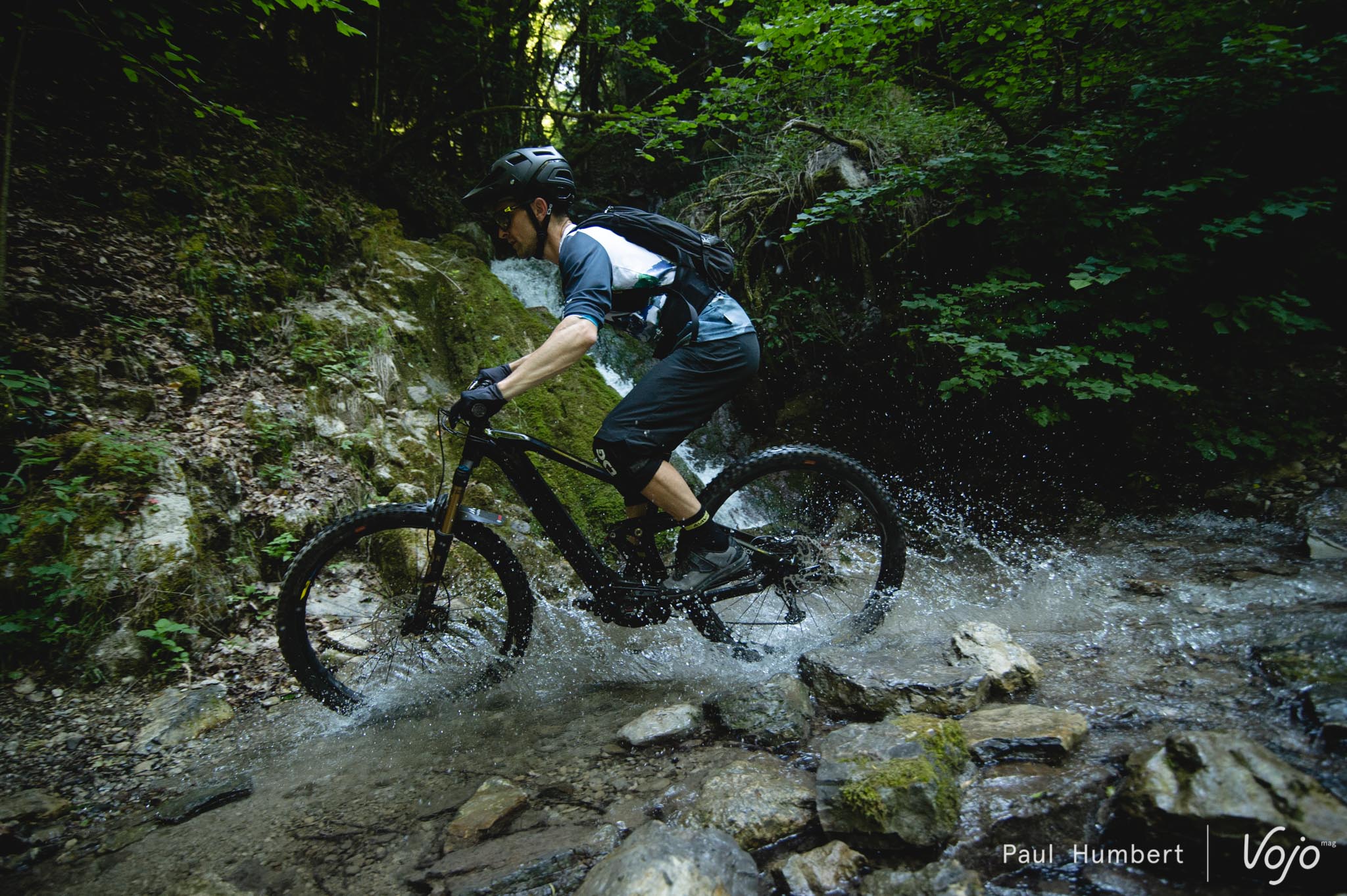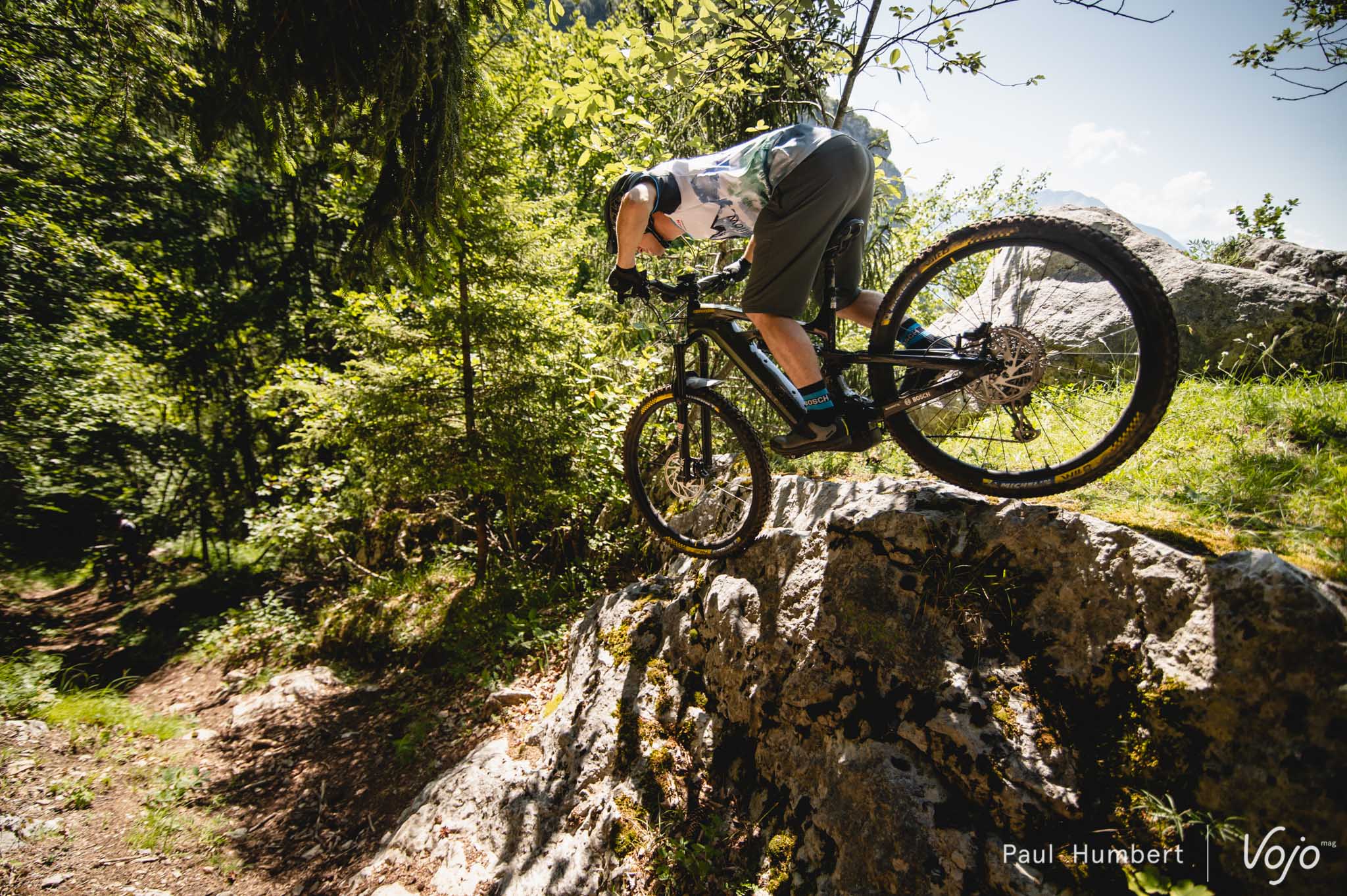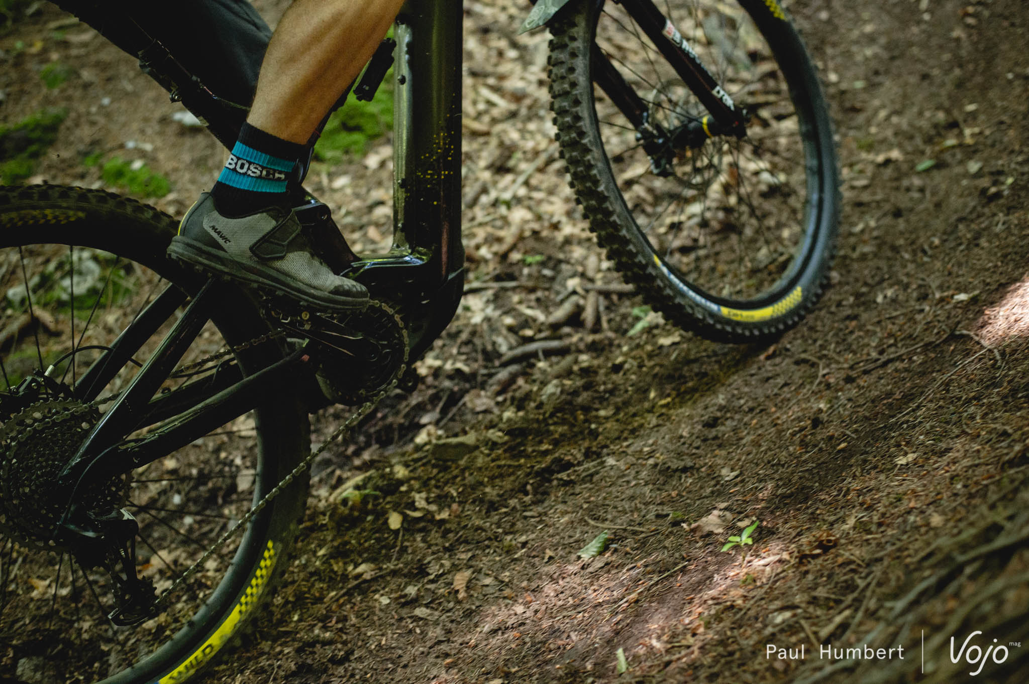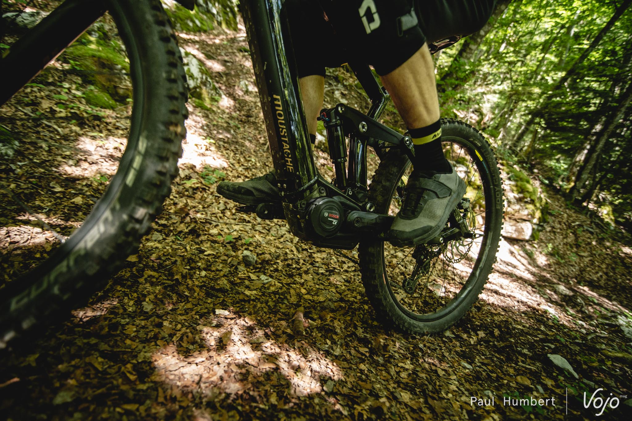 La suite de notre prise en main se déroule pendant la reconnaissance de notre parcours avec Guillaume. Avant un petit saut, on donne un coup de pédale vif et on est surpris par la poussée du vélo. Nouveau point qui nous fait « tiquer » : dans une portion technique, au moment de repartir, on appuie fort sur les pédales et le vélo lance son assistance bien plus vite que lors de nos précédentes expériences en vélo à moteur Bosch.