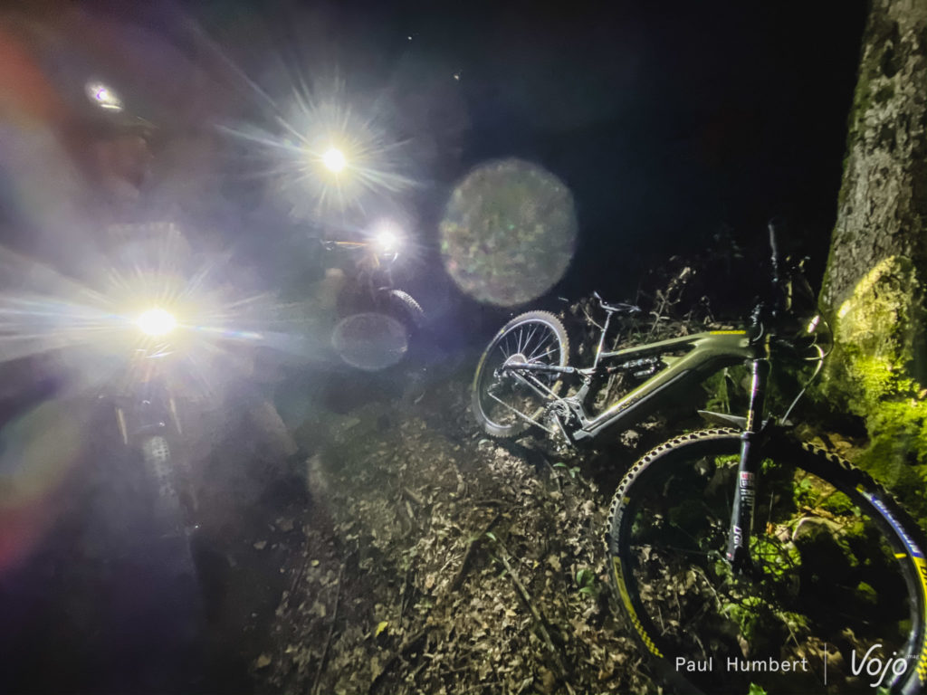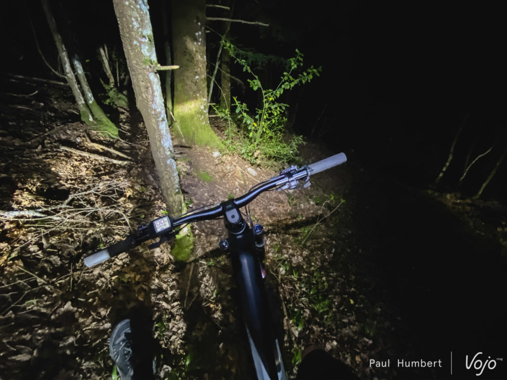 Le temps de cette prise en main, on a voulu se mettre dans plusieurs situations de pilotage, et la suivante se présente à la tombée de la nuit, juste après une tarte aux myrtilles : direction la descente, plein phares !