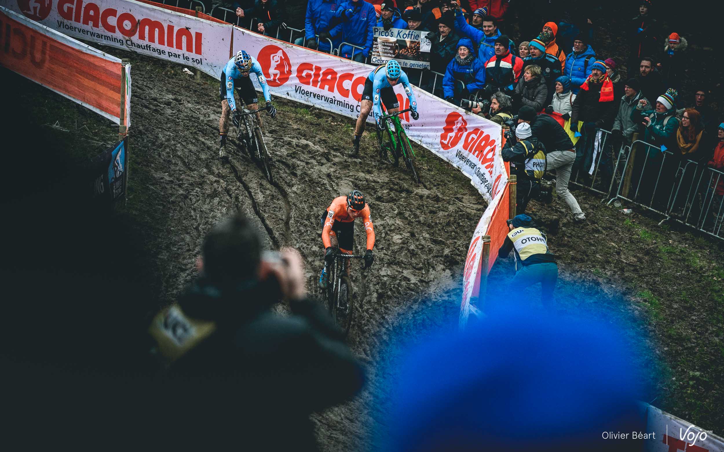 Les cris se font de plus en plus forts : voilà les coureurs, avec l’enfant du pays, le Néerlandais Mathieu van der Poel, qui pointe en tête devant le champion du Monde en titre, Wout van Aert. Visiblement, le duel de titans que tout le monde attend va bien avoir lieu !